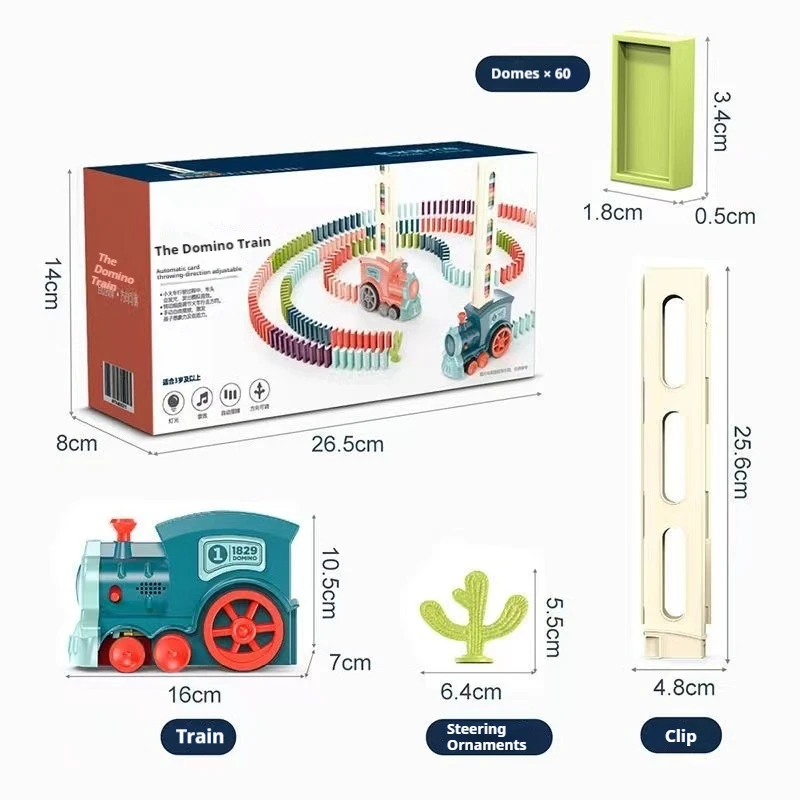 · Turn on the electric train toy, it will move at a constant speed and automatic put down the dominoes, each domino is 1.5cm away.