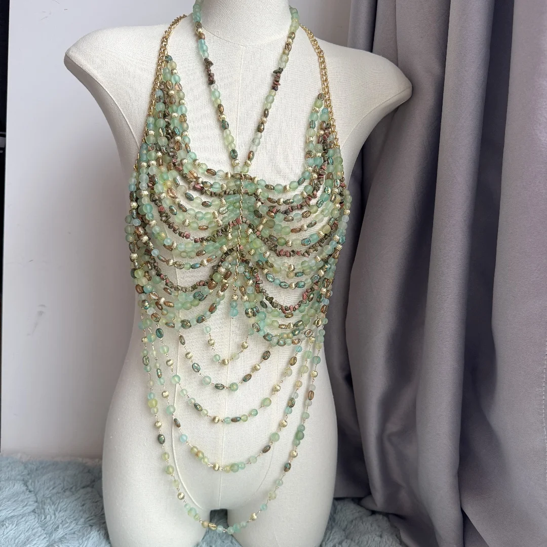 Ladies Body Chain Beading Camisole Vest Hollow Out Top Body Jewelry Exaggerated Pearl Neck Bustier Fashion Bra Women Club Rave