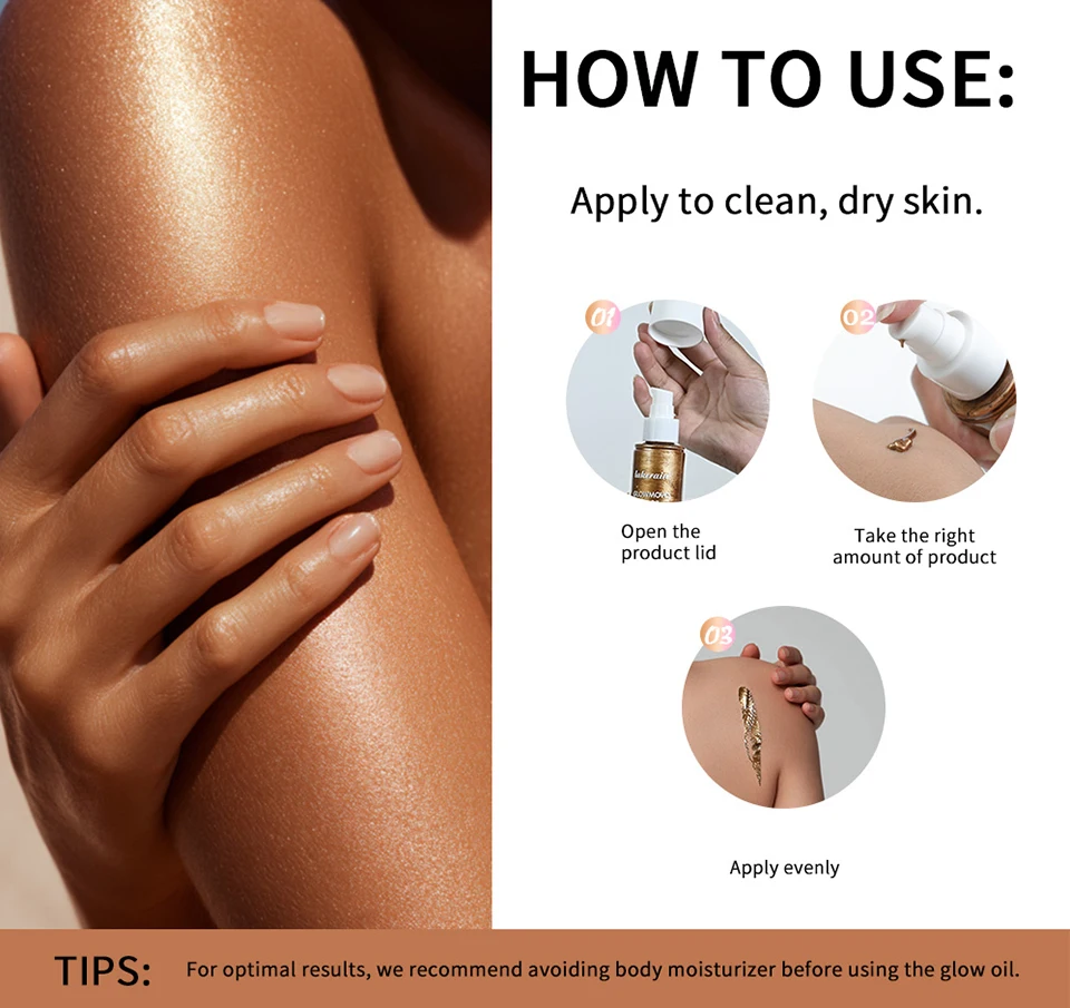 1. It can bring warmth and sunshine like luster to various skin tones, and can be used to brighten and highlight body parts, creating a beach like healthy body contour;
