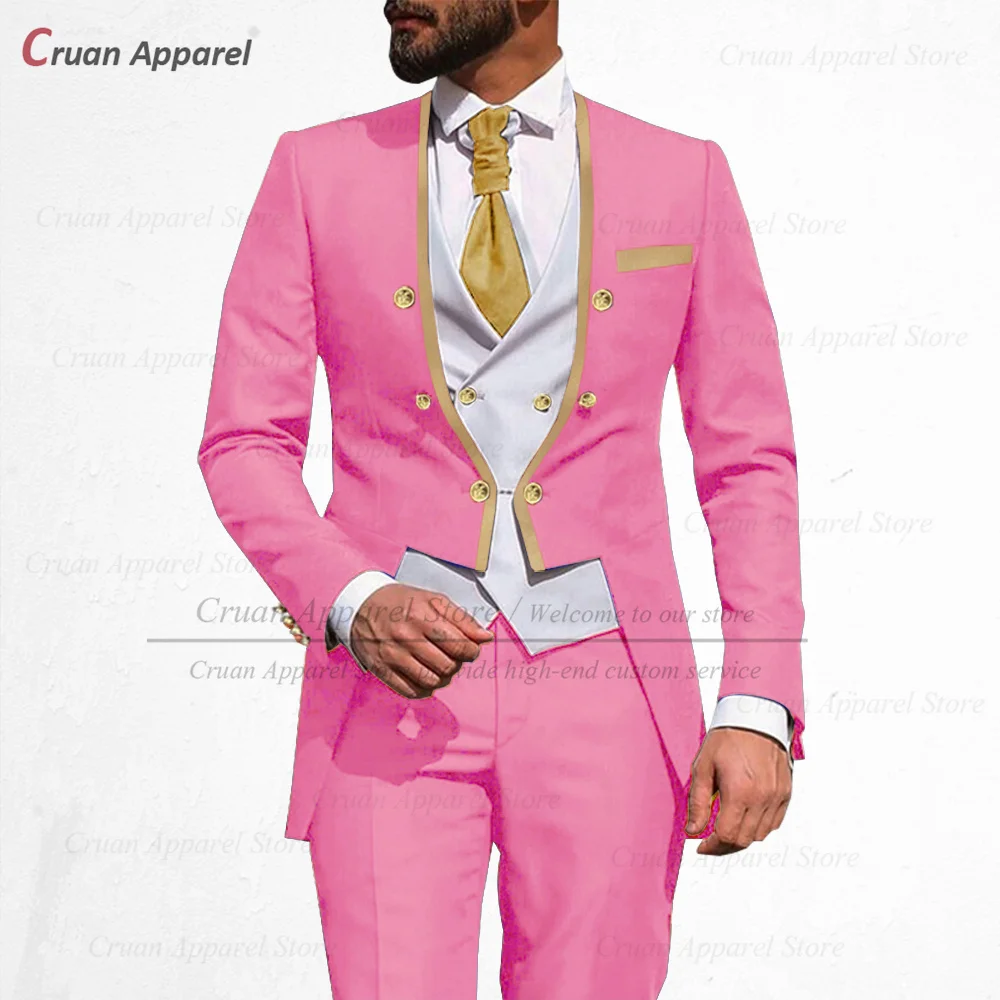Latest Royal Blue Suit Men 3Pcs Slim Fit Wedding Best Man Groom Tuxedo Double Breasted Gold Trim Jacket Vest Pants Set Tailcoat