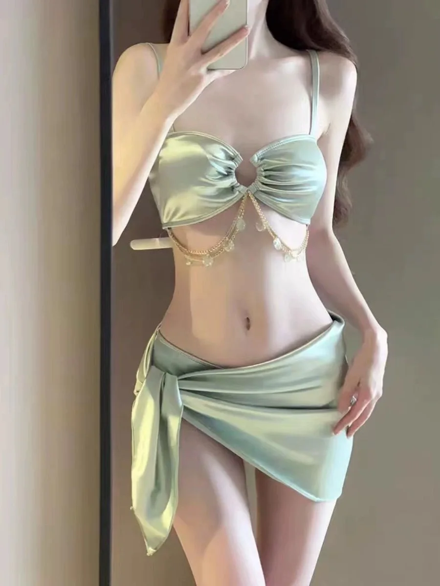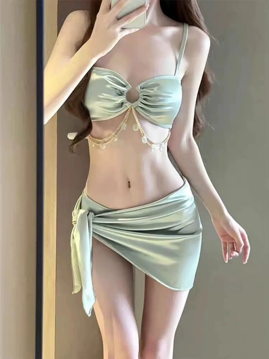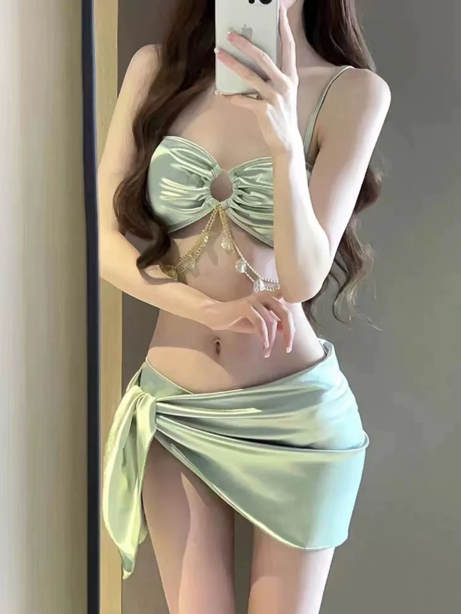 Light Green 3 Piece Swimsuit for Women,2024 New Solid Color Chain Bikini Set,summer Beach Vacation Skirt Swimwear Bathing Suit