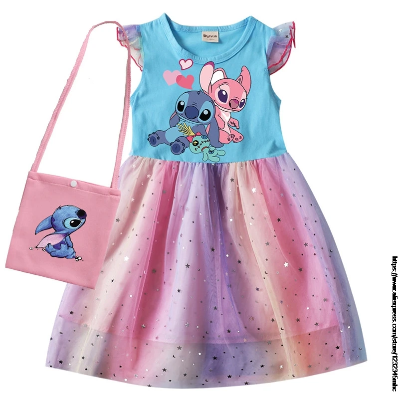 Lilo And Stitch Summer Girls Cotton T Shirt Patchwork Dress +Bag Children Girl Home Party Casual Clothes Dresses