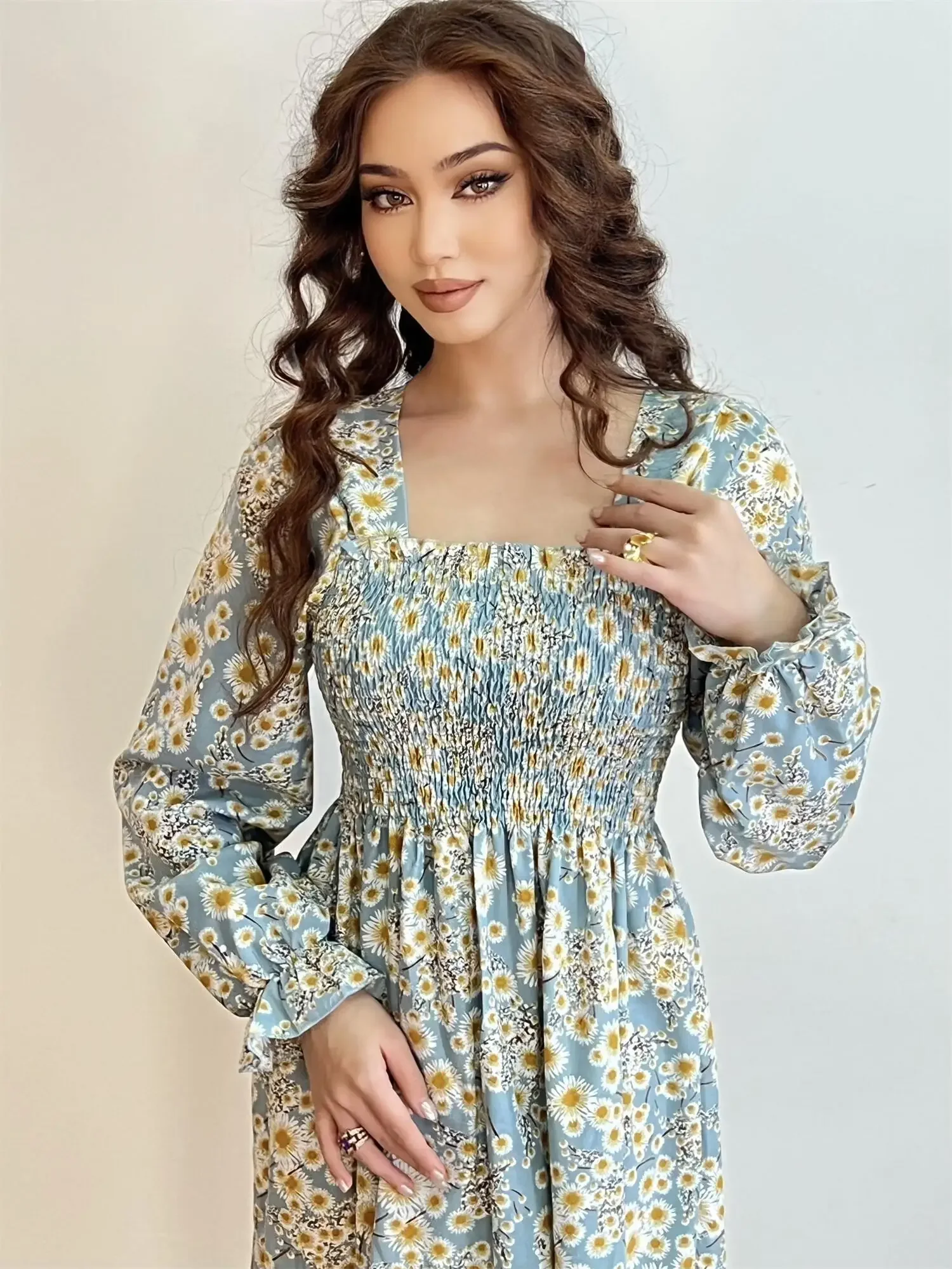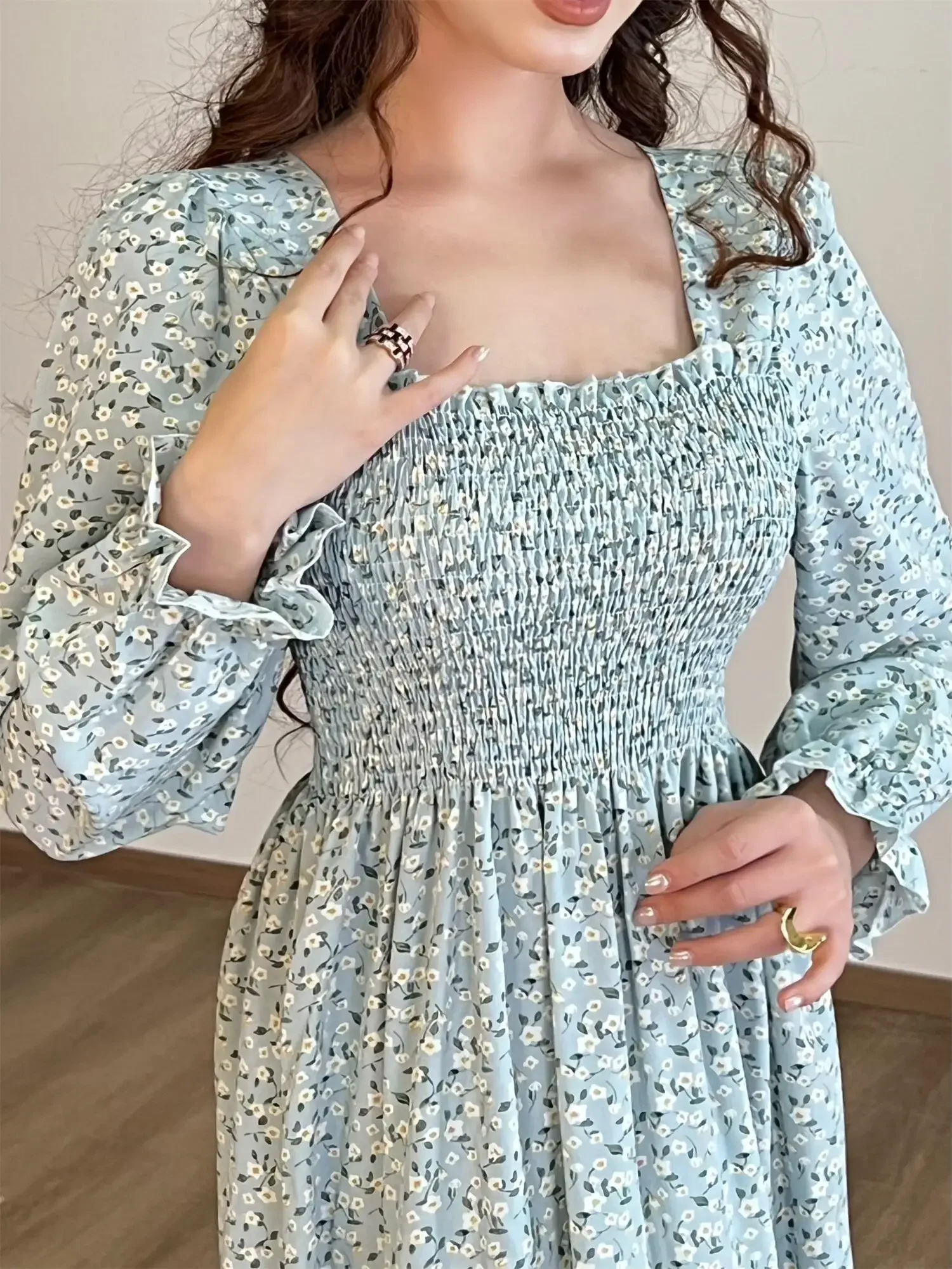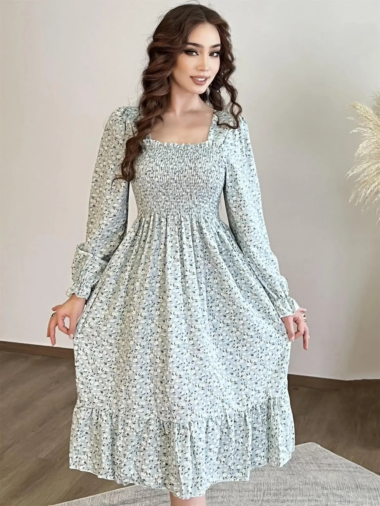 Long Sleeve Casual Dress Women Chiffon Dresses Autumn Spring A-line Printed Floral Elastic Chest Lace Up Midi Dresses Vestidos