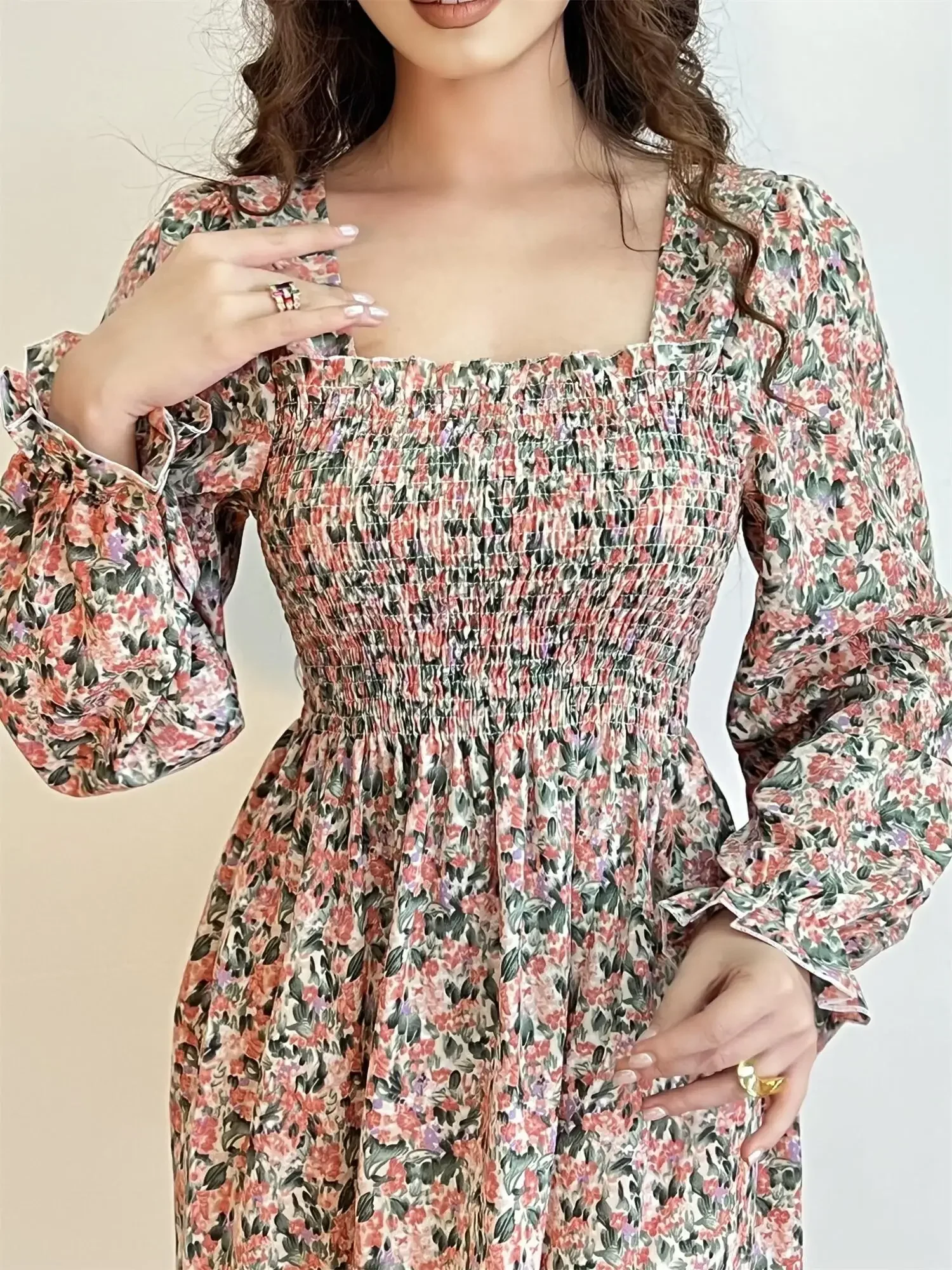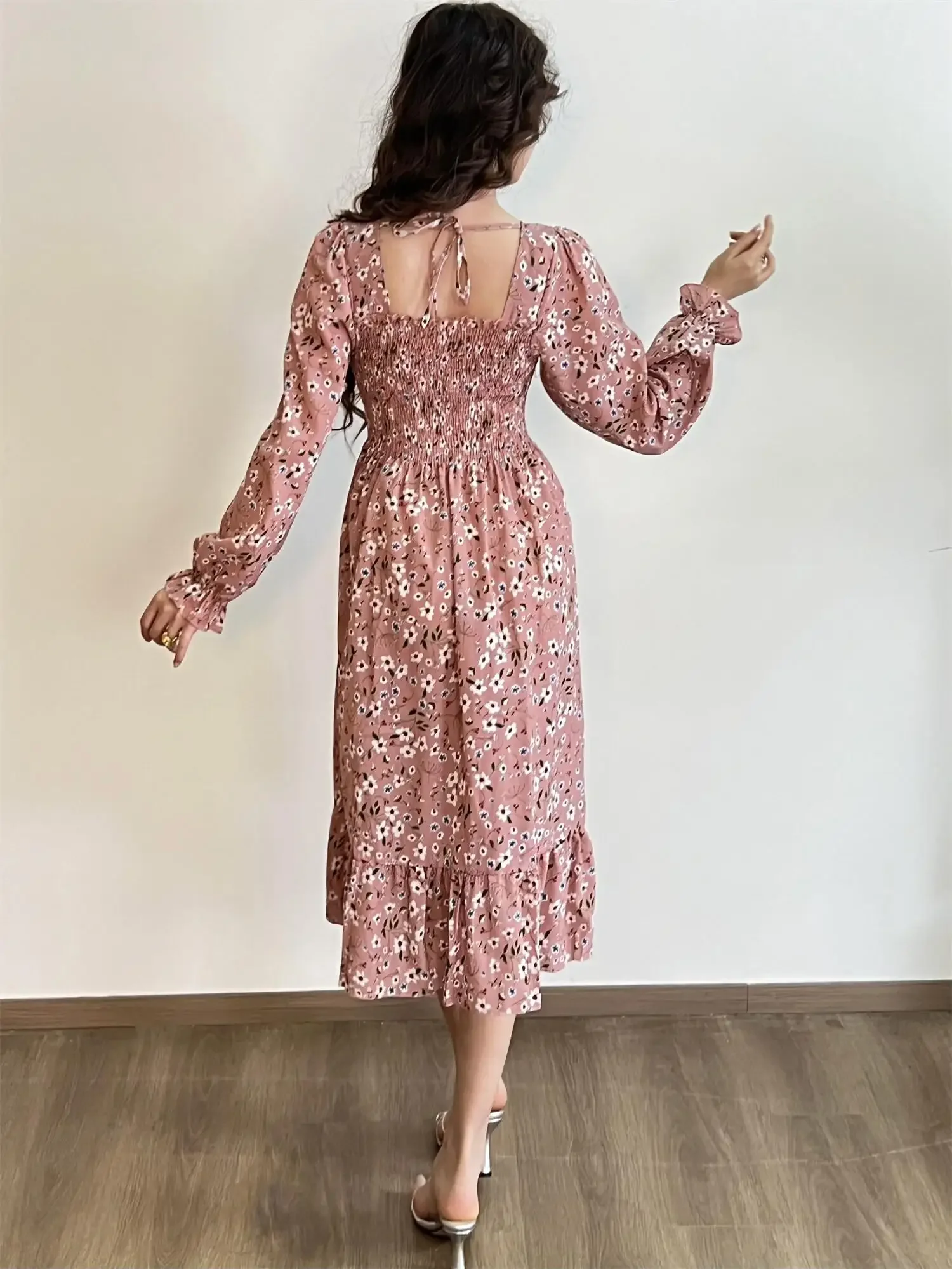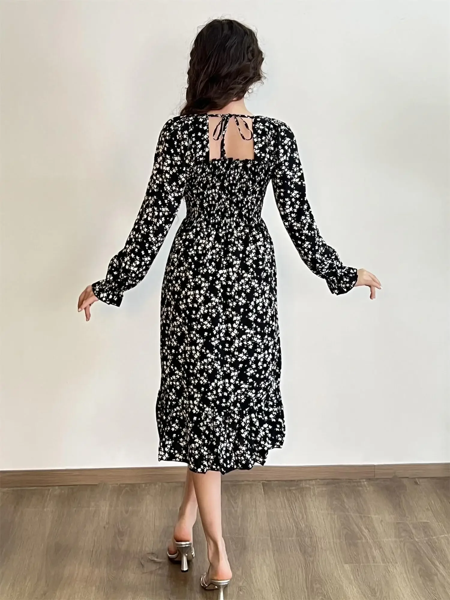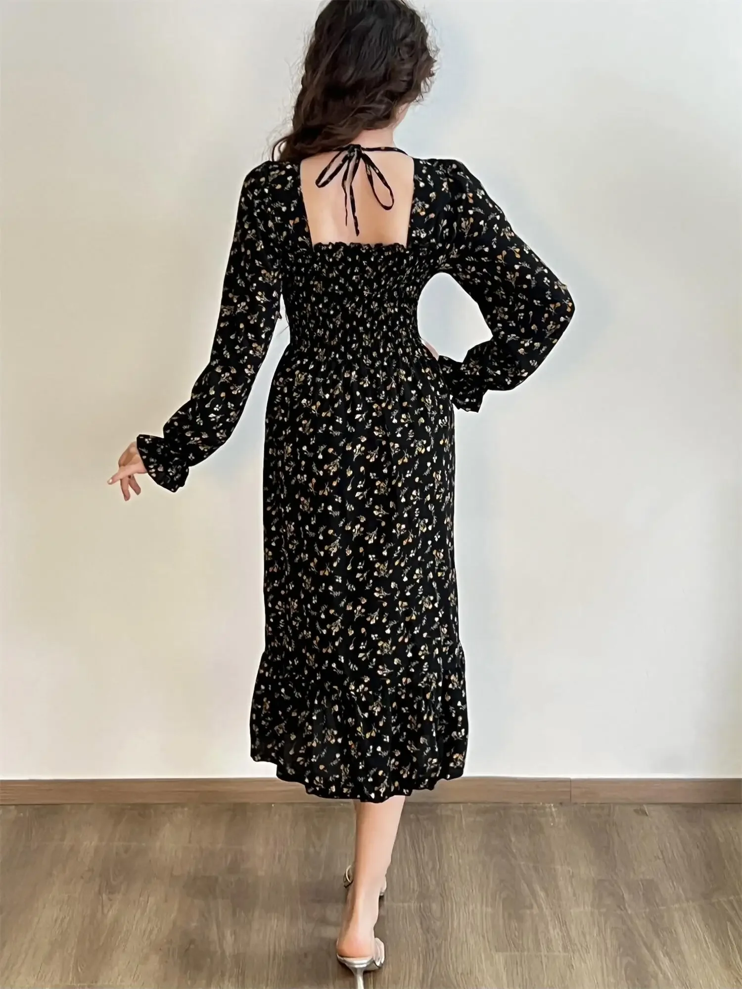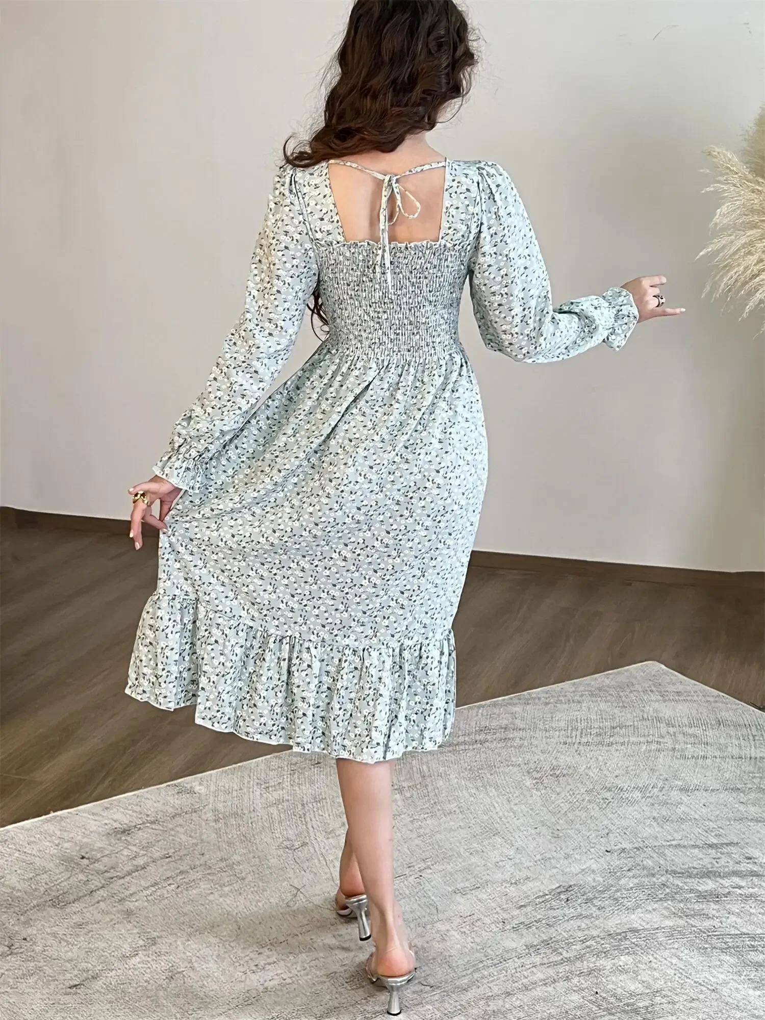 Be the first to review “Long Sleeve Casual Dress Women Chiffon Dresses Autumn Spring A-line Printed Floral Elastic Chest Lace Up Midi Dresses Vestidos”