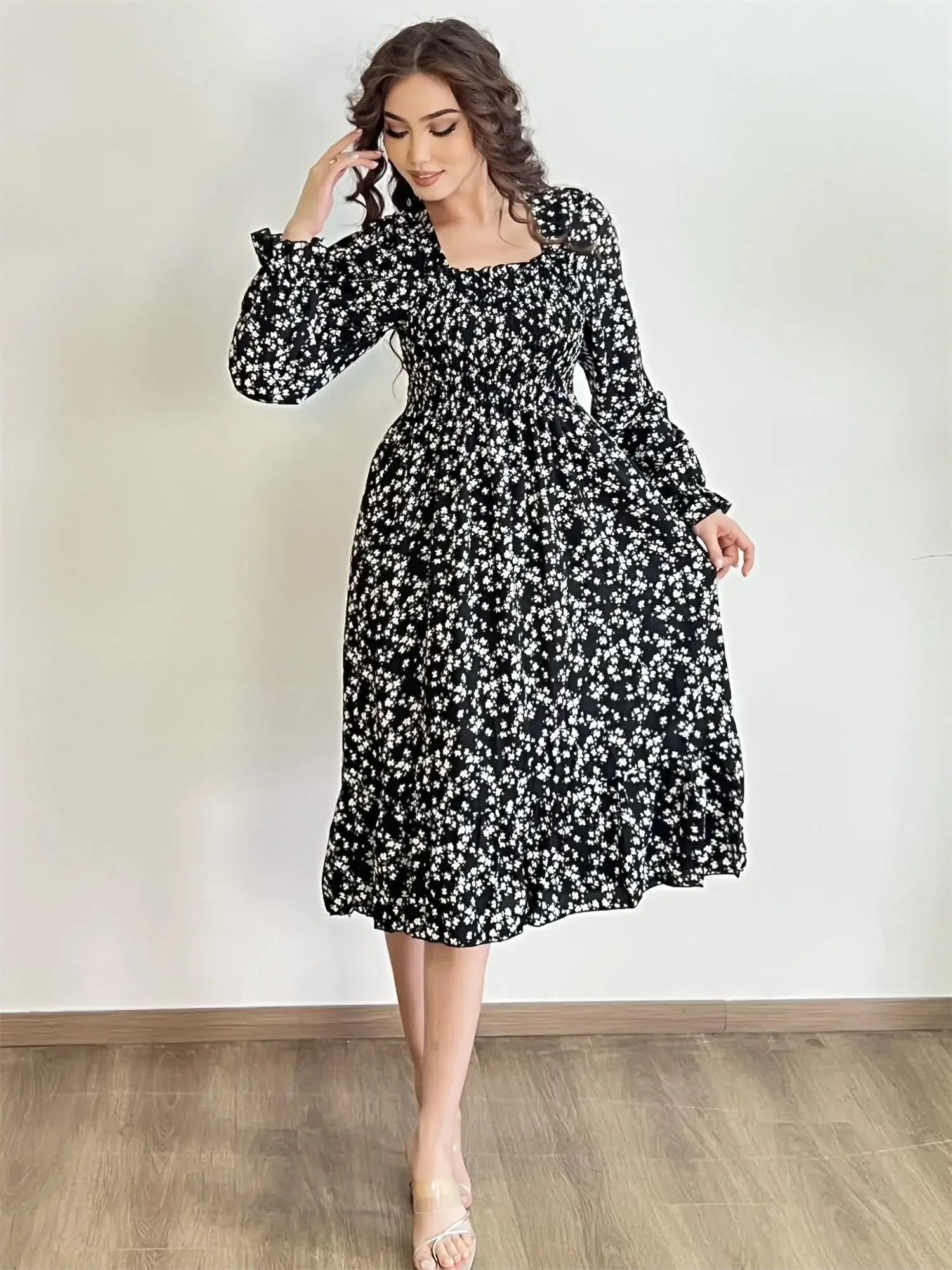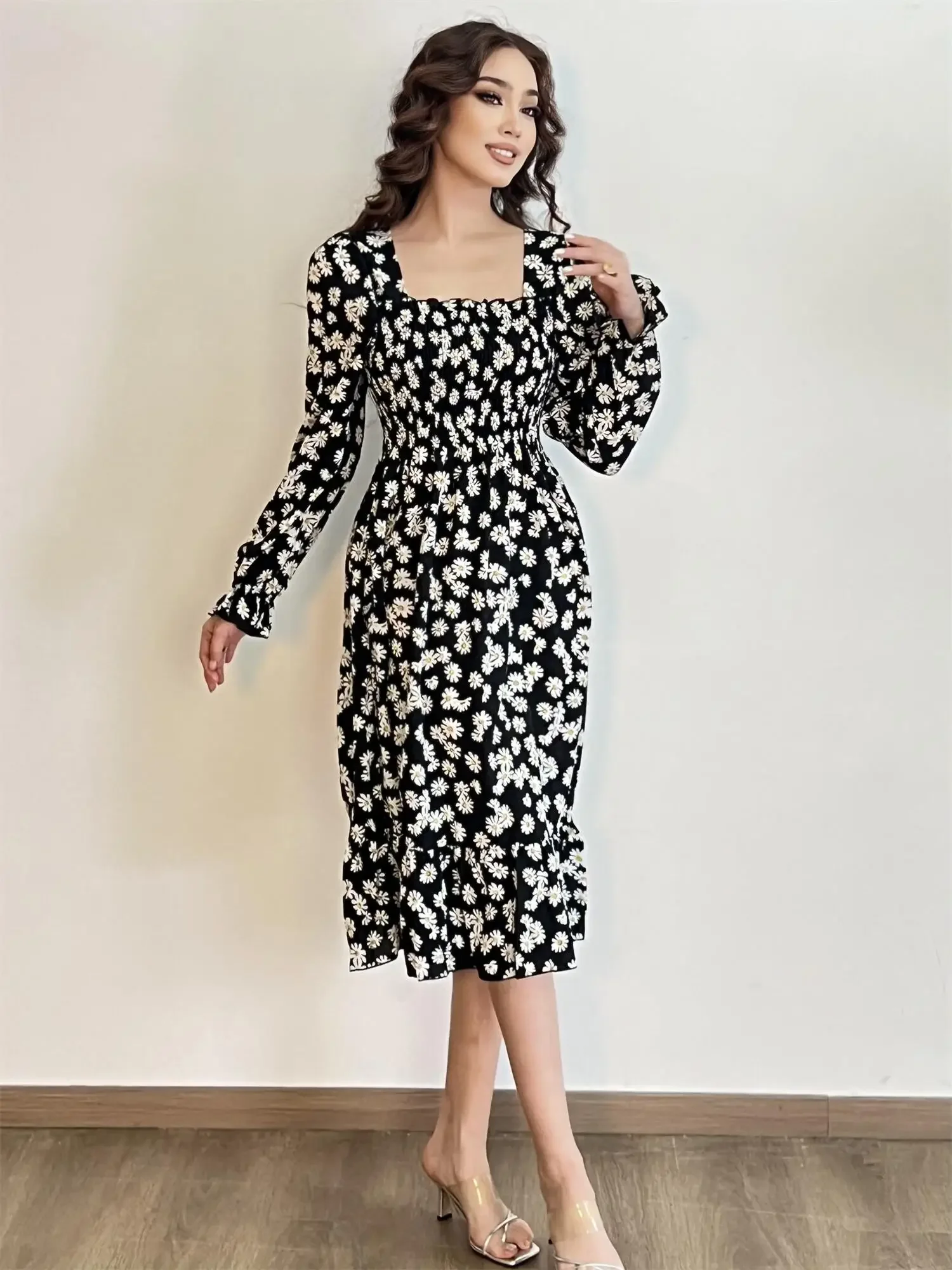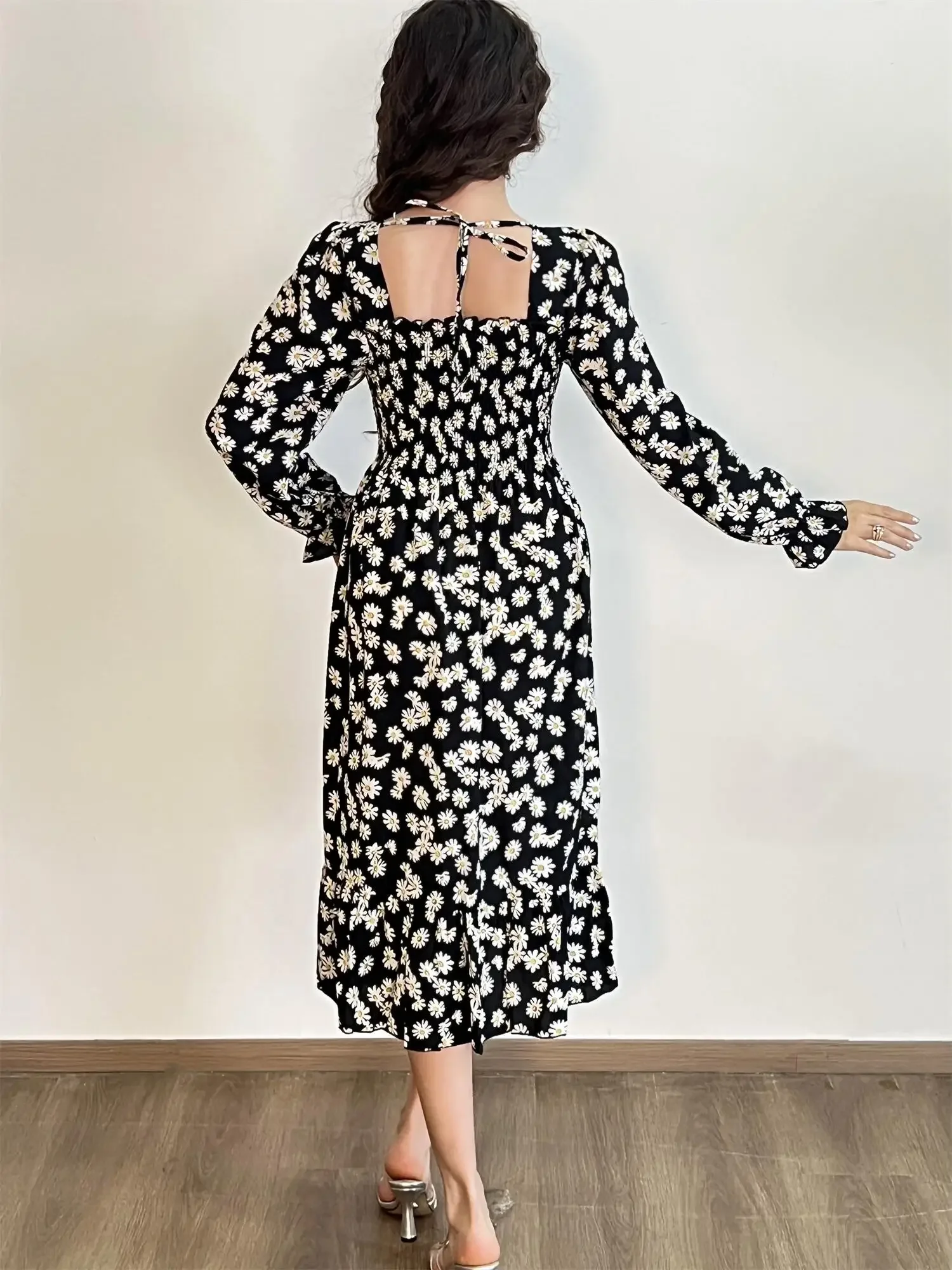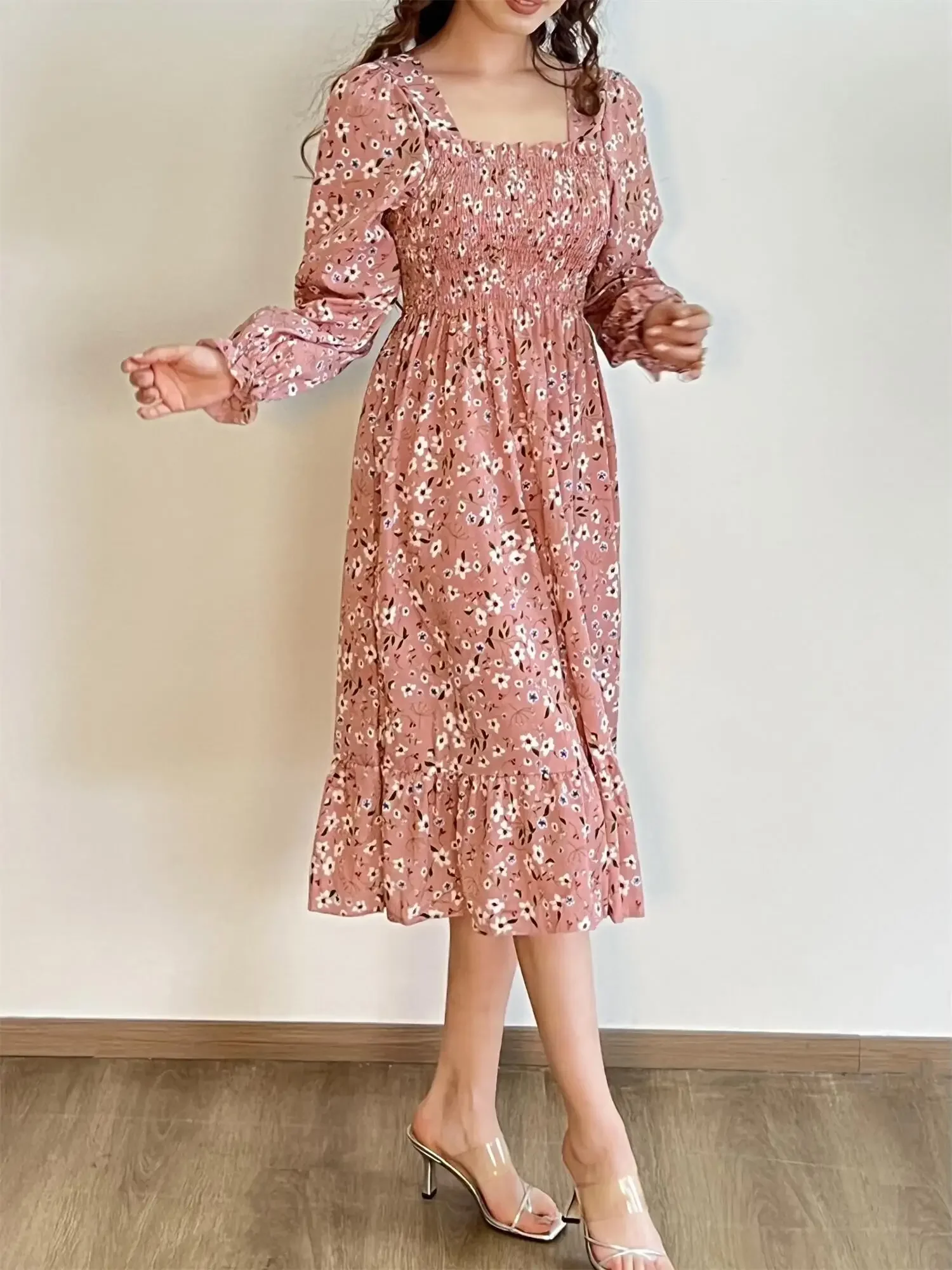 Be the first to review “Long Sleeve Casual Dress Women Chiffon Dresses Autumn Spring A-line Printed Floral Elastic Chest Lace Up Midi Dresses Vestidos”