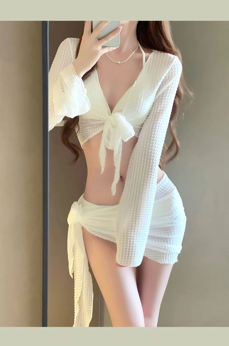 Long Sleeve Knitted Swimwear 4 Piece Set Feminine Push Up Chest Bikini Set Gathering Beach Vacation Bathing Suit for Women