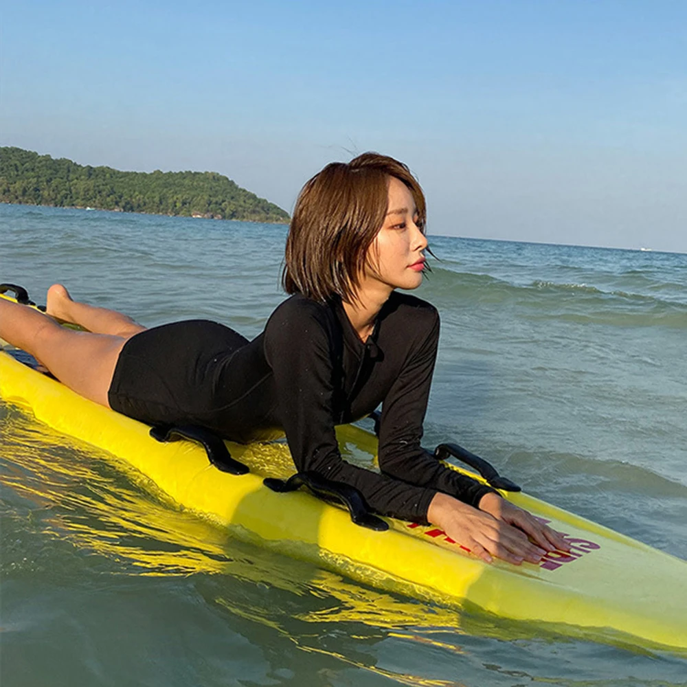 Long Sleeve Rash Guard Women Zipper One Piece Swimsuit Solid Swimwear Black Surfing Suit High Neck Diving Suit
