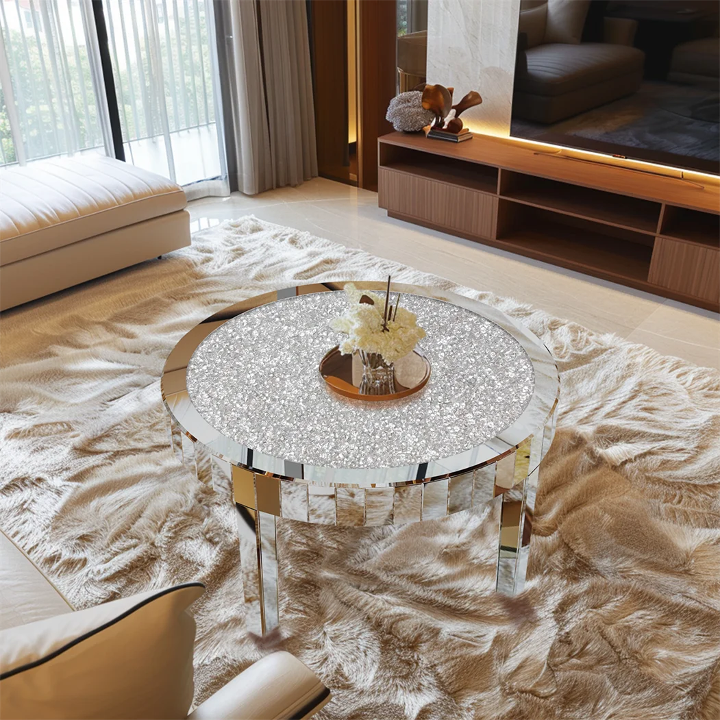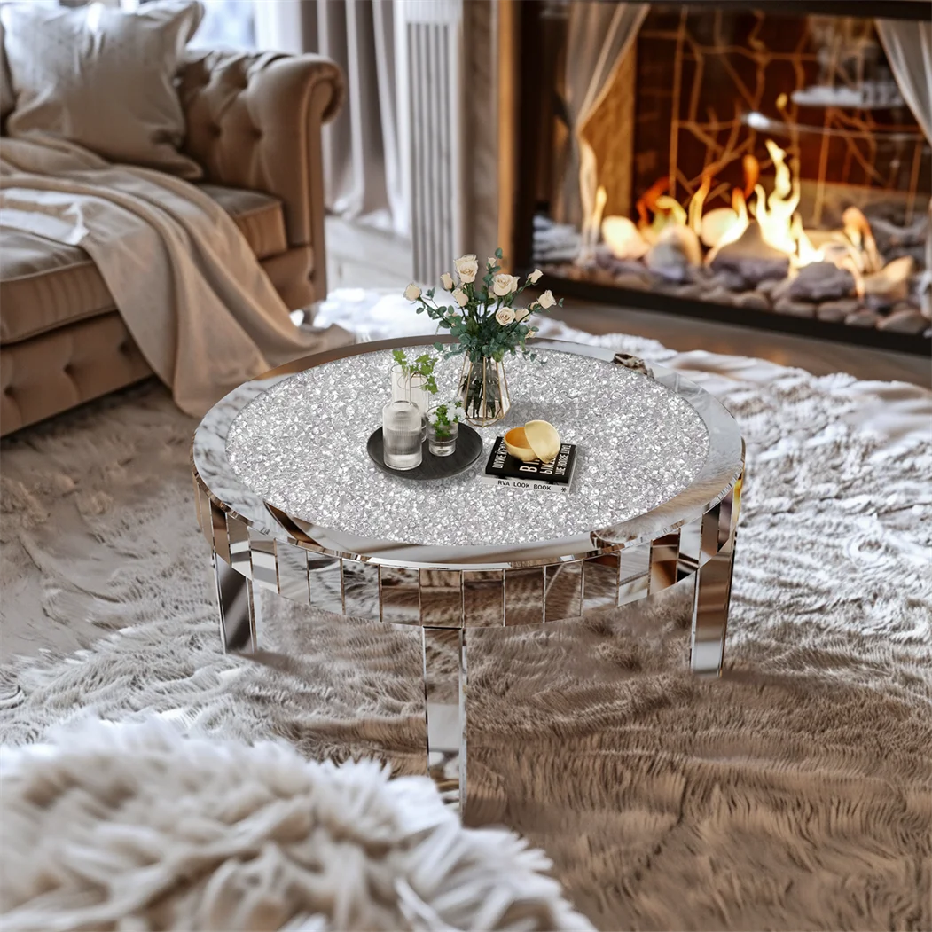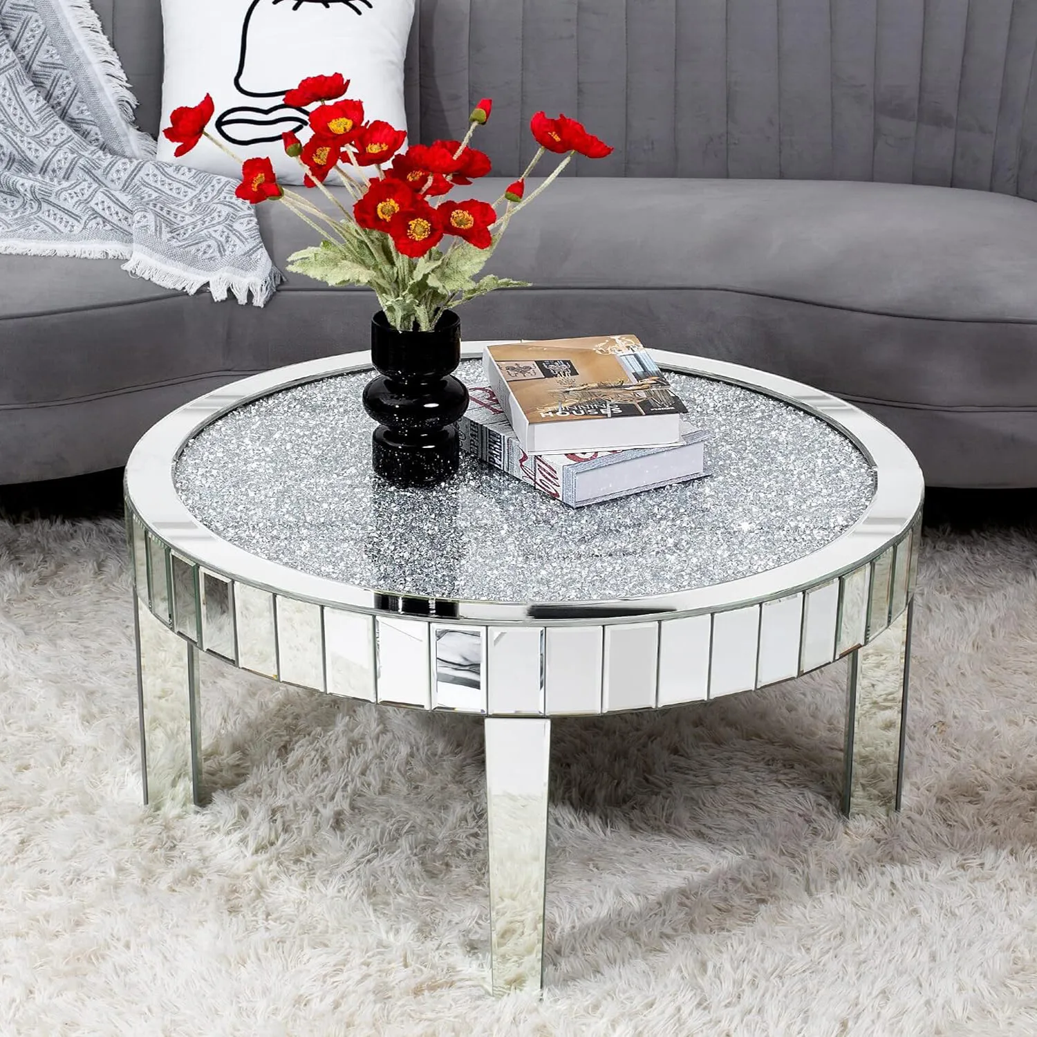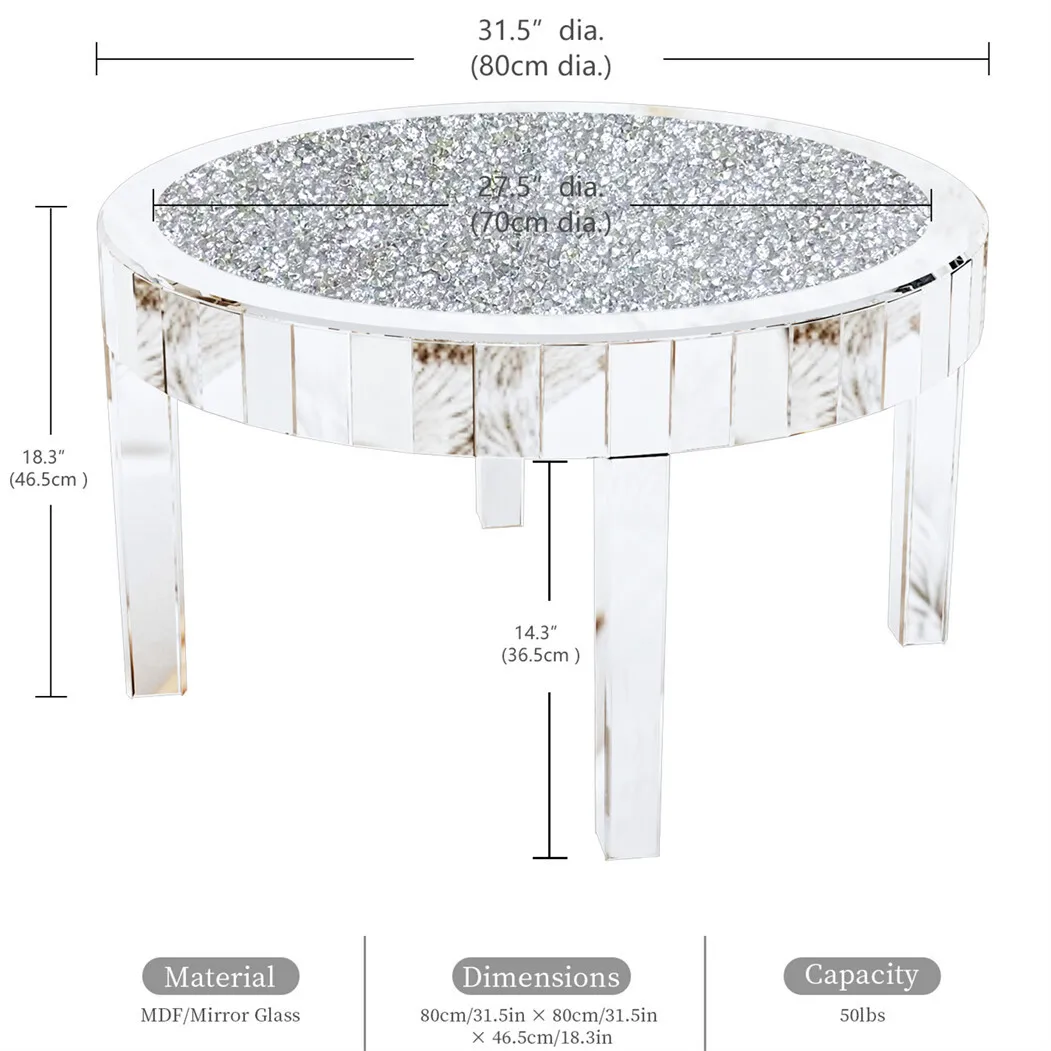 Luxury Coffee Table 80CM Round Mirrored Center Table with Crystal Diamonds, Inlay Accent Side Table for Living Room, Bedroom