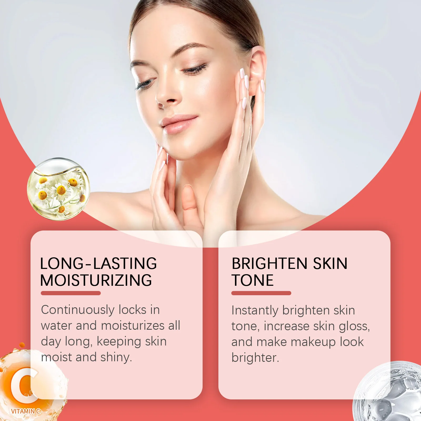 1. Long term moisturizing continuously locks in moisture, moisturizes throughout the day, keeps the skin moist and radiant, instantly brightens the skin tone, increases skin radiance, and makes the makeup look brighter.