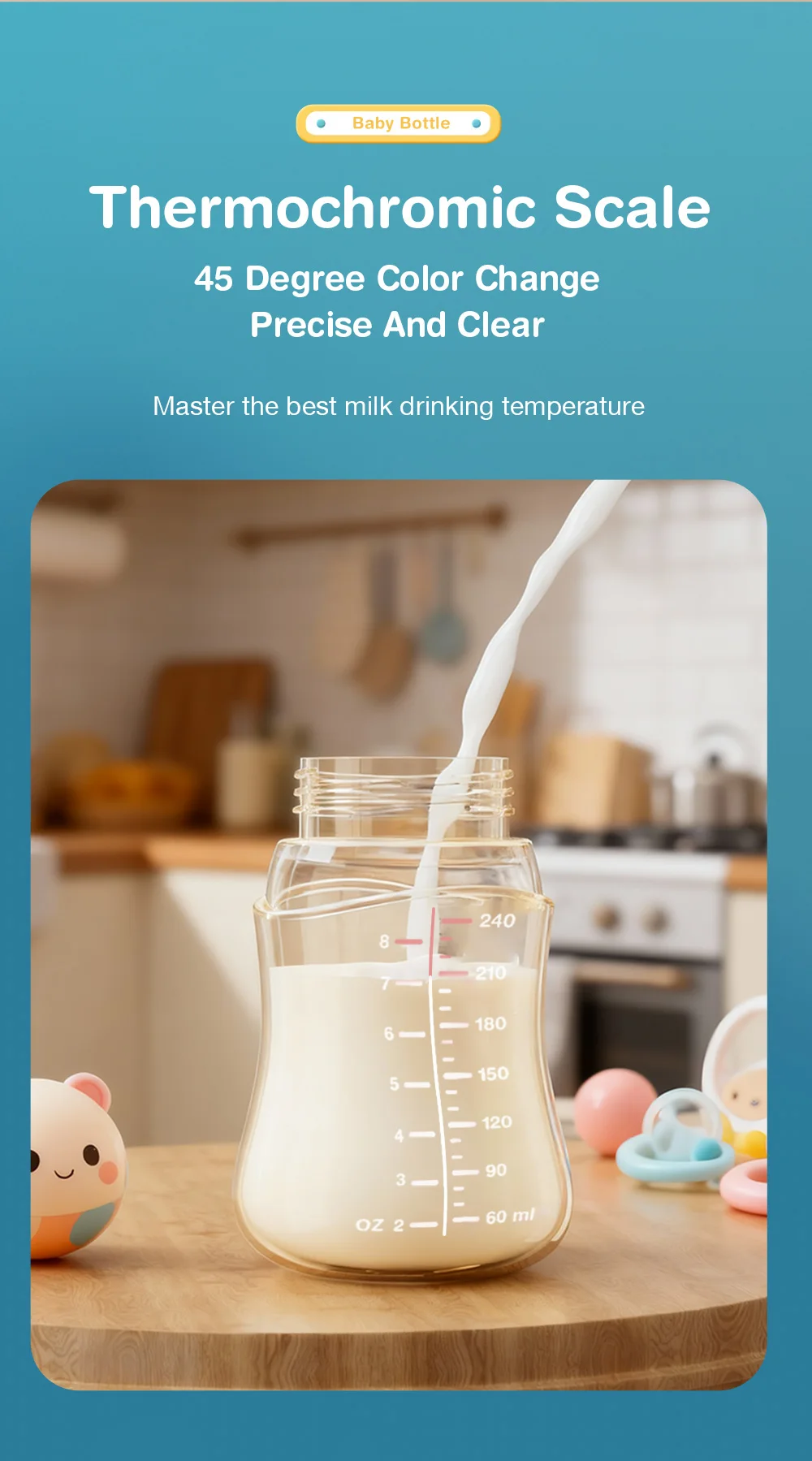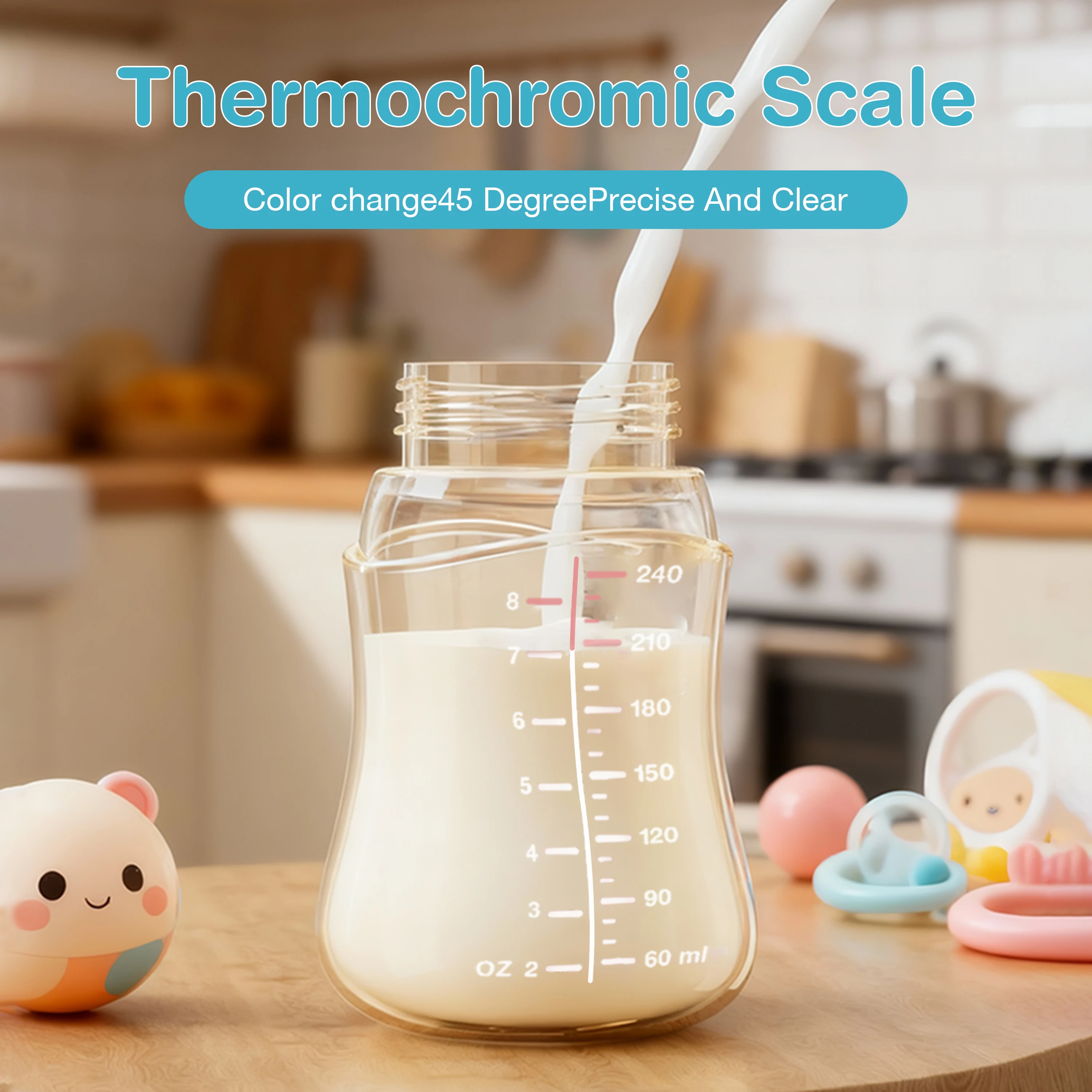 Temperature-sensitive color-changing safety reminder, the scale bar changes according to temperature (light red if <45°C, white if >45°C), so the feeding temperature is clearly visible at a glance.