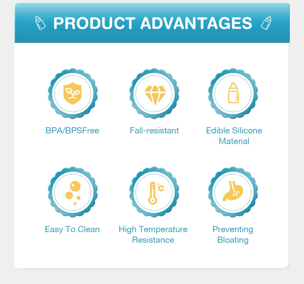 9. The silicone dot spout is soft, highly elastic, tear-resistant, and feels like mother’s skin. This dot is soft, strong, and resistant to biting and tearing.