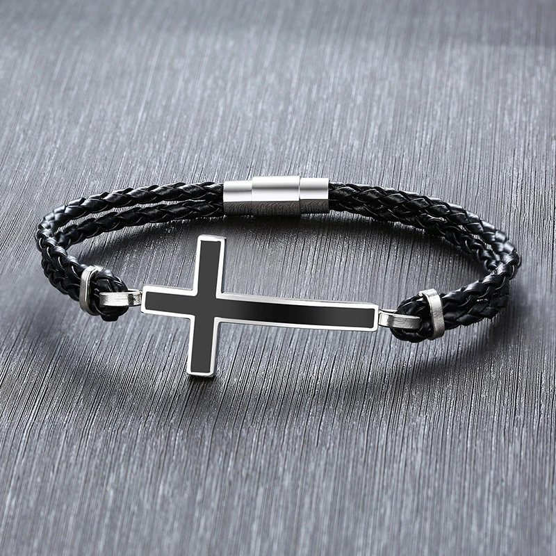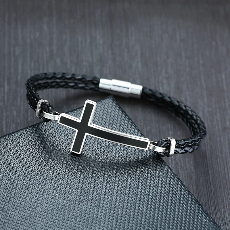Men Gifts Casual Sideways Cross Charm Black Braided Leather Rope Women Bracelets male Bangles Prayer Gifts Jewelry free shipping