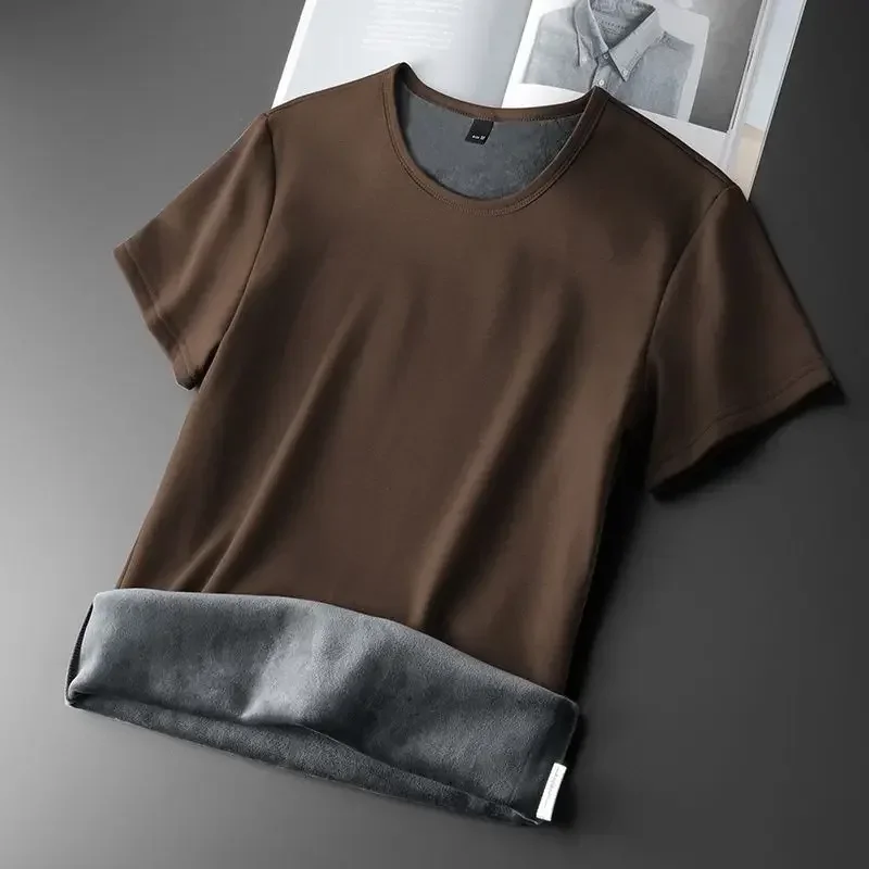 Men Thermal Underwear T-shirt Fleece Thickened Short Sleeve Slim Round Neck Bottom Shirt Velvet Comfortable Top