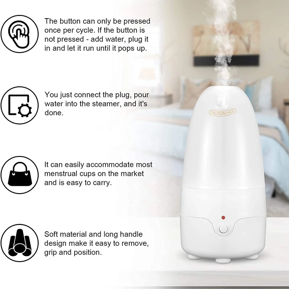 Menstrual Cup Steamer Sterilizer Cleaner – Wash Your Cup + Kill 99.9% of Germs with Cleanser Steam – 3 Minutes and Your Period Cup is Sterile! Automatic Timing Shut Off Switch (White)