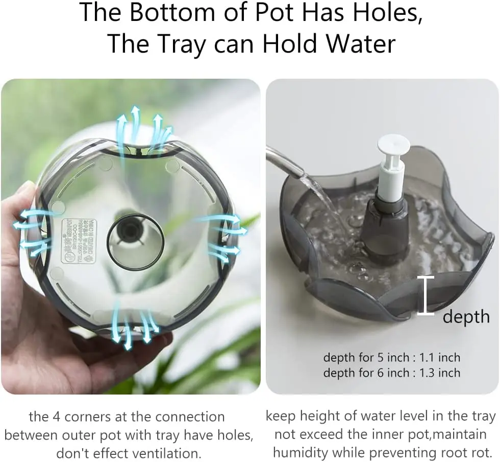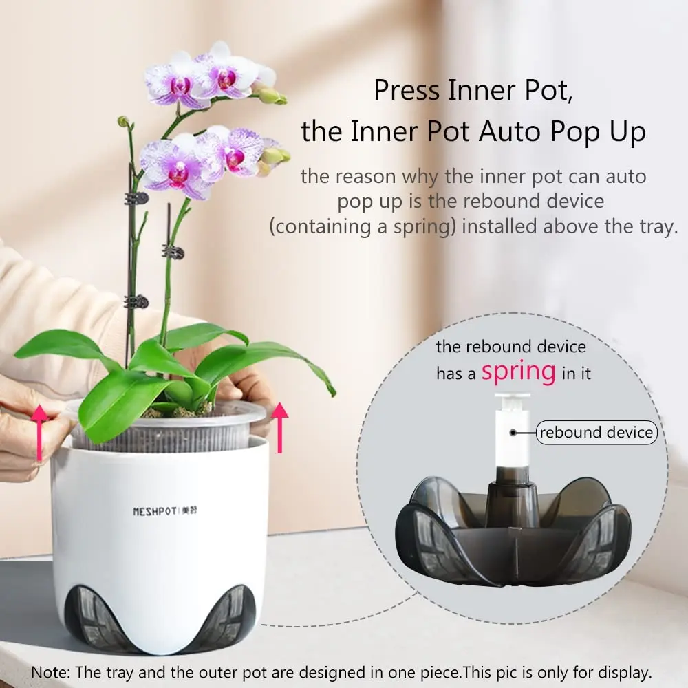 The Tray with Rebound Device Make Taking Out Inner Pot Easier,Convenient To Observe Root Growth — the tray is installed with a rebound device, gently press the inner pot, the inner pot will automatically pop up,taking out the inner pot directly to observe the root growth.