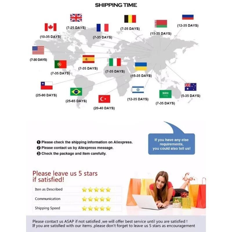 6.The expected delivery date will be affected by customs, weather etc., sometimes it may take a little longer to receive,Please contact us when you have not received the package to extend your order protection time.