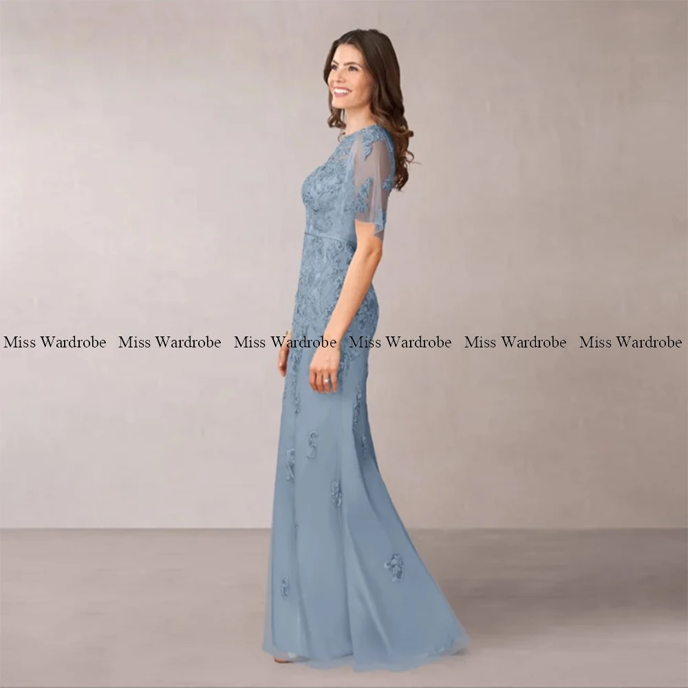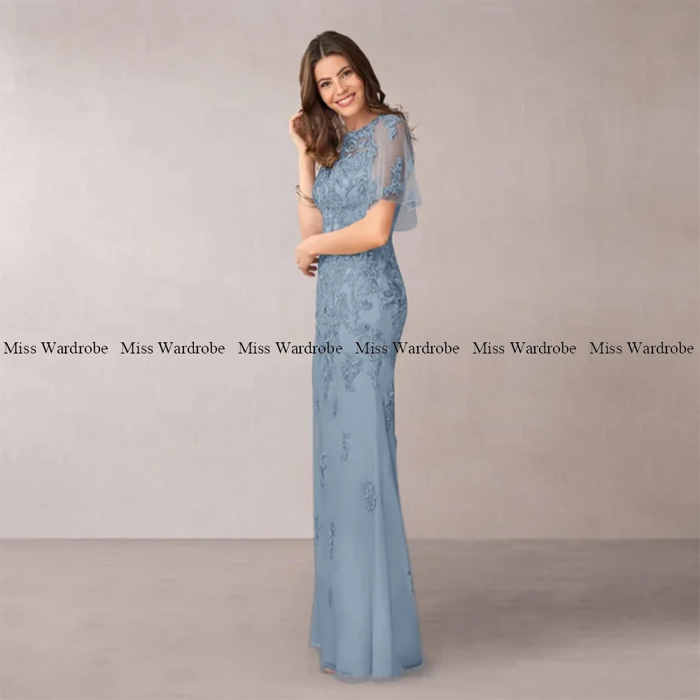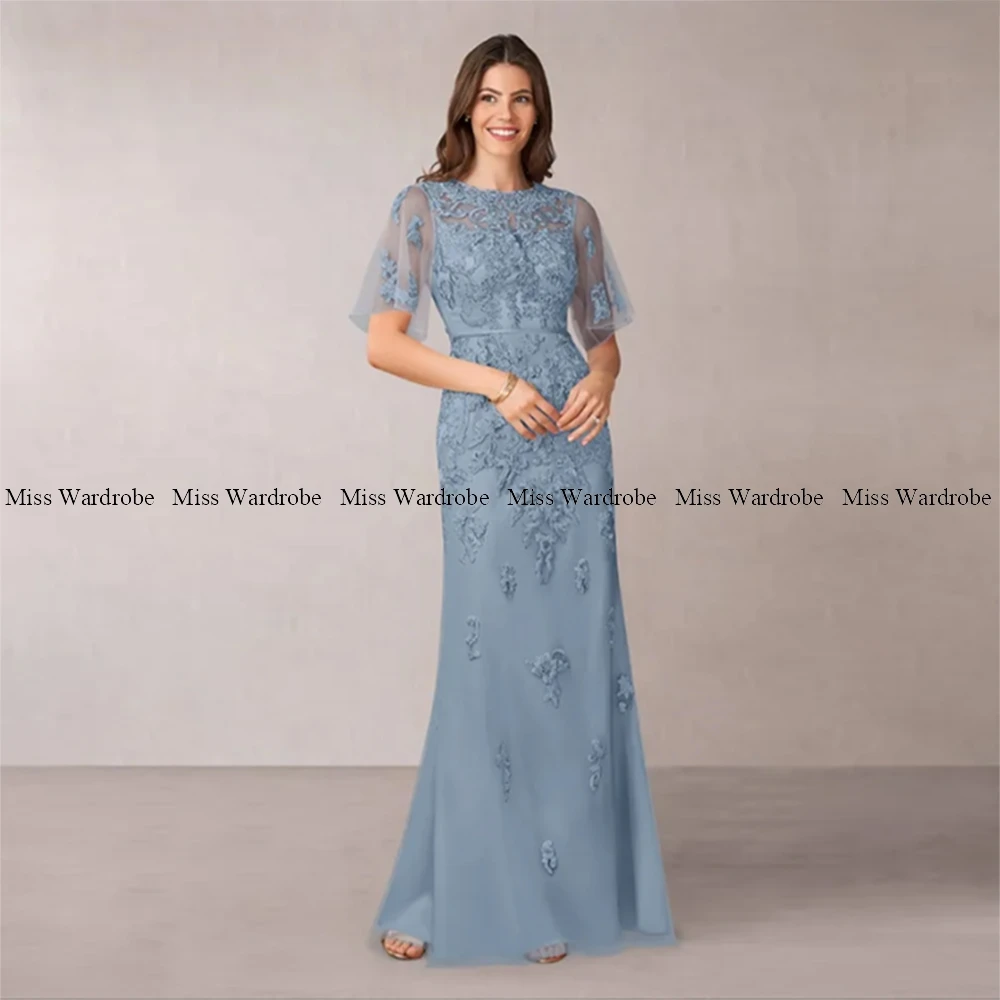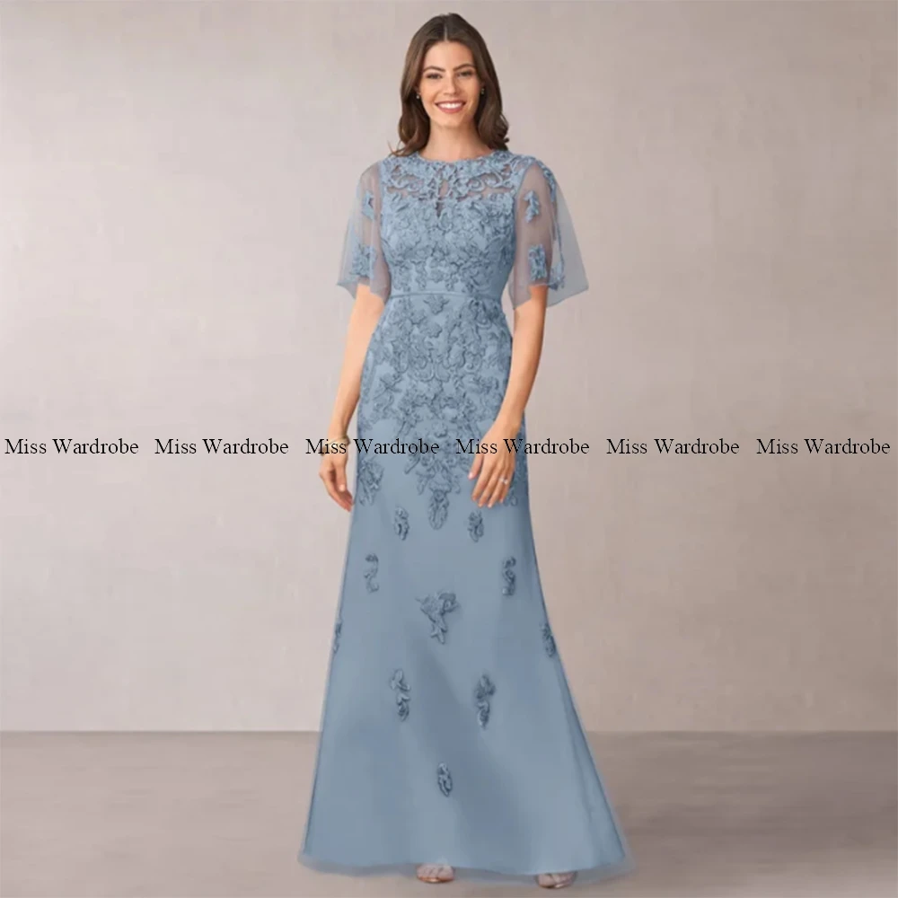 Mother Of The Bride Blue Dresses Floor Length Tulle Applique Short Sleeve Long For Weddings Formal Party Gown Elegant Customze
