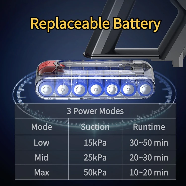 3 Suction Modes: Choose from three adjustable suction levels to suit different cleaning needs, from light dusting to heavy-duty cleaning.