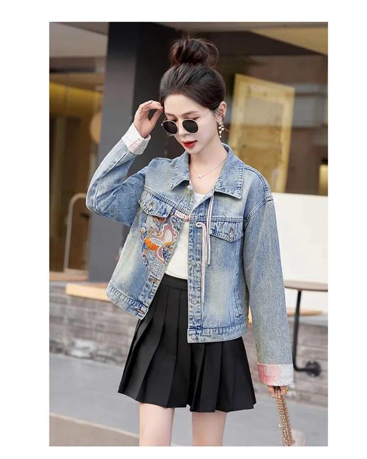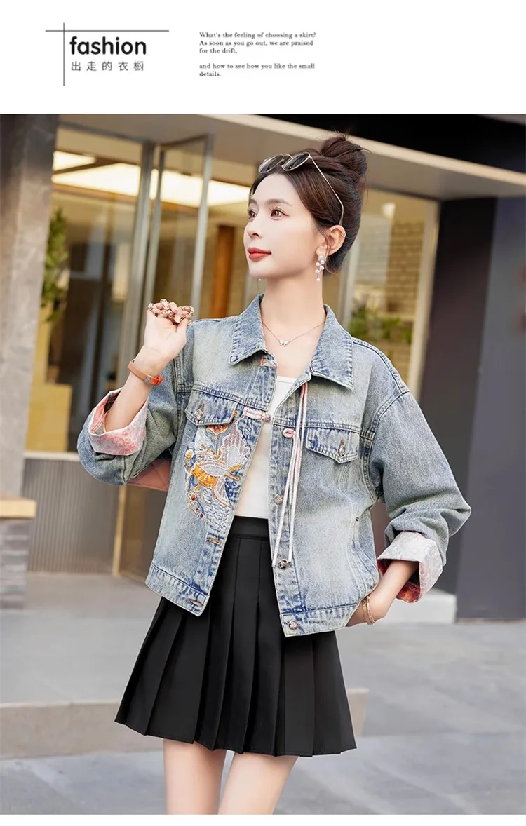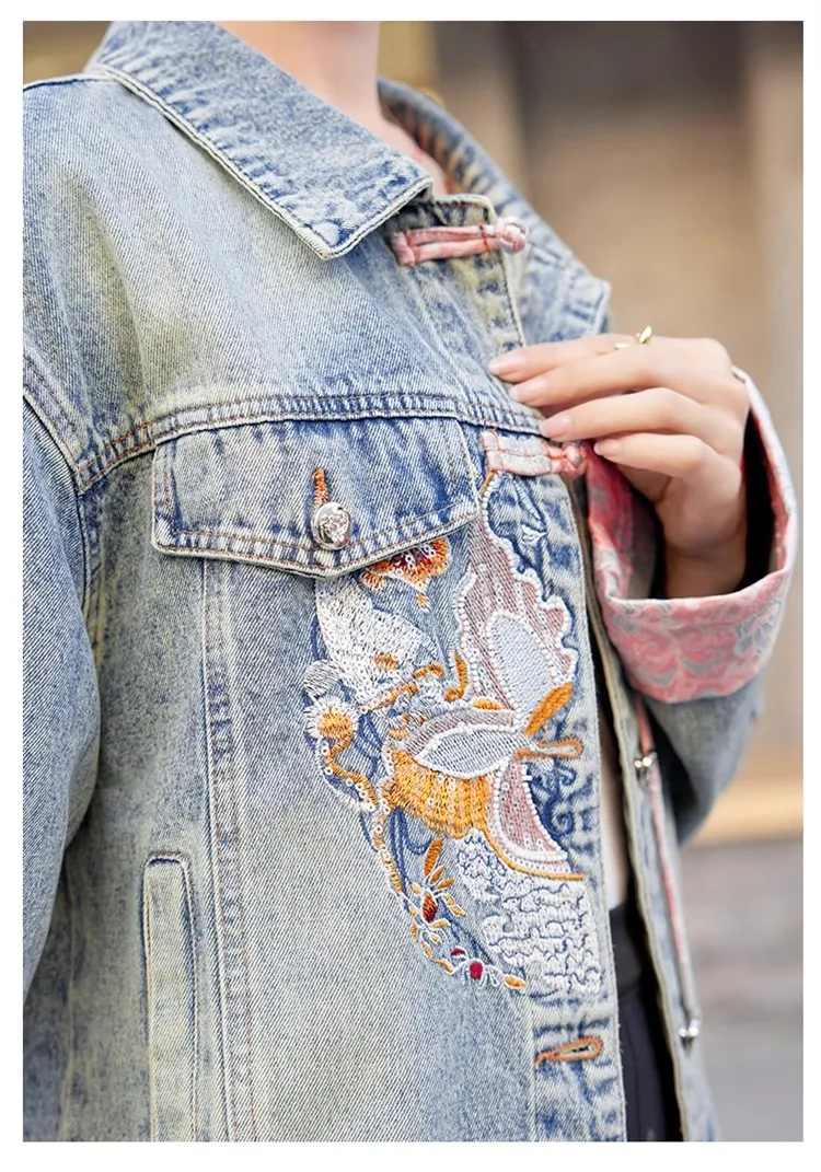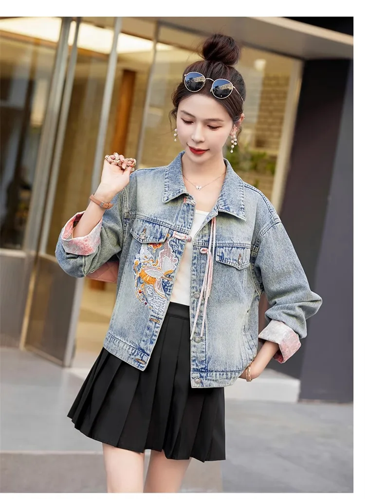 New 2024 Spring Women Denim Jacket And Coat Chinese Style Long Sleeve Embroidery Chinese Buttons Elegant Outwear Woman Jackets