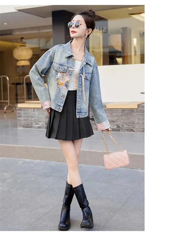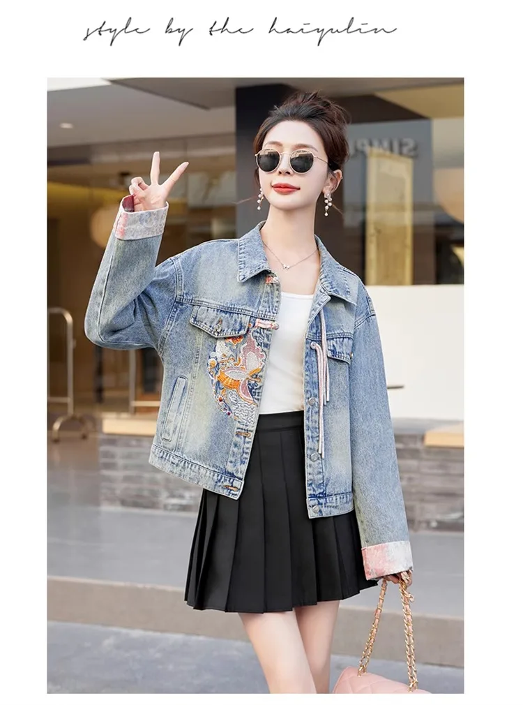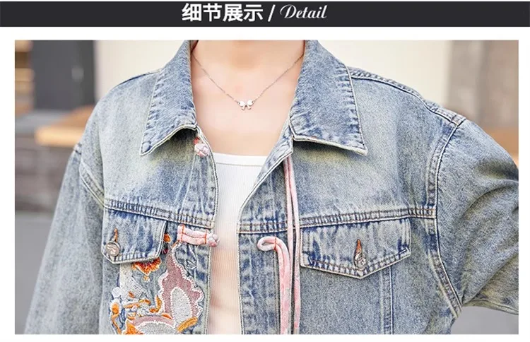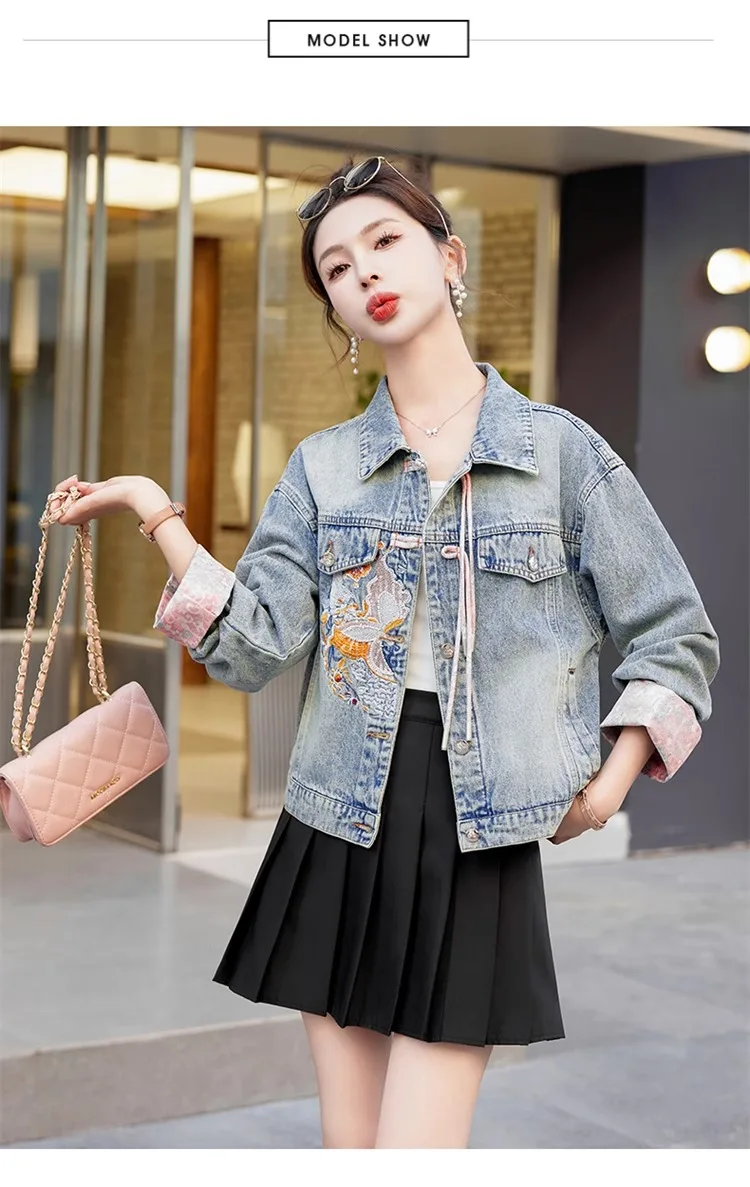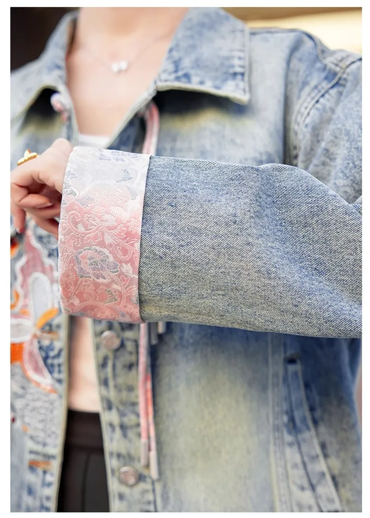 New 2024 Spring Women Denim Jacket And Coat Chinese Style Long Sleeve Embroidery Chinese Buttons Elegant Outwear Woman Jackets