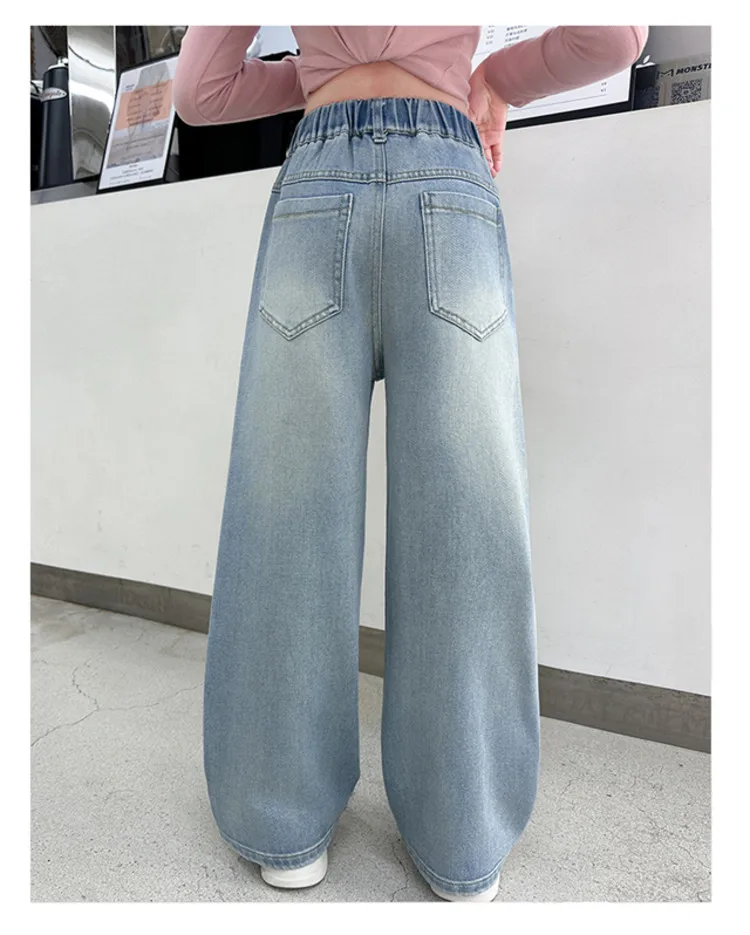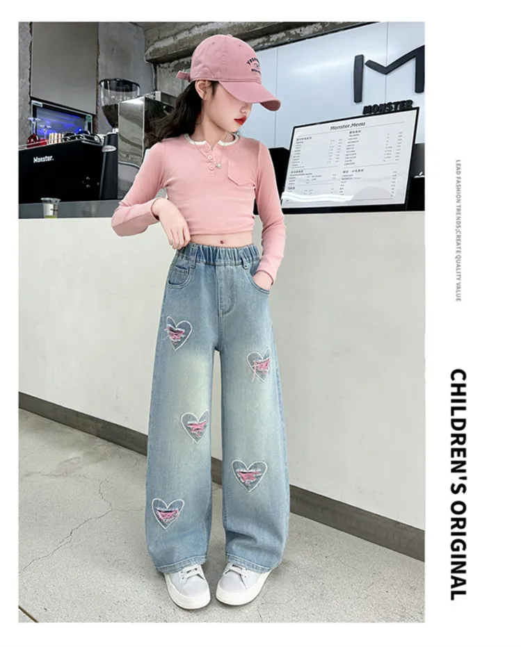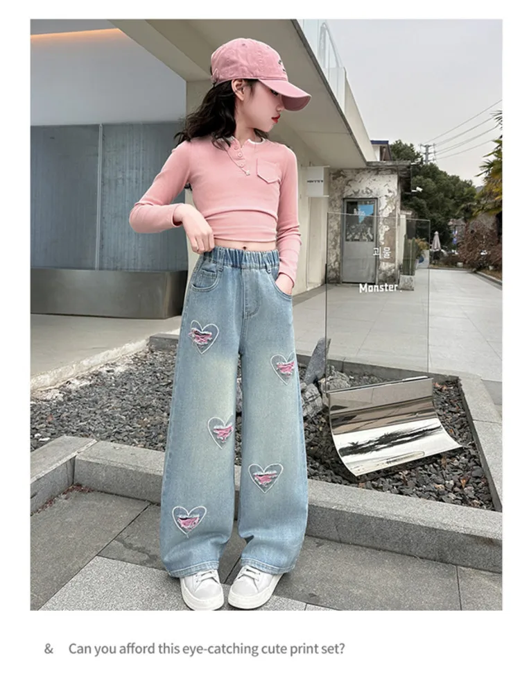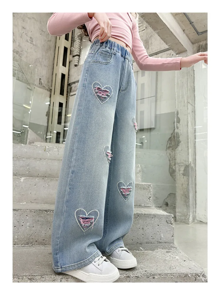 New 4-14 Years Spring Autumn Teenage Girls Jeans Full Print Bow Embroidery Fashion Wide-leg Denim Pants For Kids