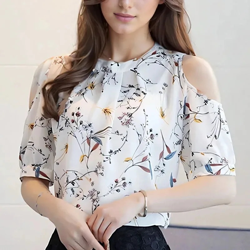 New Summer and Autumn Women’s Chiffon Printed Off-shoulder Short-sleeved Shirt Fashionable and Elegant Crew Neck Office Blouse