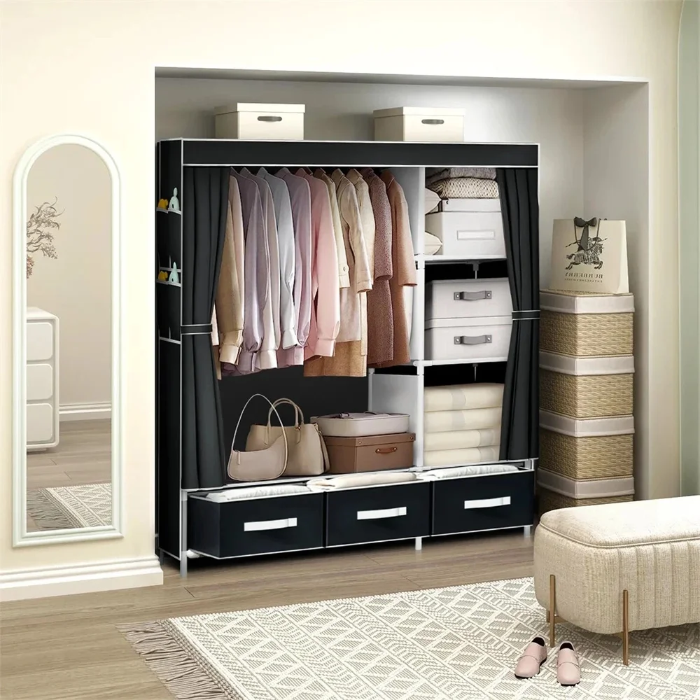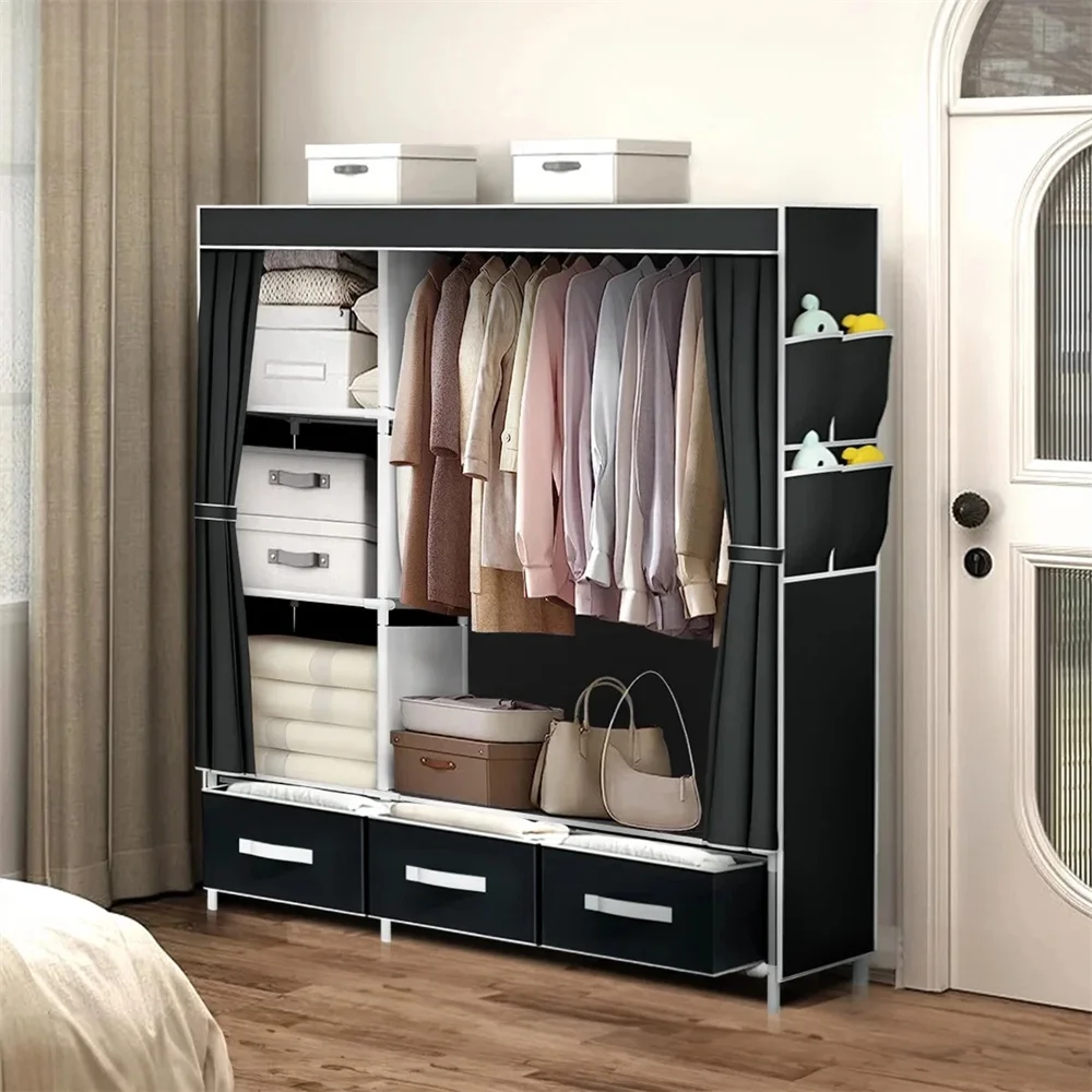 This portable closet comes with clothes hanging rods, 3 storage shelves, 3 drawer boxes and 2 side pockets, offer you extra space for both your longer outfits and folded clothes.