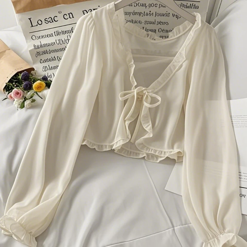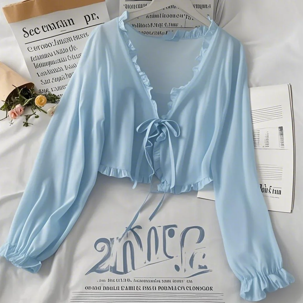 New Women’s Long Sleeve T-Shirt Thin Breathable Lace Bow Cardigan Blouse with Ruffles Sun Protection Outwear Summer Essential