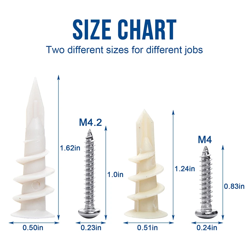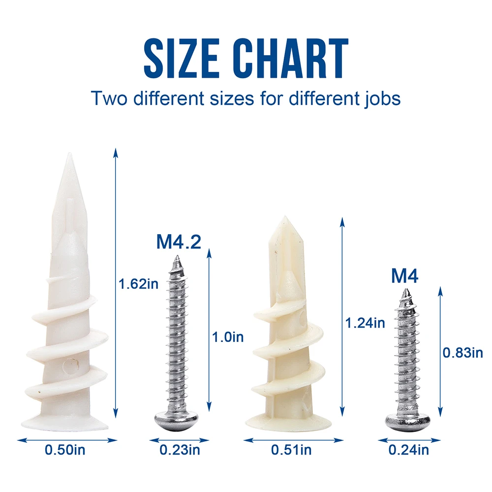 1. Made of high-strength plastic and 304 Stainless steel. Deep thread design provides strong engagement in 3/8″, 1/2″ or 5/8″ plasterboard gypsum wallboard.;