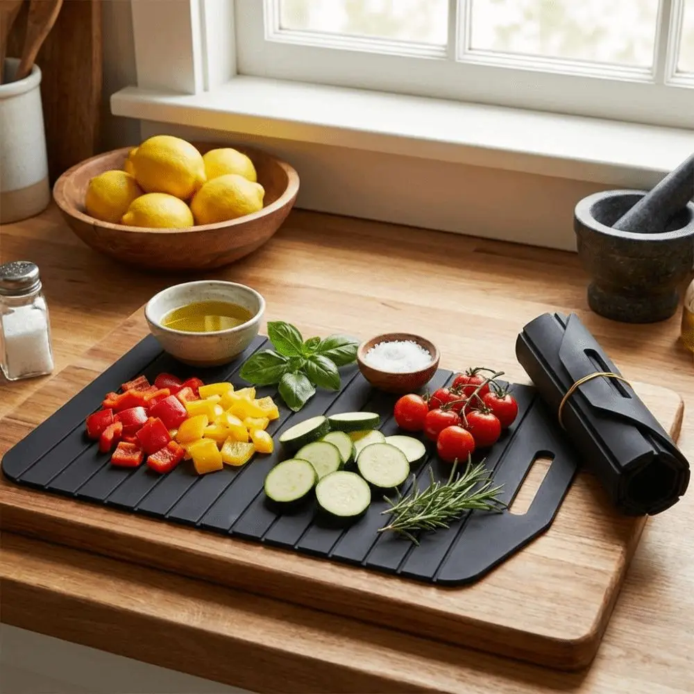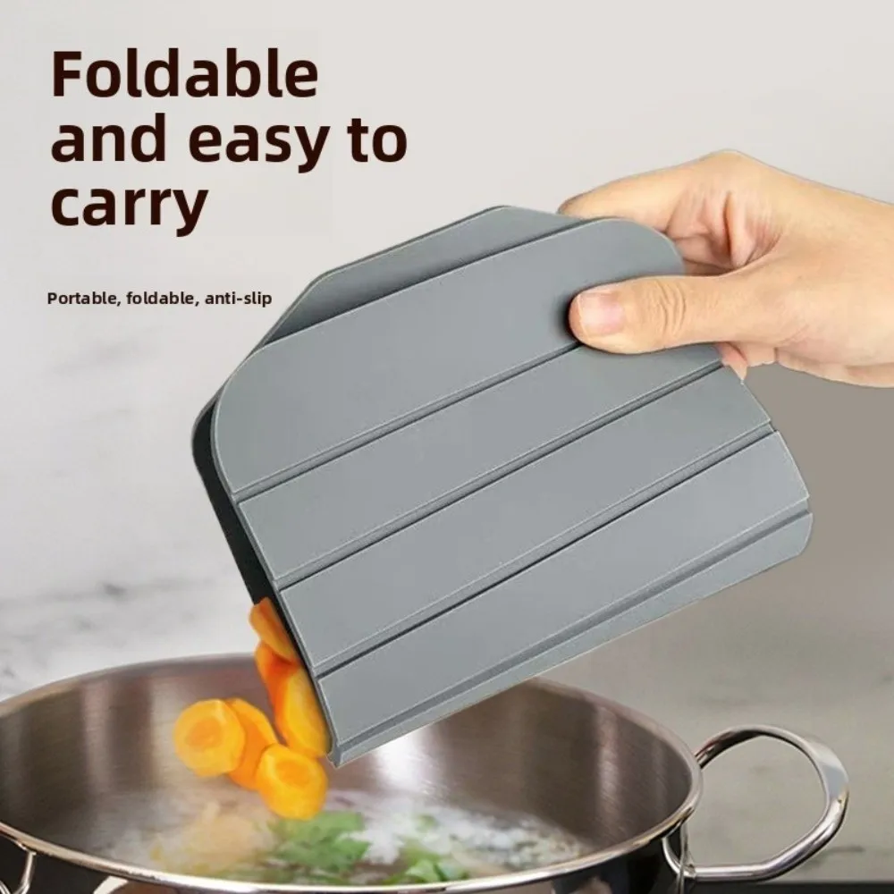 Folding design: The innovative silicone cutting board features a space-saving folding structure, enabling seamless storage and portability. Its backpack-friendly size makes it very suitable for travel and dormitories
