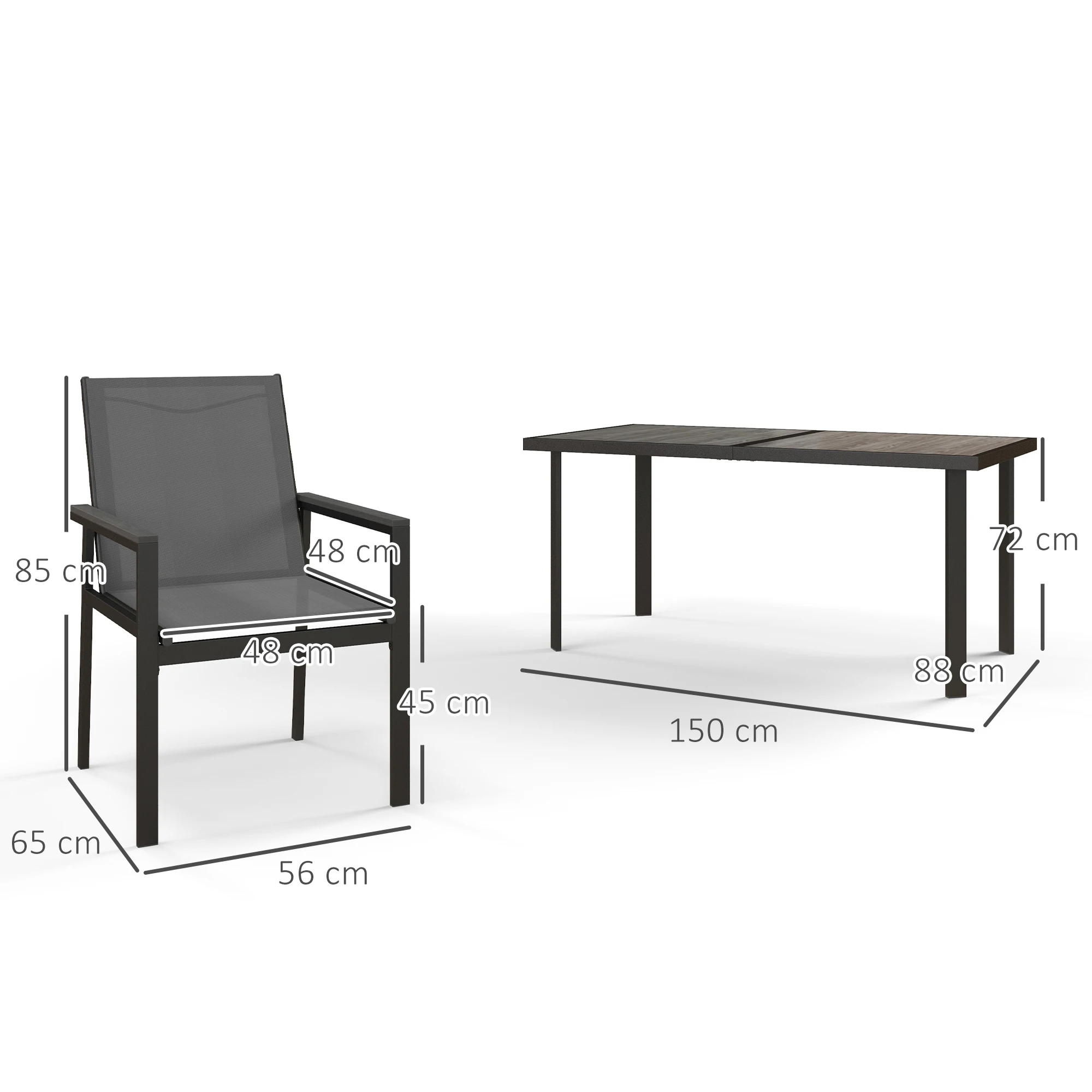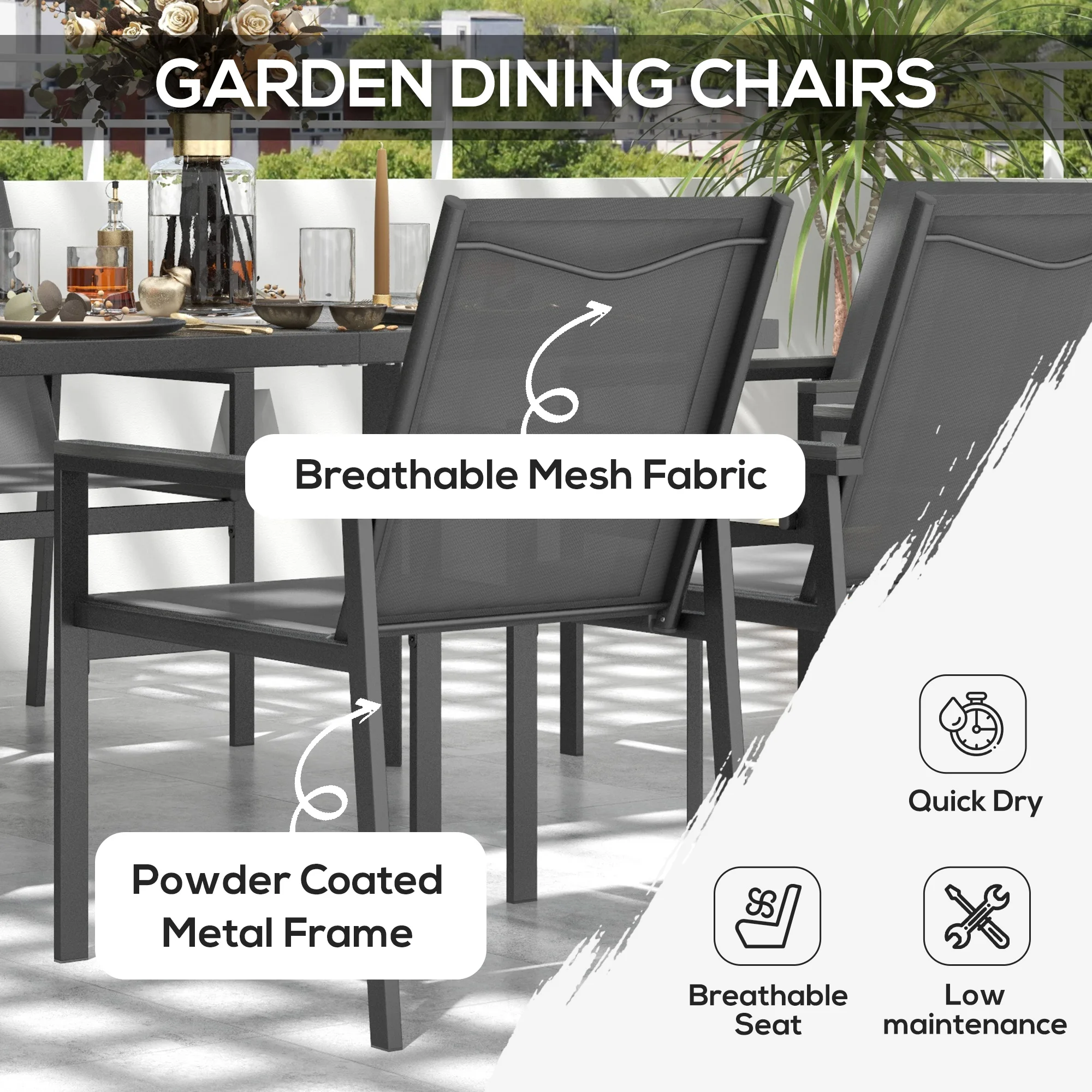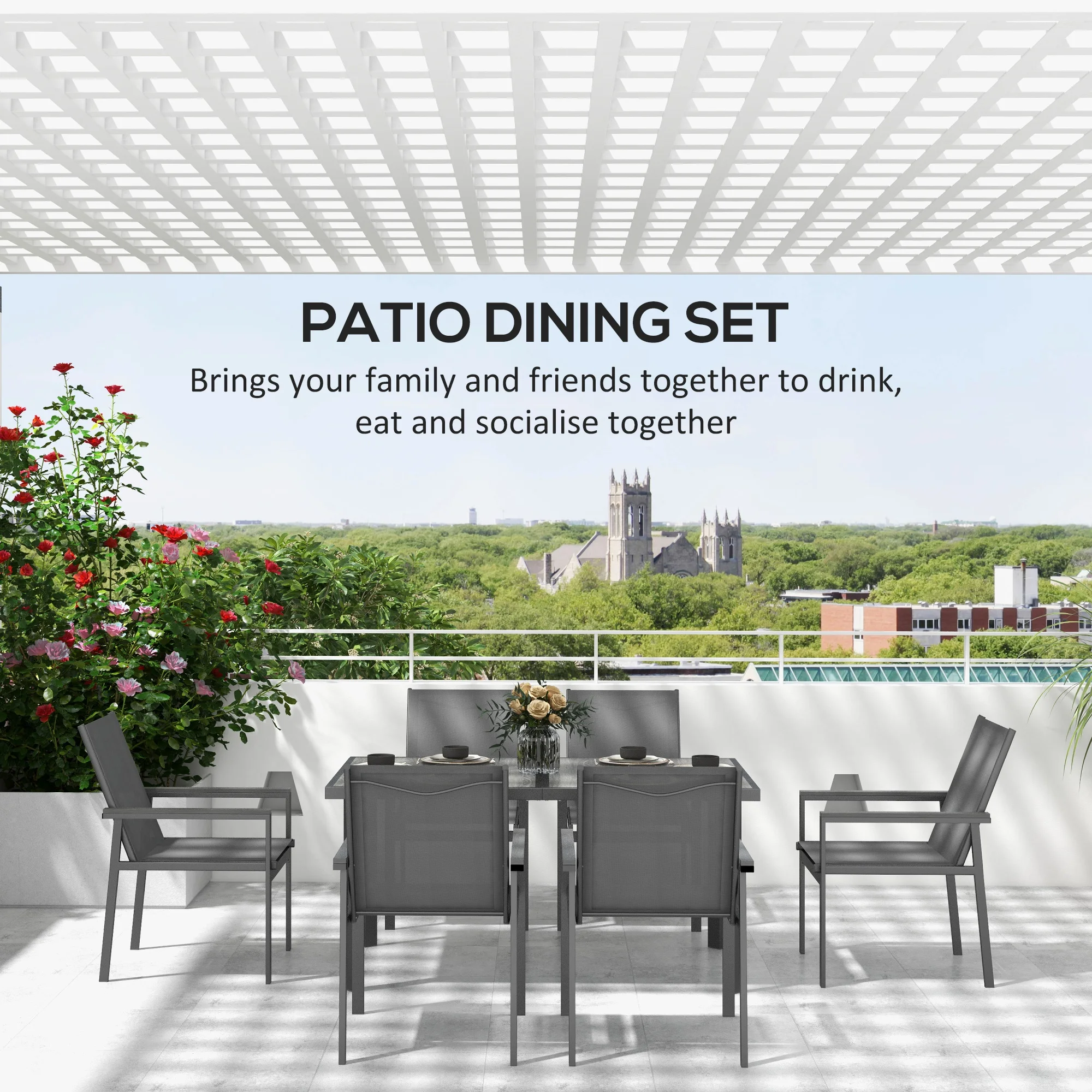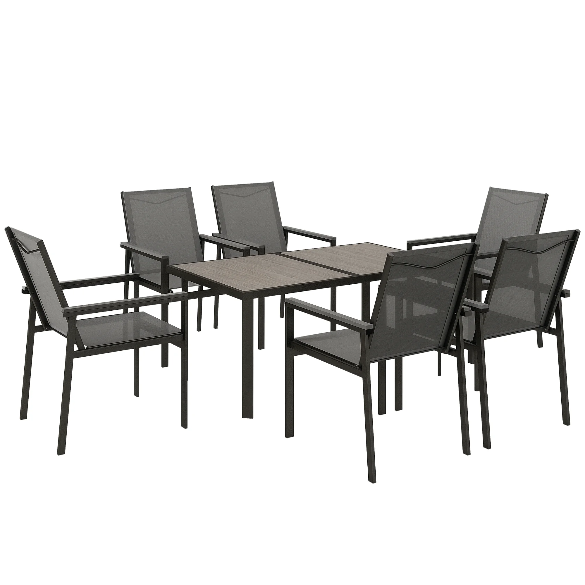 Enjoying weekend brunches and evening dinners outside – thanks to this Outsunny garden dining set. This outdoor furniture set comes with a rectangular dining table and six matching chairs for you and others to gather around. Powder-coated steel frames mean a strong garden furniture set. The wood-effect tempered glass top on the table means a sleek look and safe surface to dine from.
