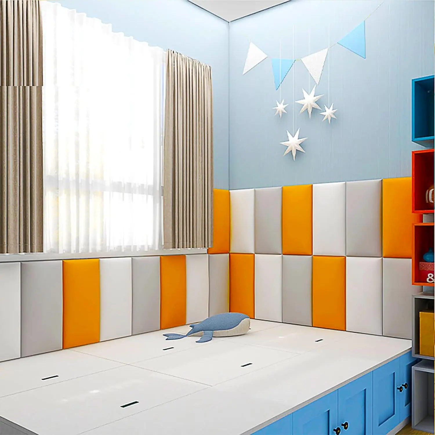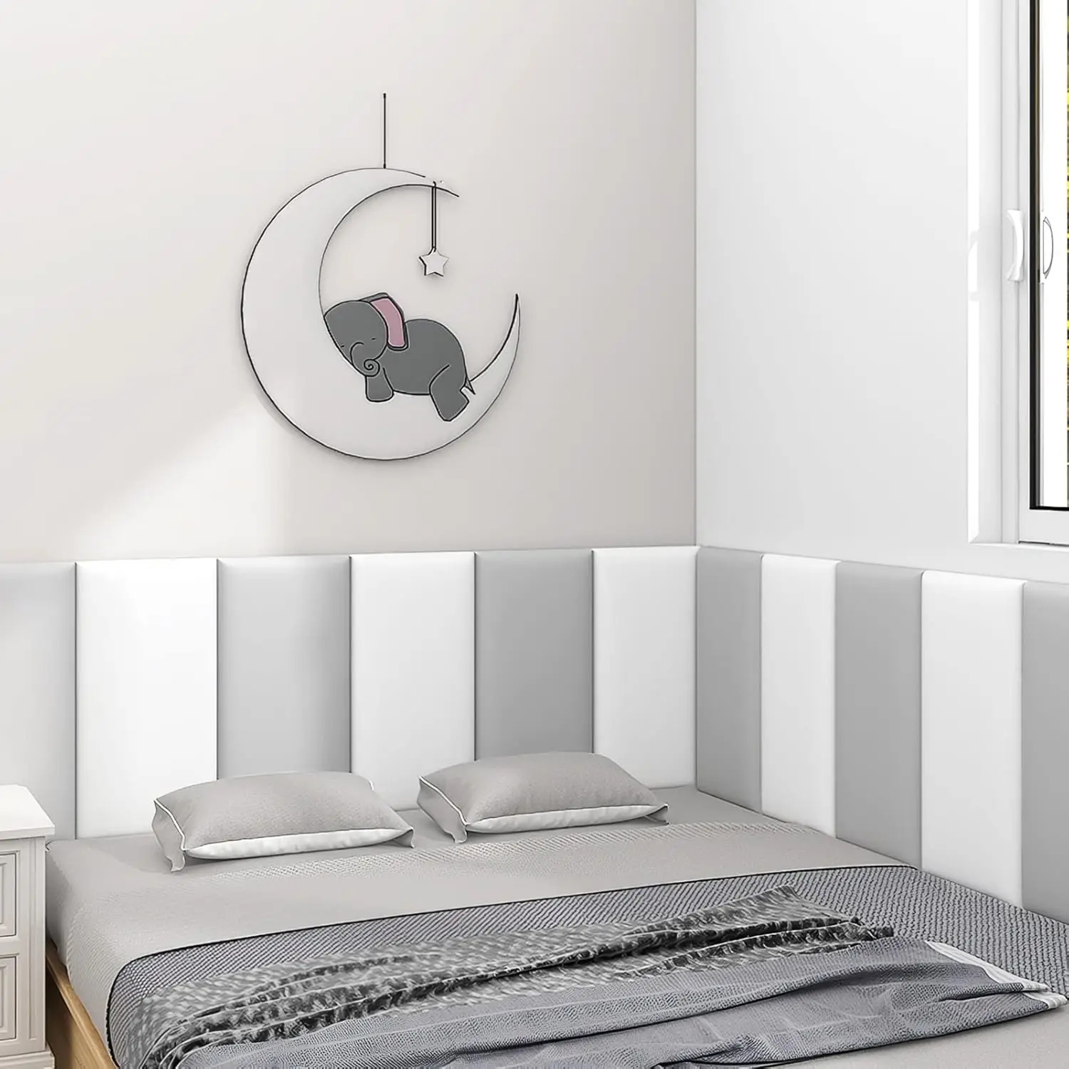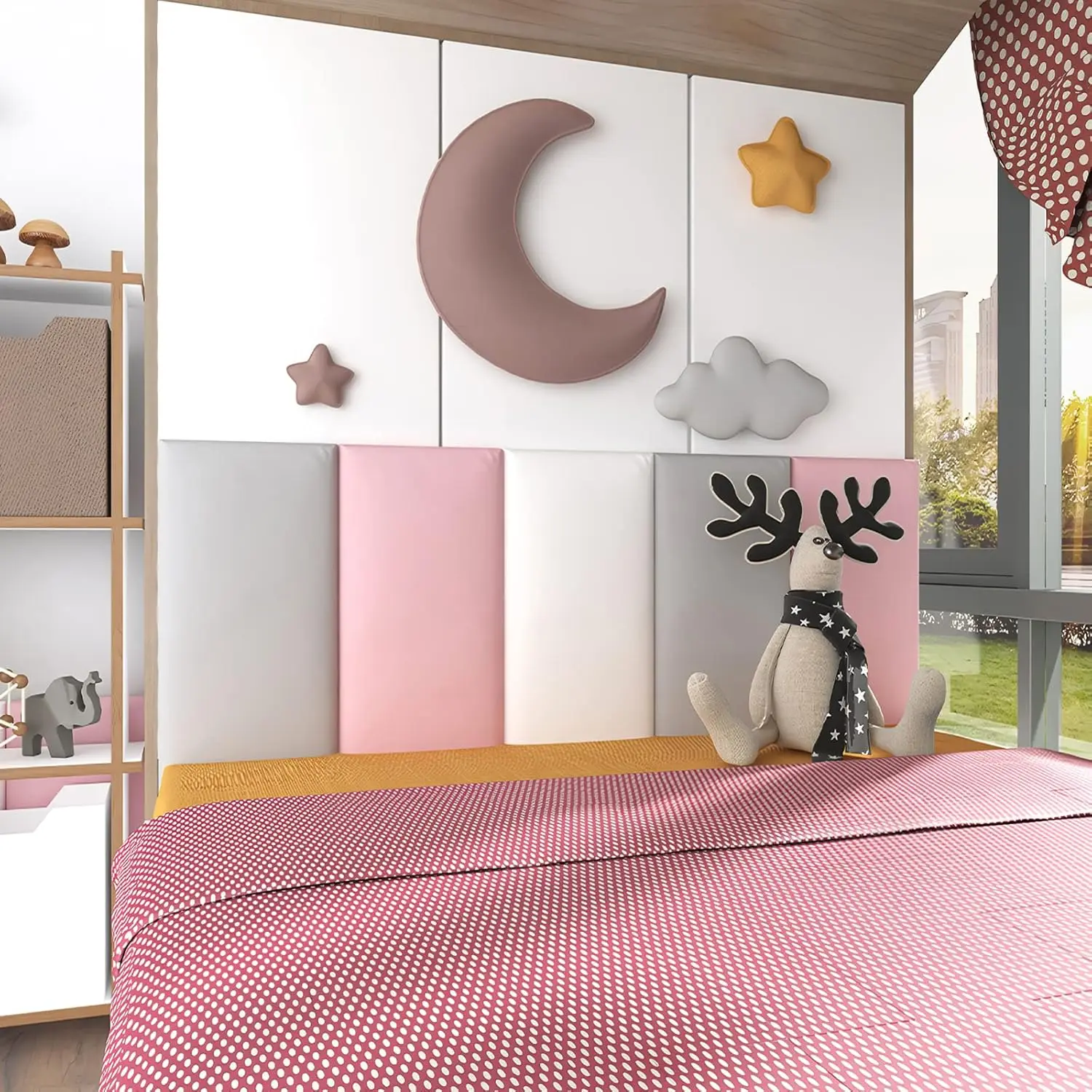 • HIGH QUALITY: This wall cushion use 35D high elastic sponge, soft hand feeling and good cushioning. Super scratch-resistant PU leather, waterproof and easy to clean. E0 level environmental protection bottom plate, close to 0 formaldehyde, perfect for parents who prioritize safety and sustainability.