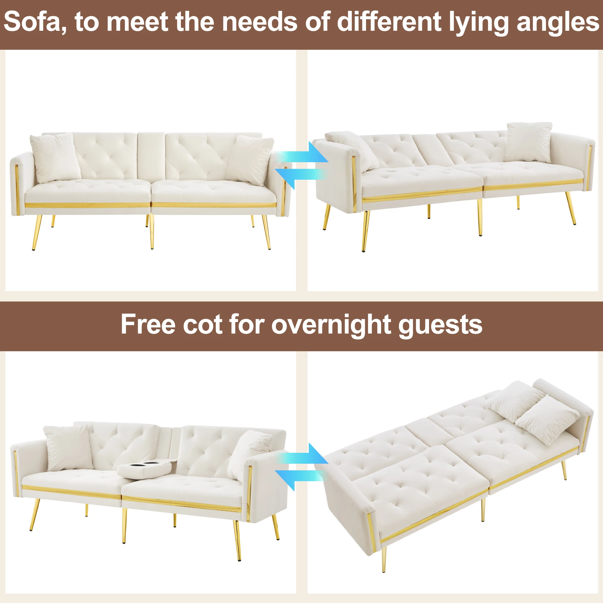 PINGGO Adjustable Backrest Double Sofa Bed Built-In Cup Holder Multifunctional Double Sofa Suitable For Living Room And Bedroom