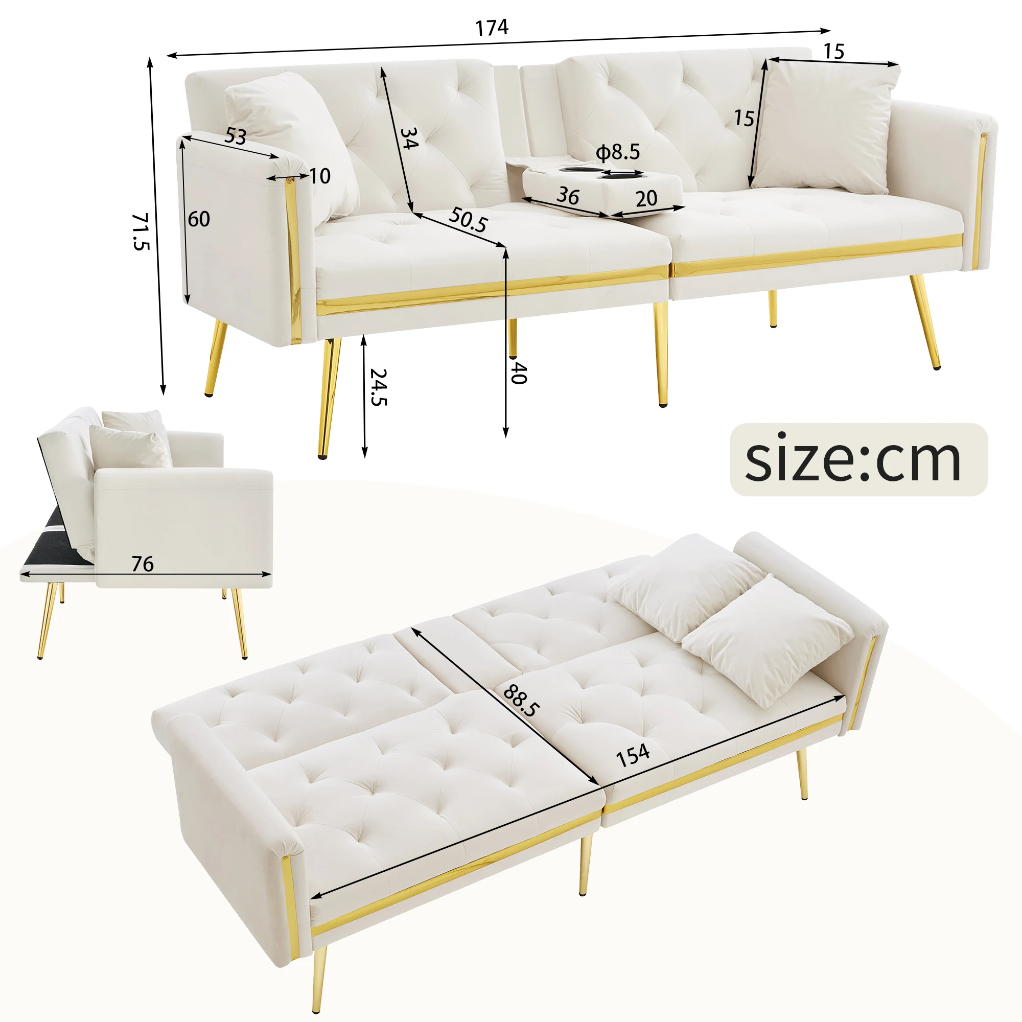 Golden metal legs and elegant trim details bring a sophisticated, modern look to the sofa, making it not just functional but also a statement piece in your living room or bedroom. These eye-catching features add a luxurious flair to your décor while guaranteeing stability.