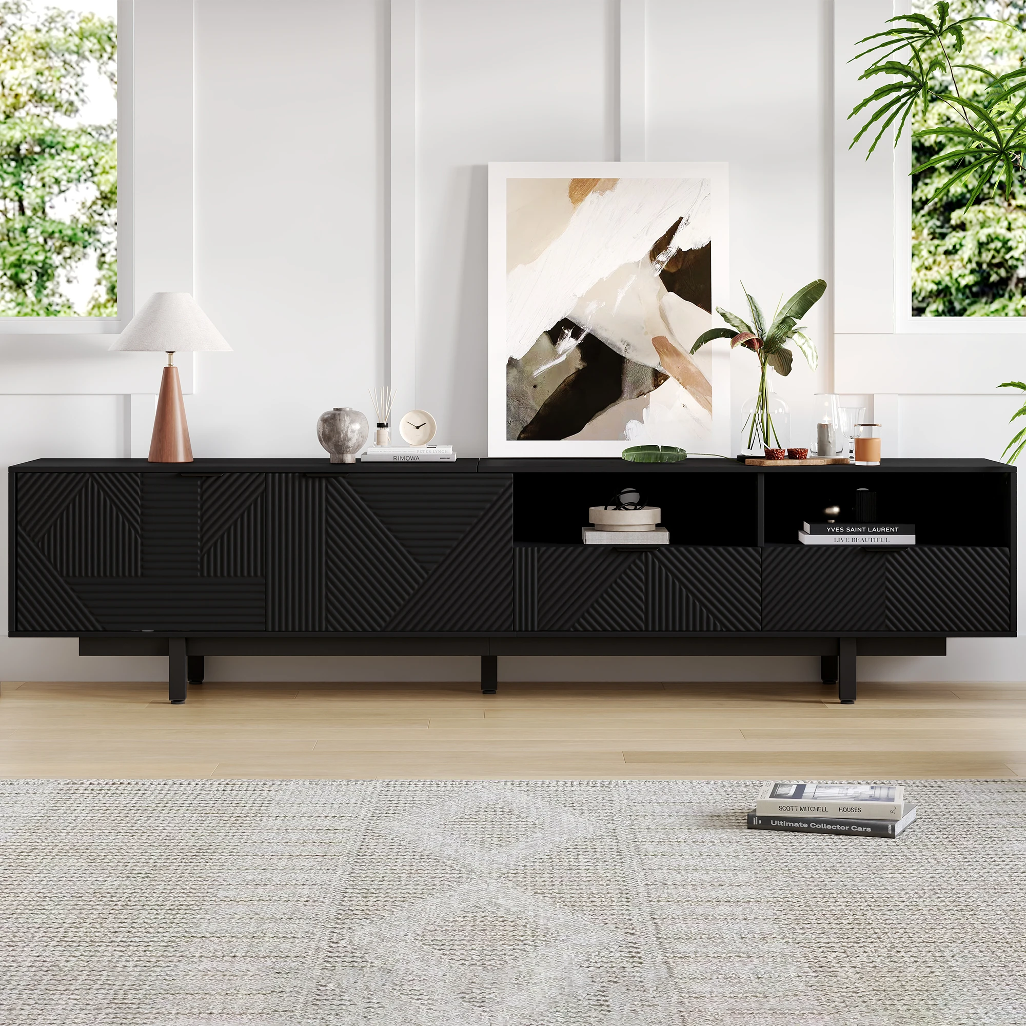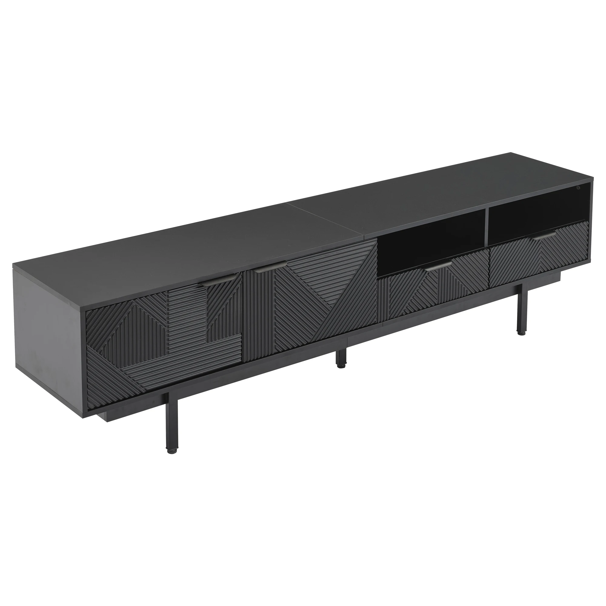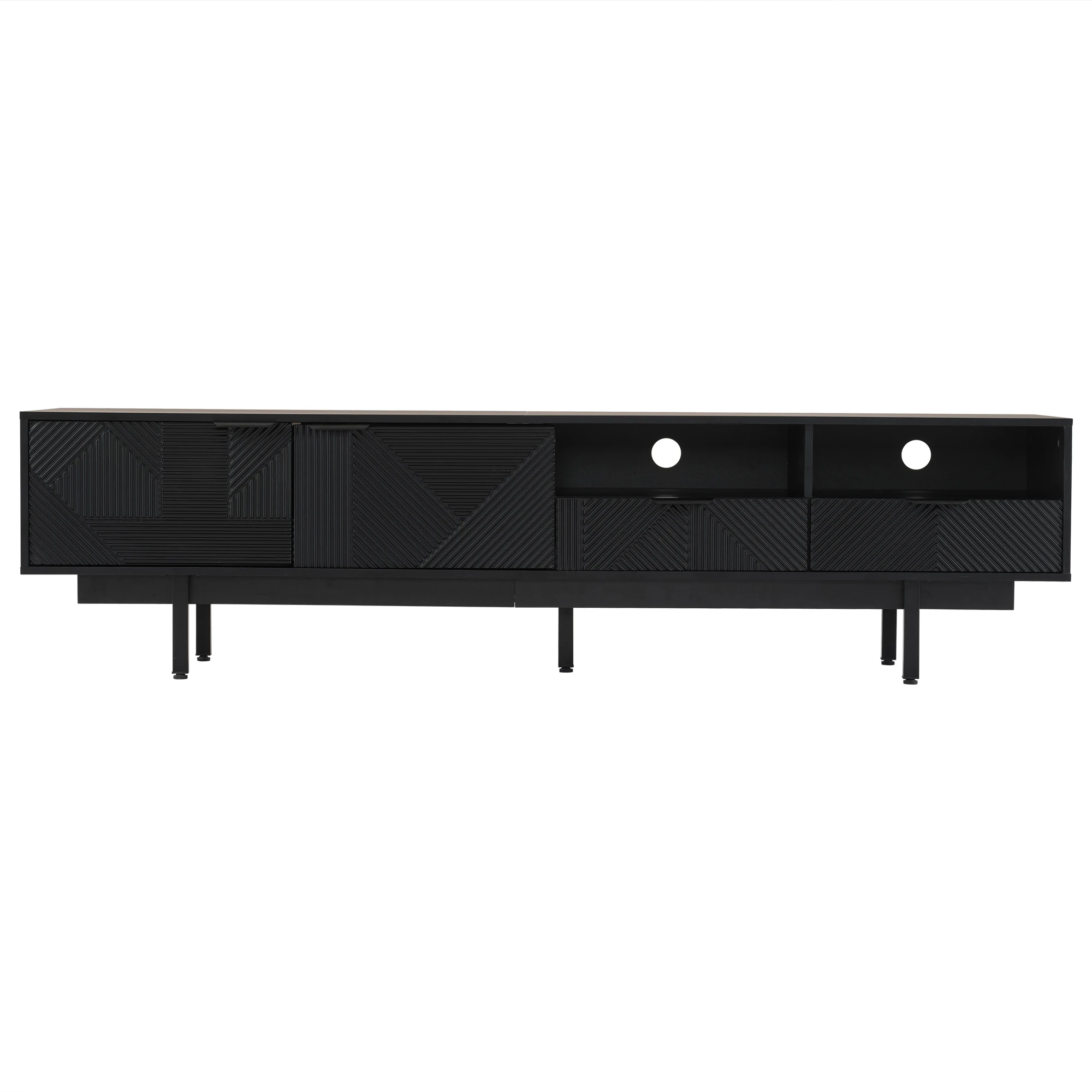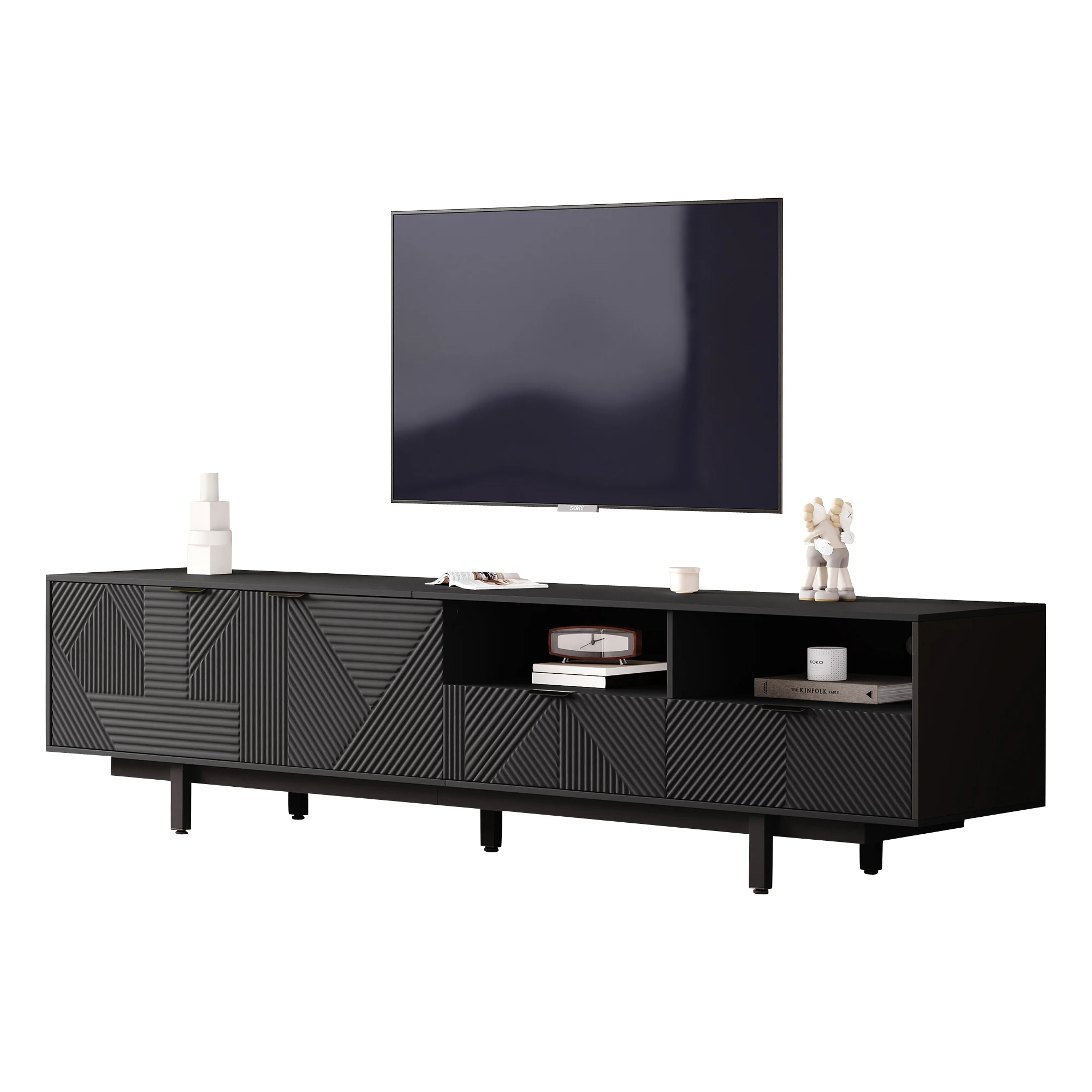 ELEGANT NEUTRAL GEOMETRIC LINE ART DESIGN: The black TV stand features a minimalist geometric pattern in neutral black tones.