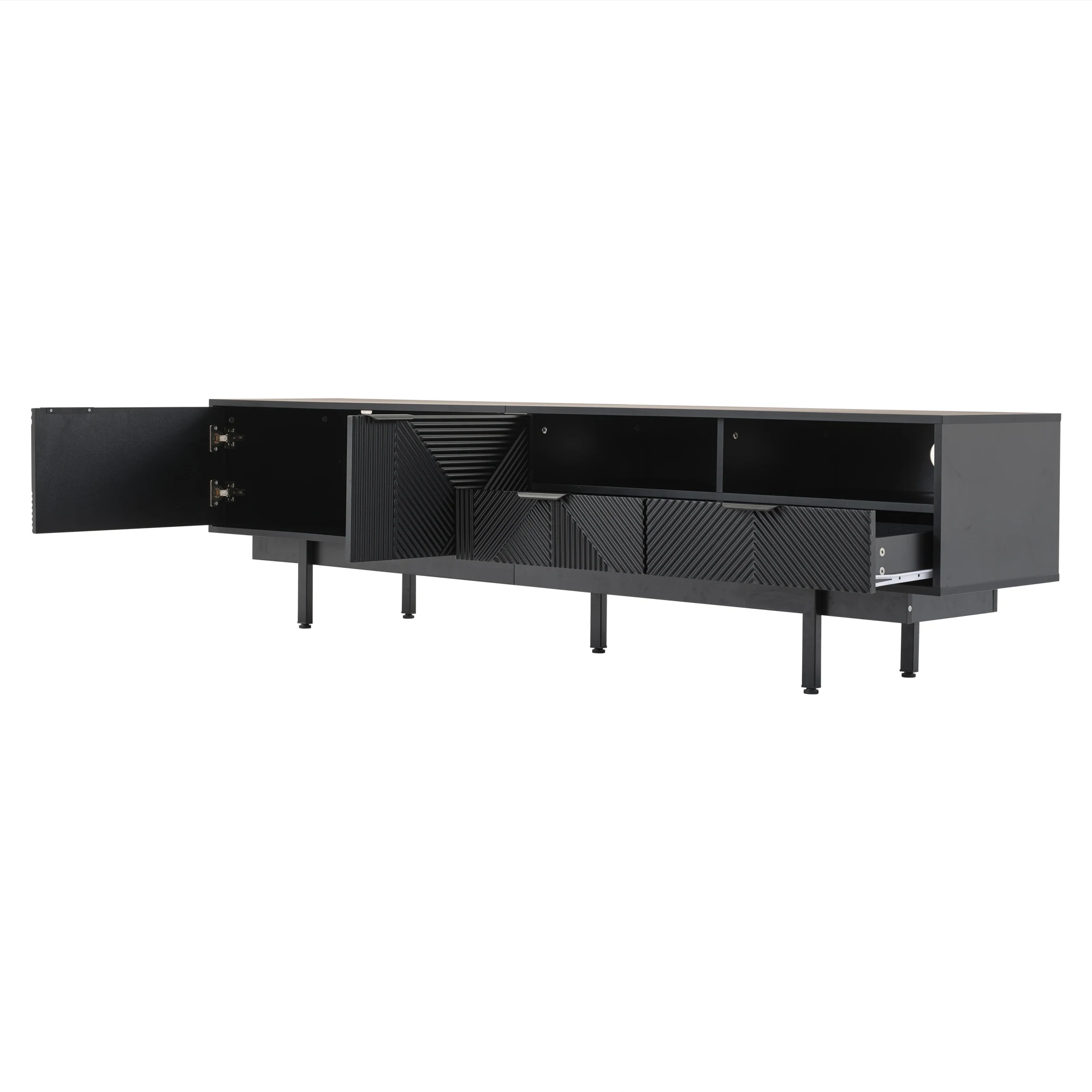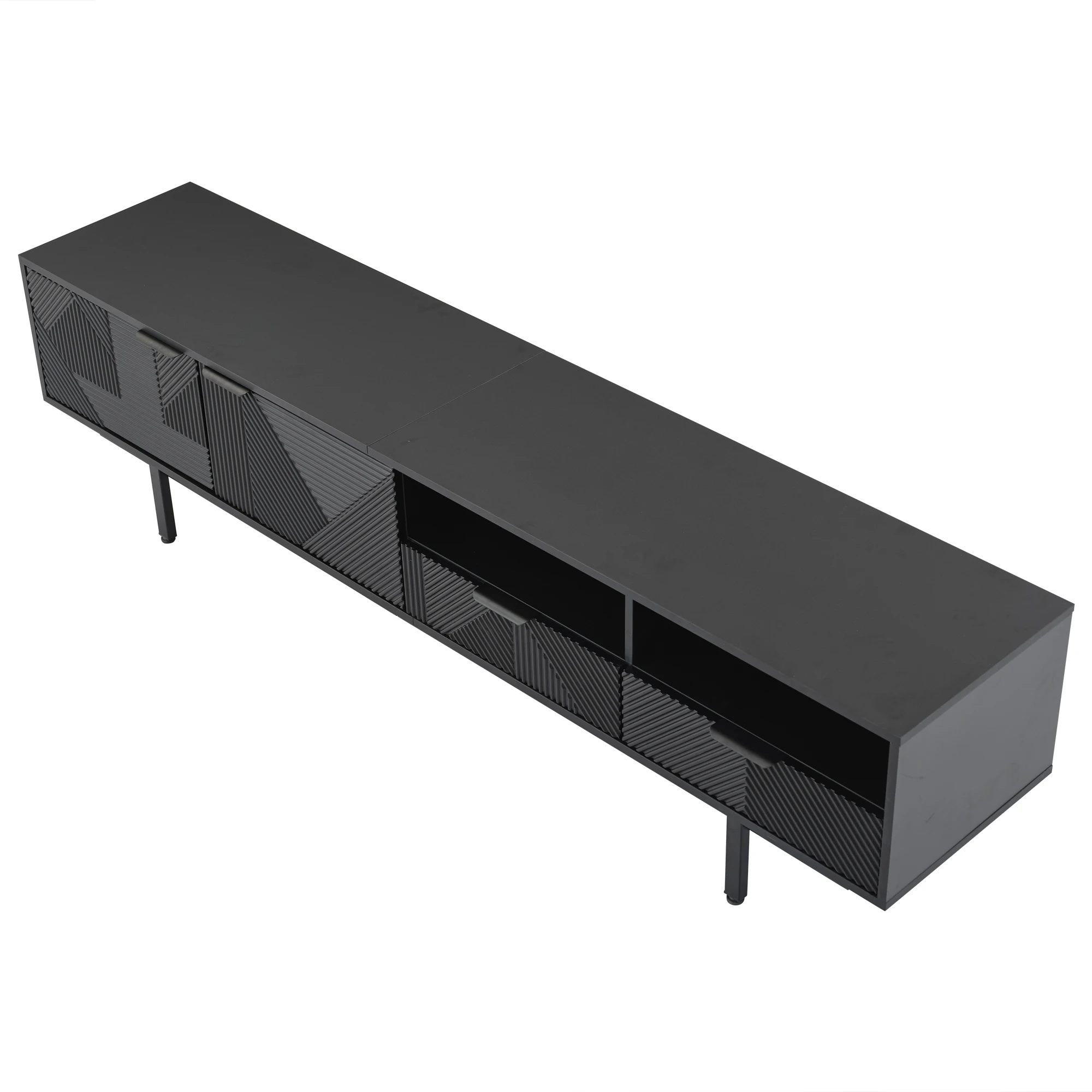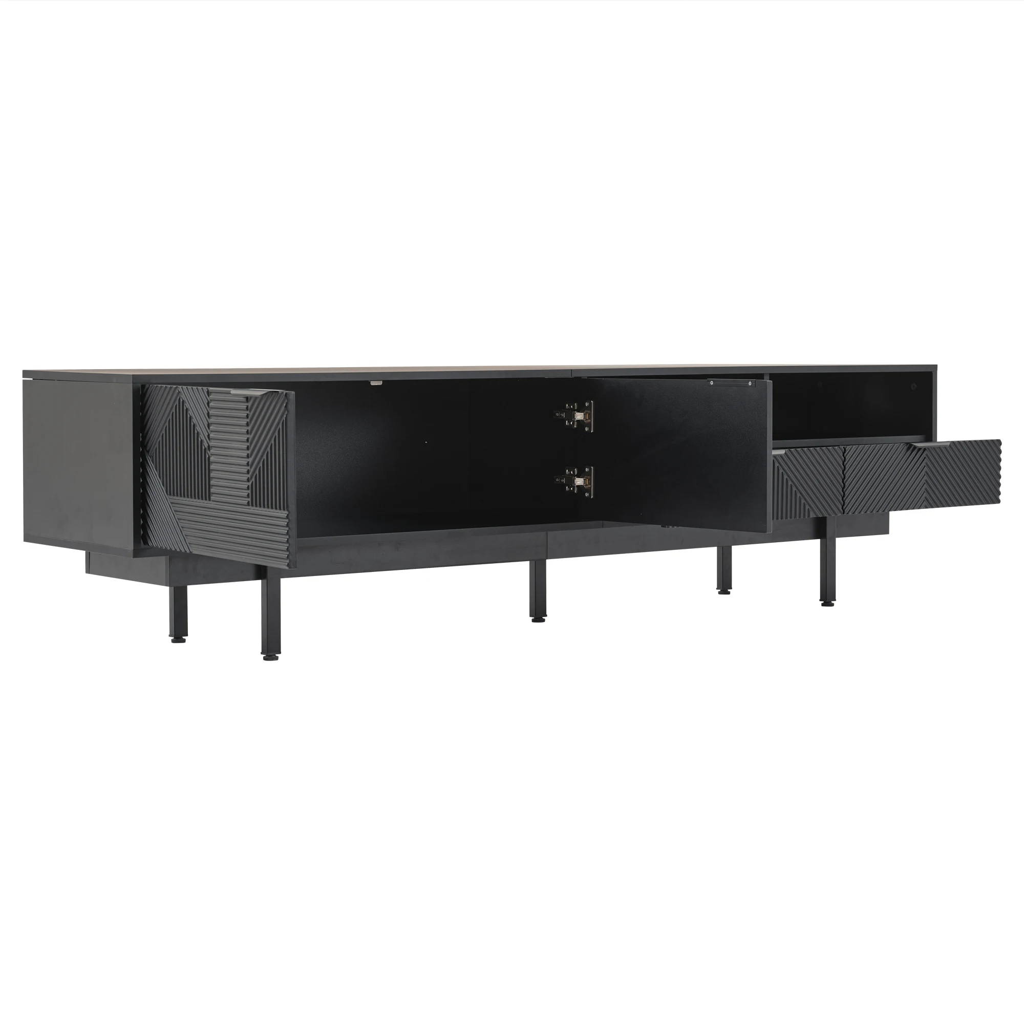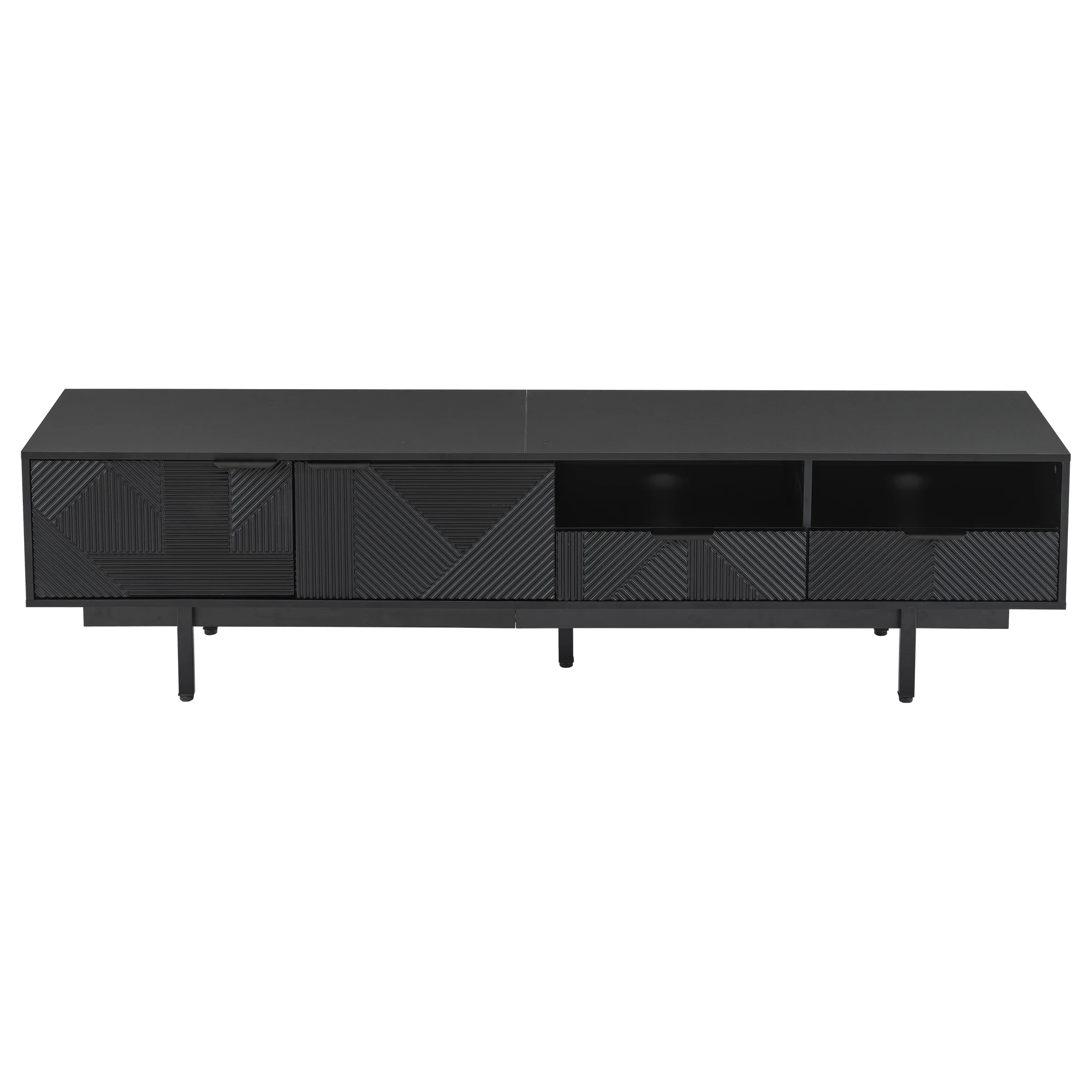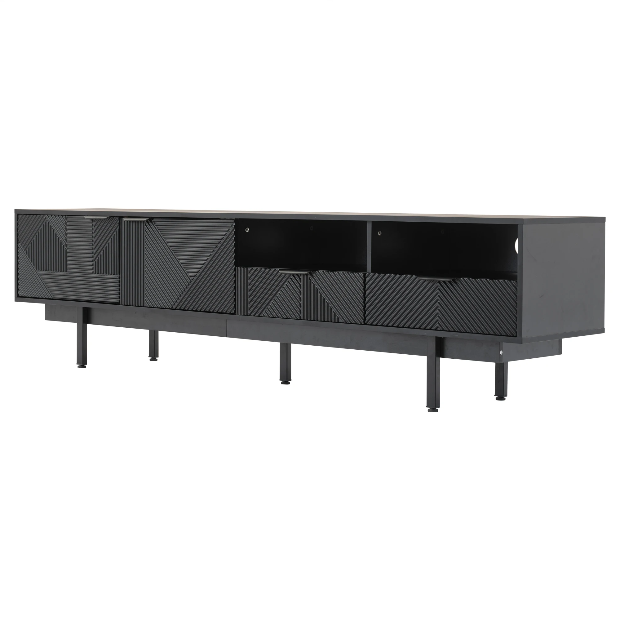 ELEGANT NEUTRAL GEOMETRIC LINE ART DESIGN: The black TV stand features a minimalist geometric pattern in neutral black tones.