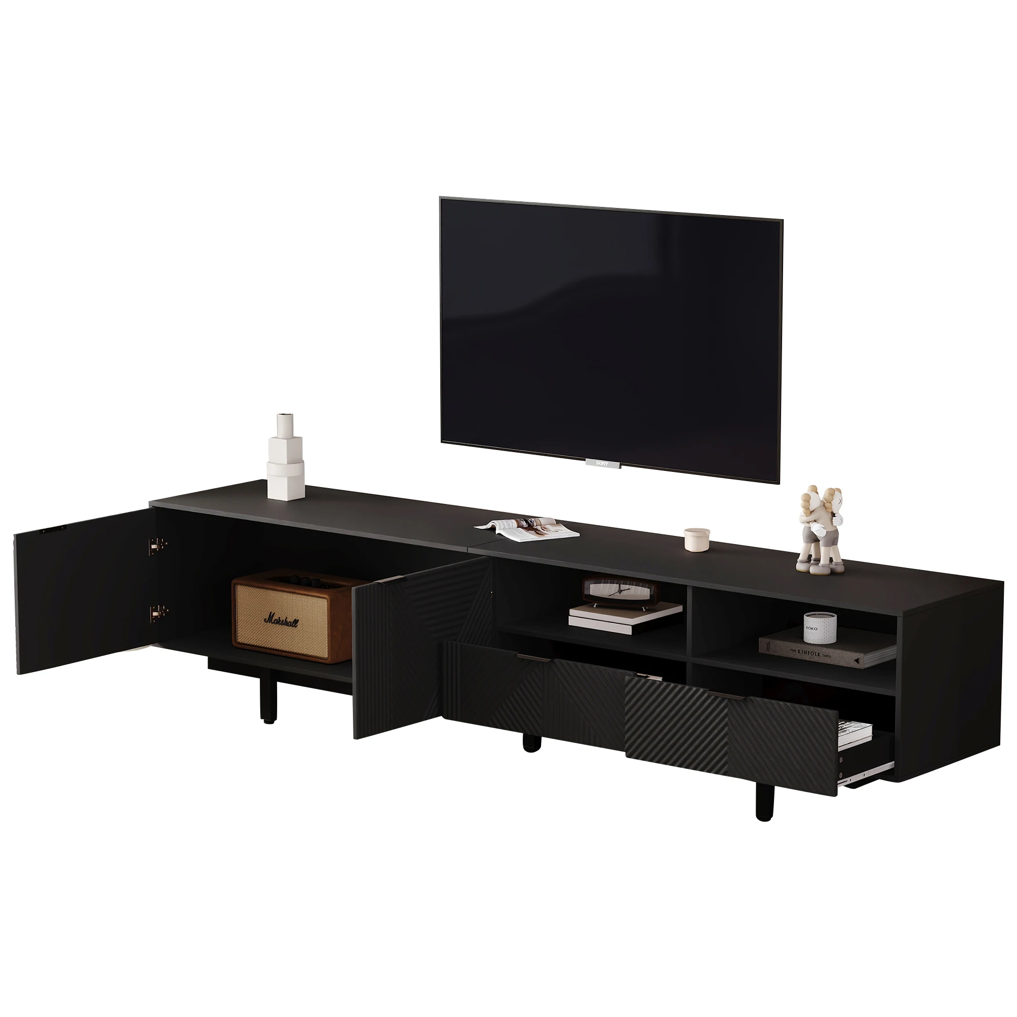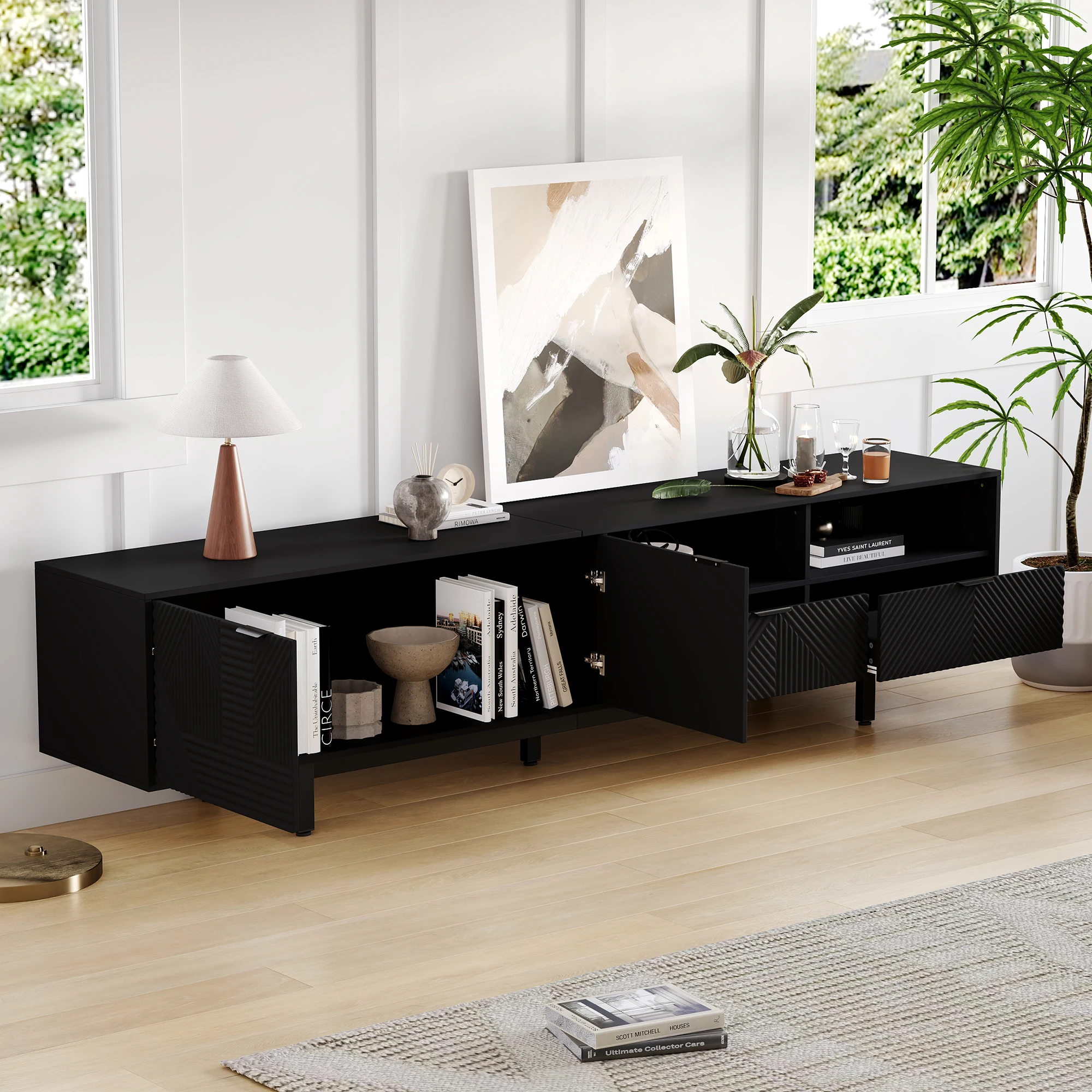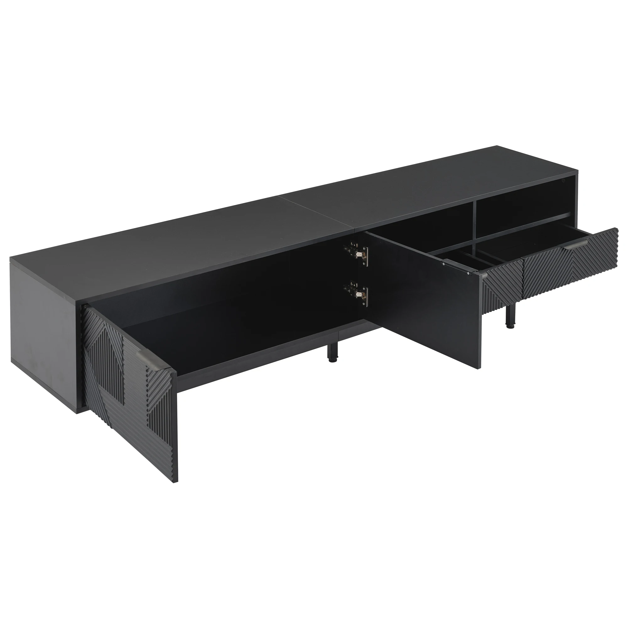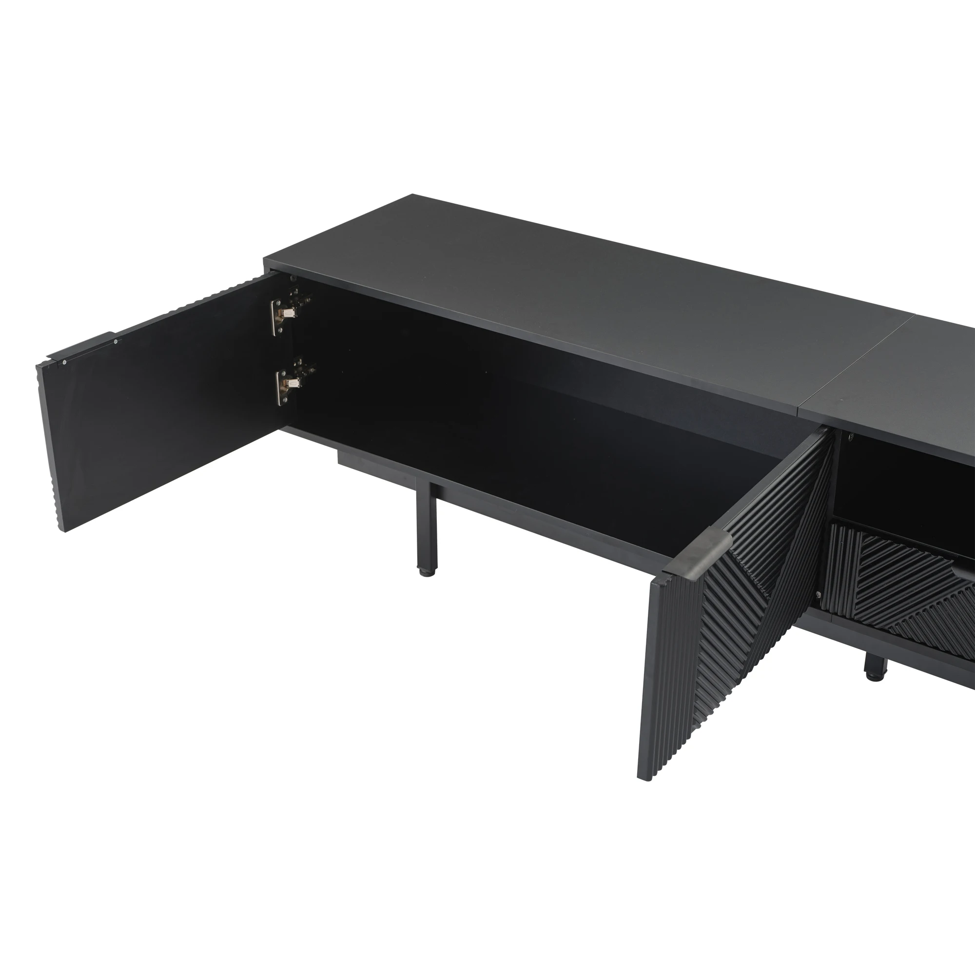 ELEGANT NEUTRAL GEOMETRIC LINE ART DESIGN: The black TV stand features a minimalist geometric pattern in neutral black tones.