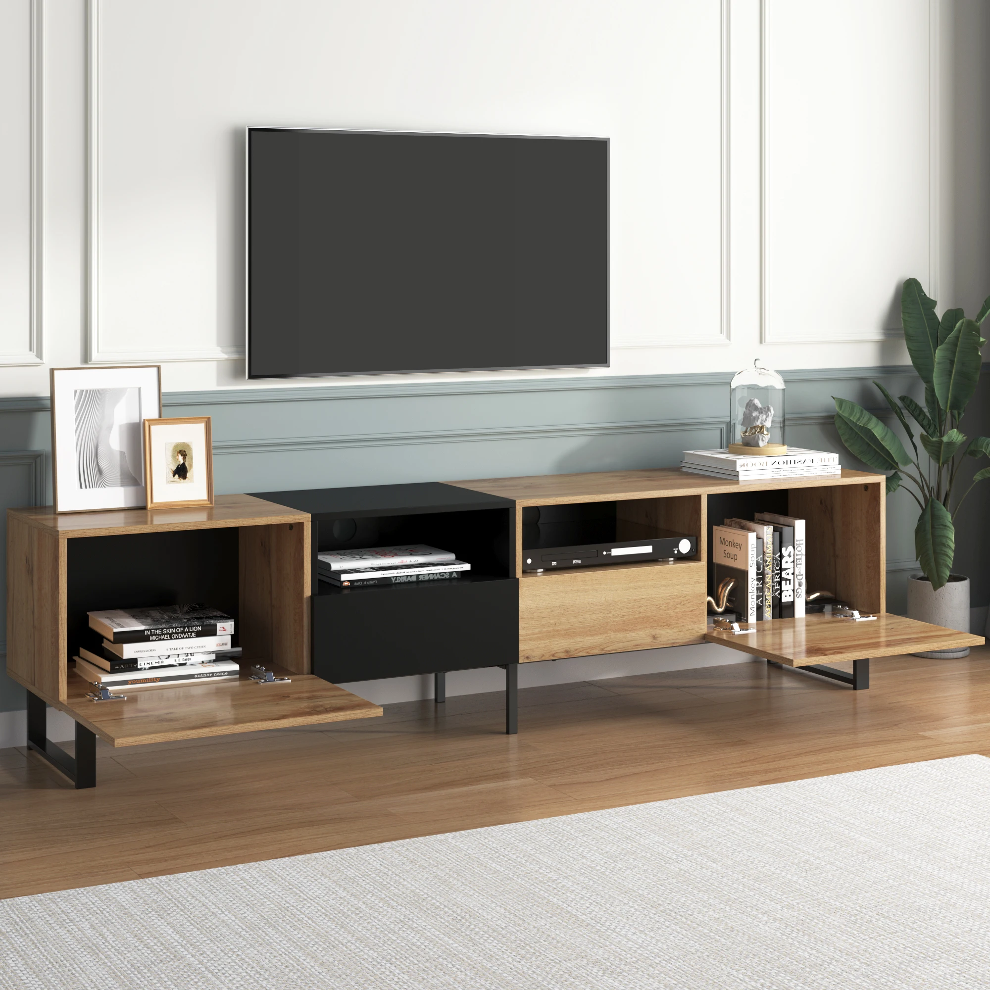 Introducing our stylish and functional modern TV stand featuring a captivating black and wood-colored design. This TV stand is the perfect addition to any living room, providing a sleek and modern look while offering ample storage space for your entertainment essentials.