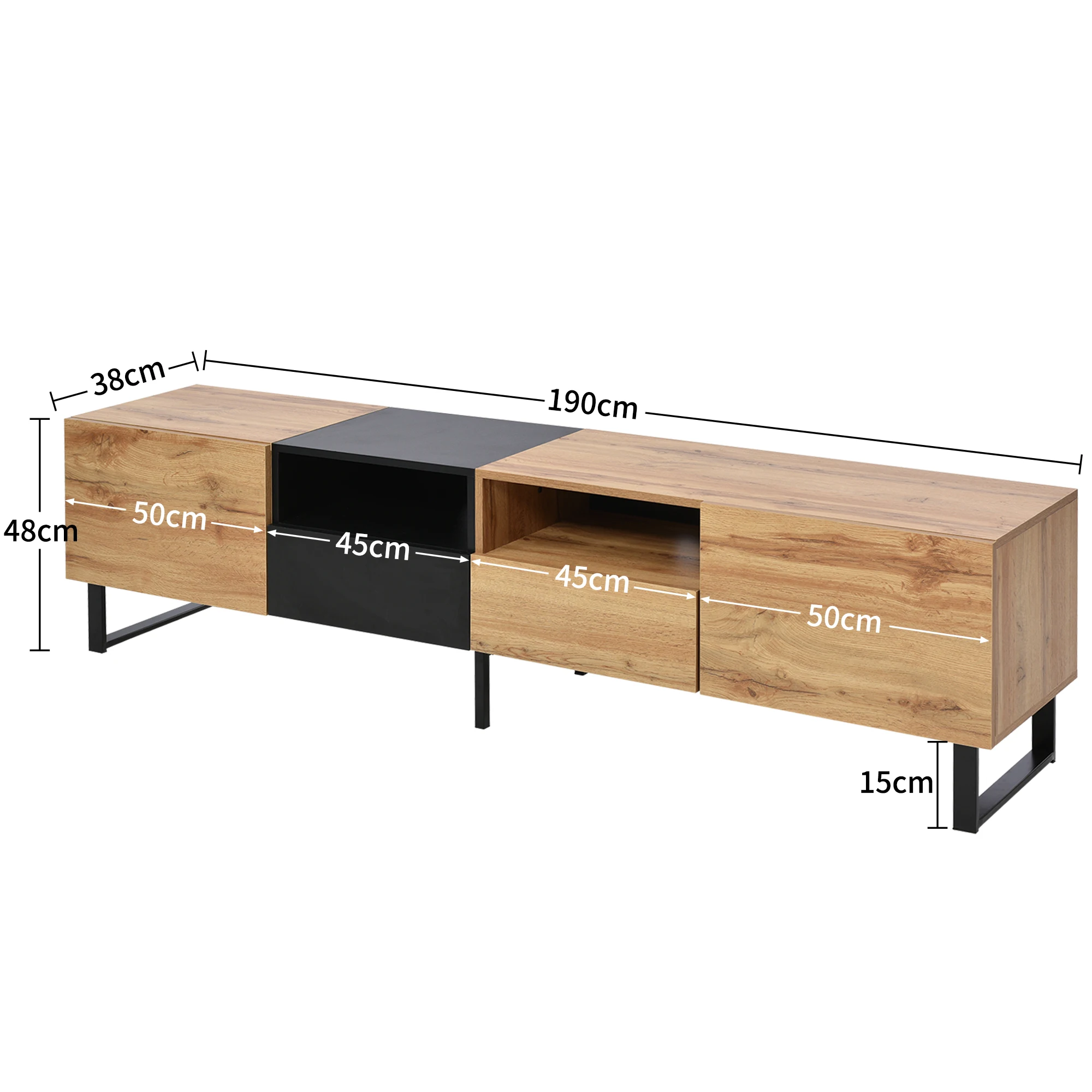 Crafted with precision, this TV stand measures 190 cm (length) × 38 cm (width) × 48 cm (height), making it suitable for a variety of TV sizes. Its thoughtful layout includes two doors and two drawers, giving you plenty of space to organize your media devices, DVDs, and other accessories. The inclusion of drawer boards offers additional versatility, allowing you to customize the storage space according to your preferences.