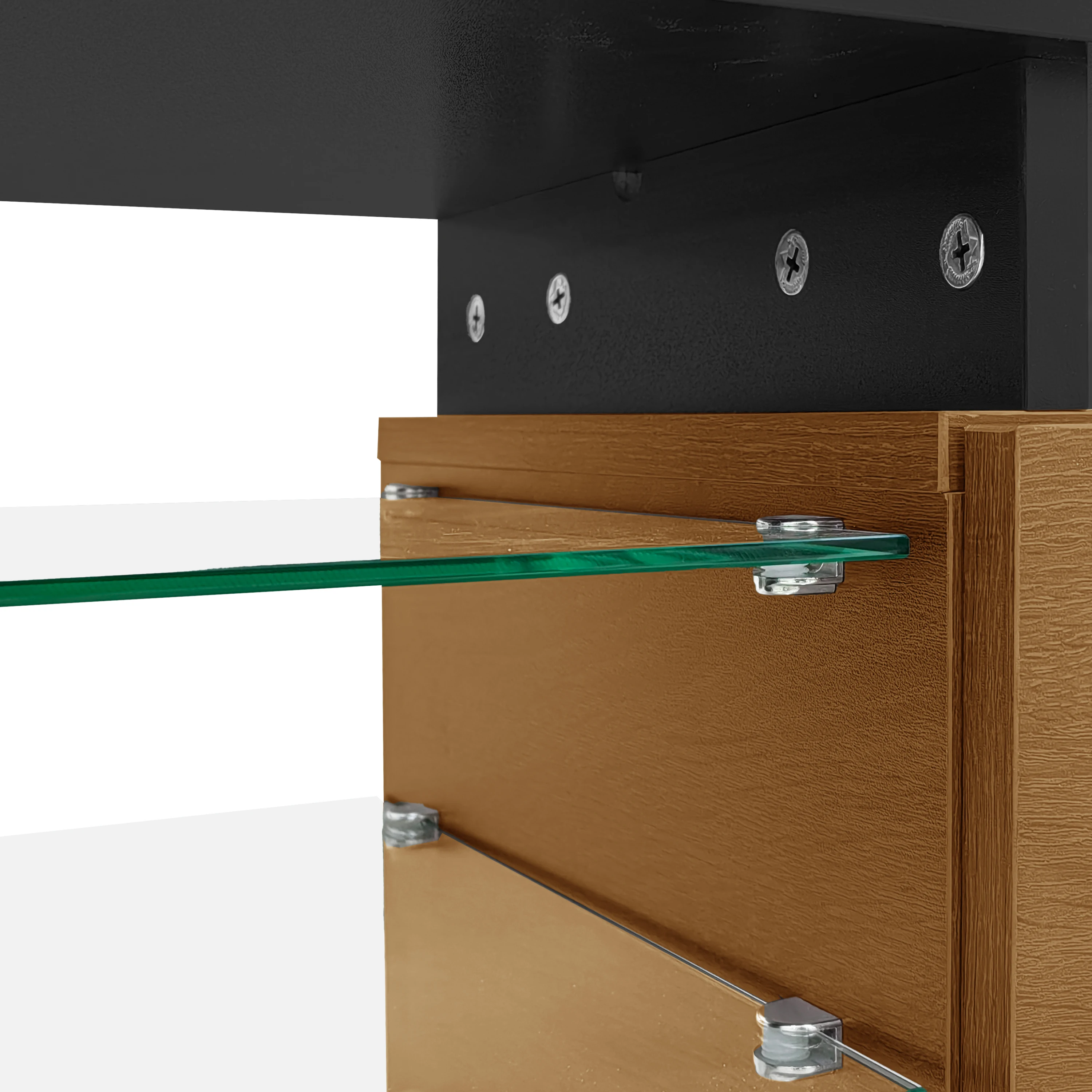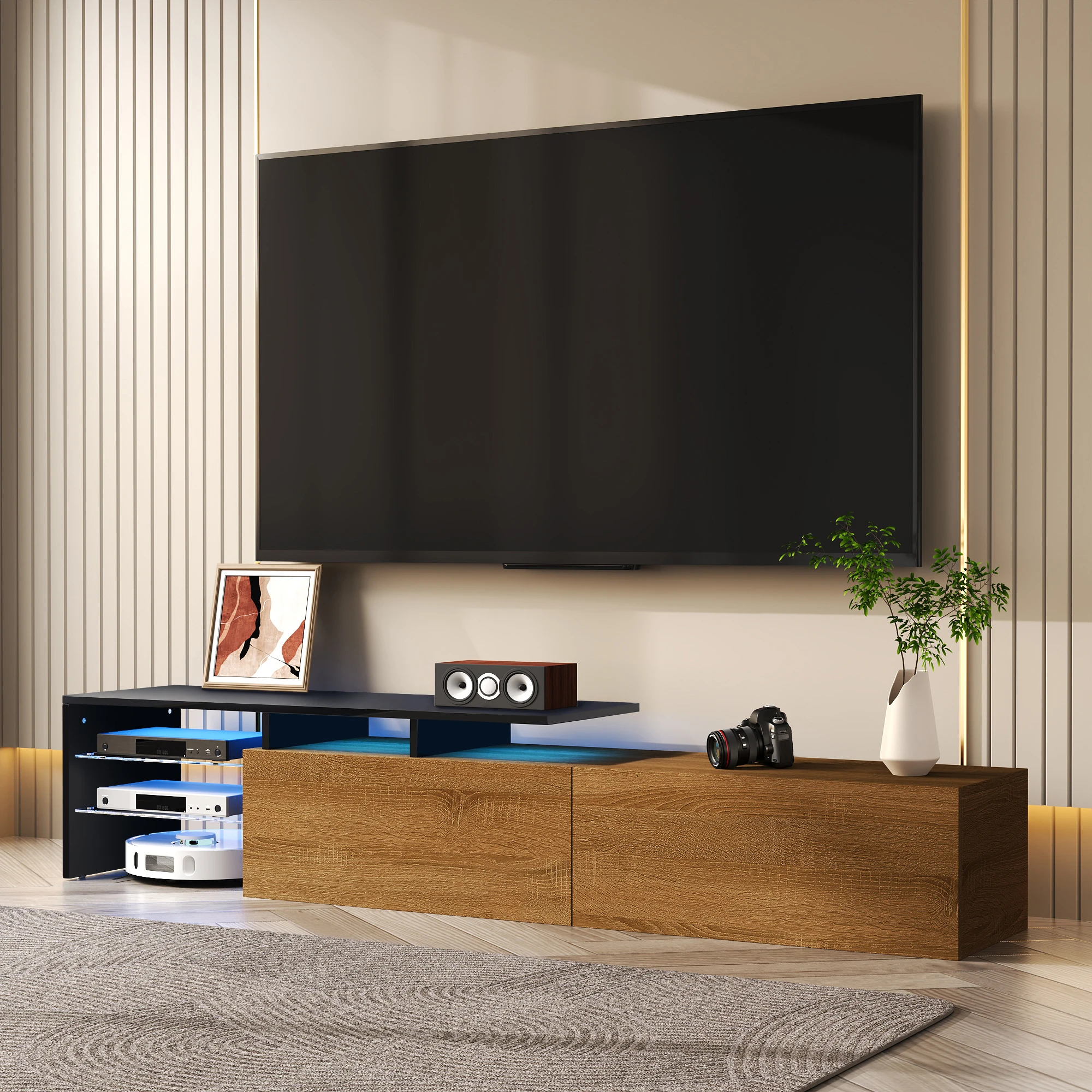A highlight of this cabinet is the glass shelves, which are perfect for displaying decorations or placing other appliances. The 16-color LED light strip provides impressive lighting options and creates a grand atmosphere in your living room.