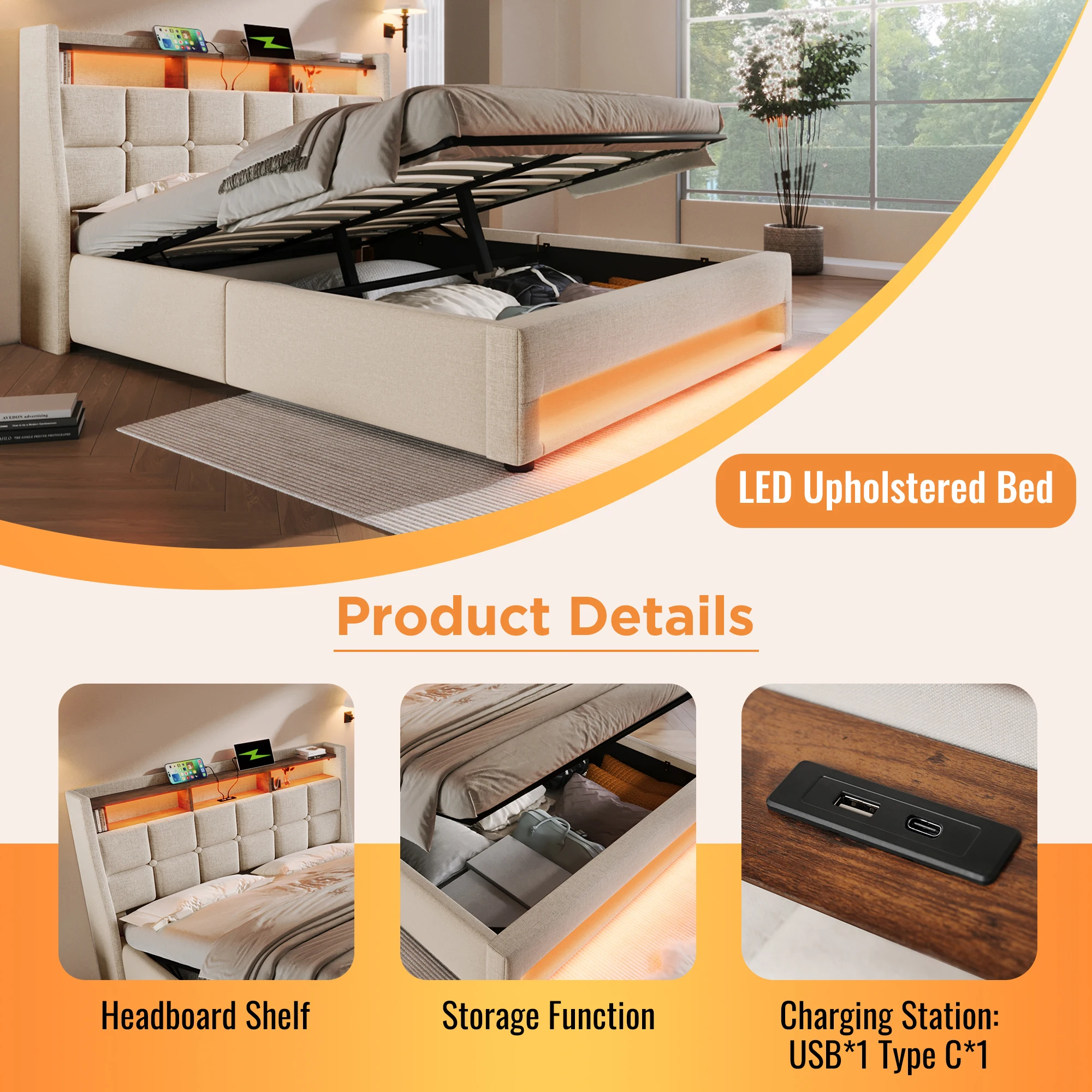 PINGGO Upholstered Double Bed with LED Lighting, Storage Headboard, 6FT Super King Size Storage Bed Frame (No Mattress)