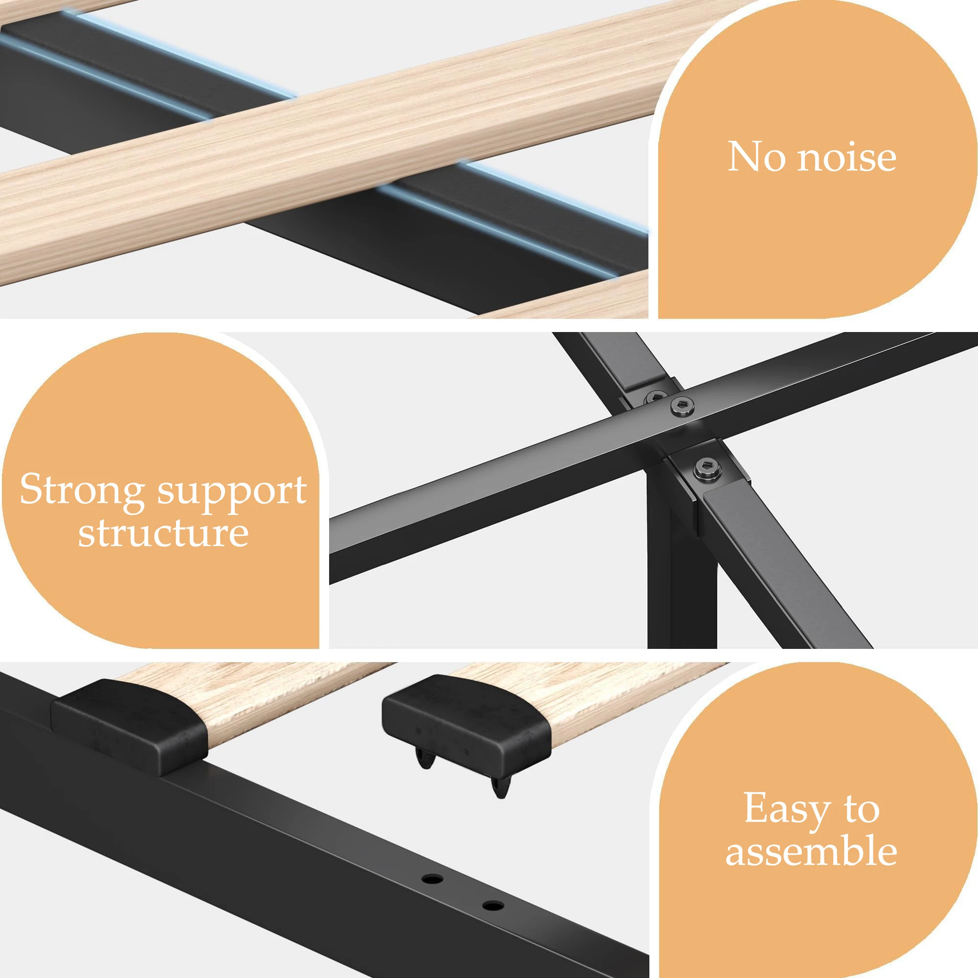 【STRONG SUPPORT SYSTEM】The bed frame is made of high quality IRON and the reinforced legs prevent the structure from twisting. Iron tubes with EVA anti-slip strips reduce noise and prolong use. High quality elasticated slats support the back and provide a good sleeping experience. With the recessed construction, the mattress can be securely placed inside the bed, and the two stopper bars at the head of the bed prevent the mattress from shifting.