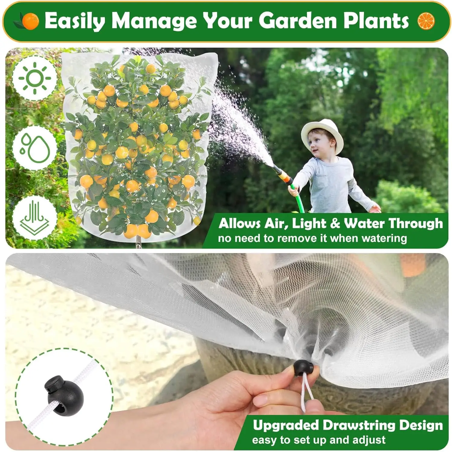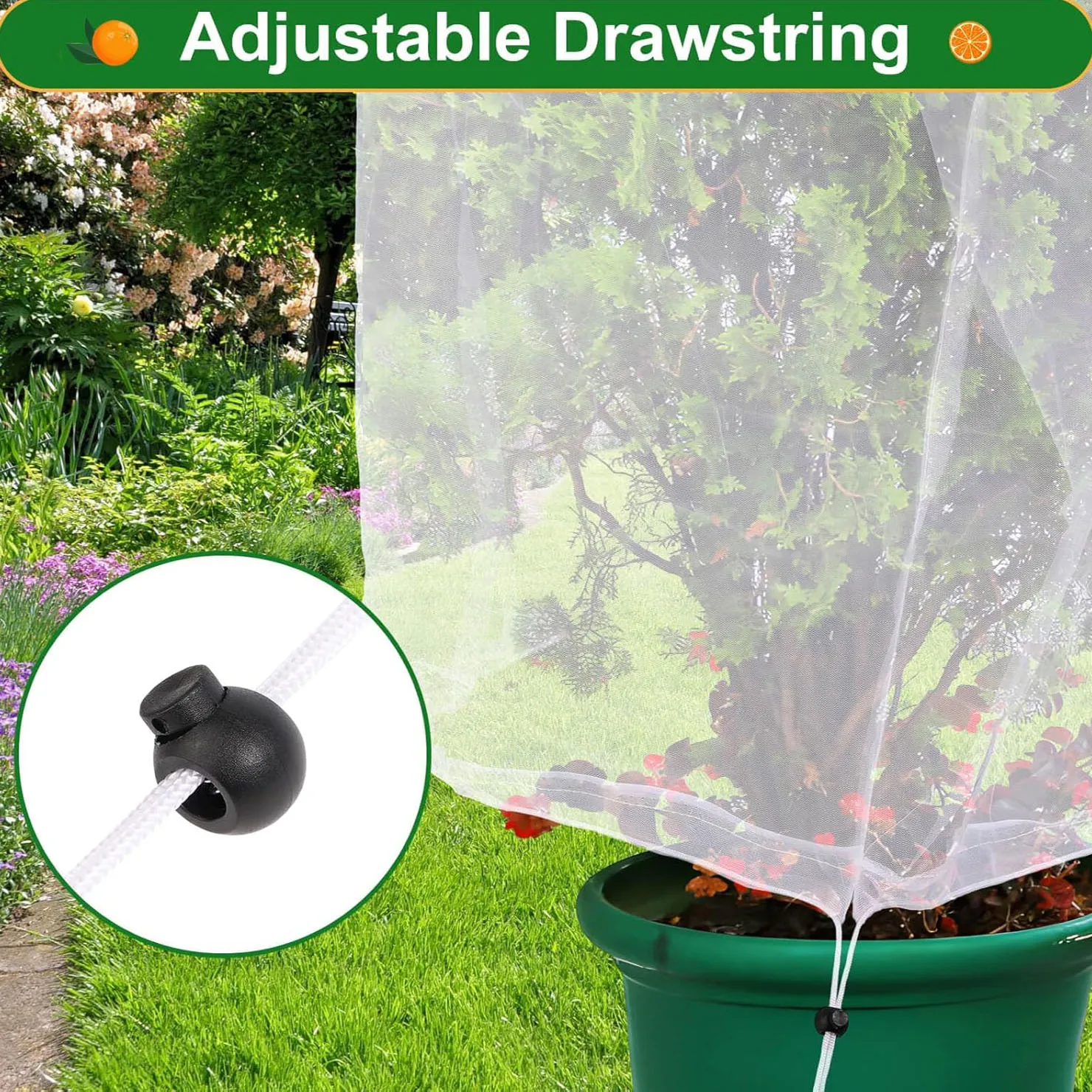 2.With easy installation, the garden net adopts pull-wire open design, which can cover the plants with a net and tighten the drawstring to effectively prevent wind, and it is suitable for most plants