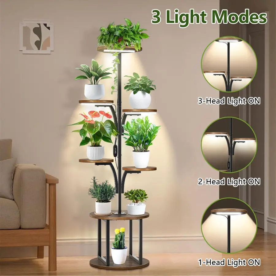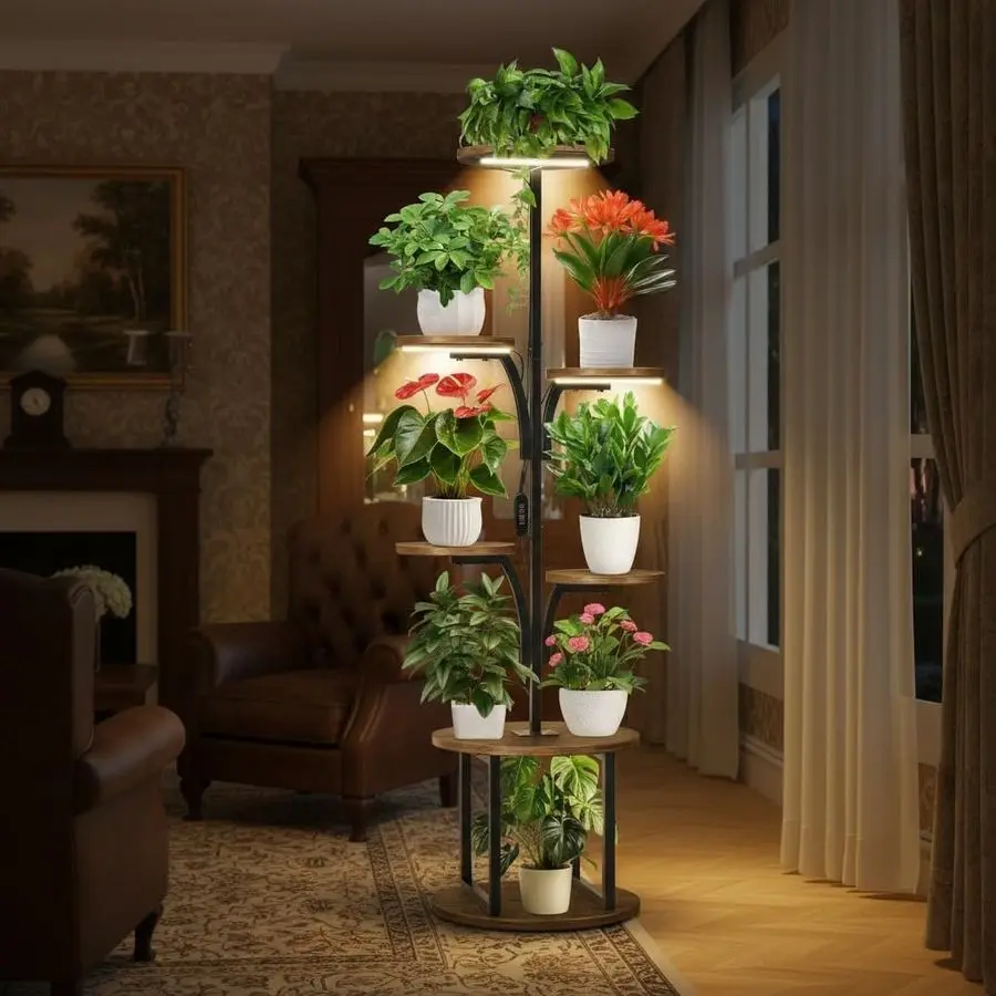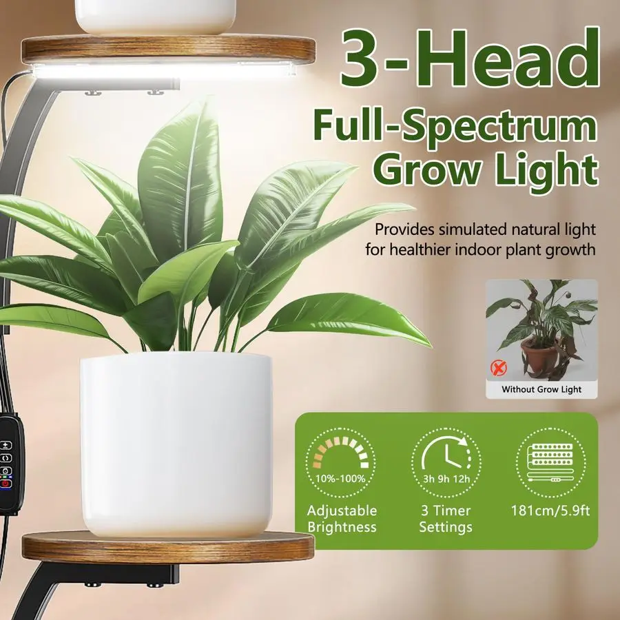 Advanced Full Spectrum LED Grow Light System This indoor plant stand features an integrated full spectrum LED grow light system with 3 professional grow lights offering 10 dimmable brightness levels and 3 9 12 hour automatic timer. The plant grow lights simulate natural sunlight spectrum, providing optimal photosynthesis conditions for seed starting, herb growing, and houseplant care throughout all seasons. Perfect for indoor gardening enthusiasts seeking professional plant growth results.