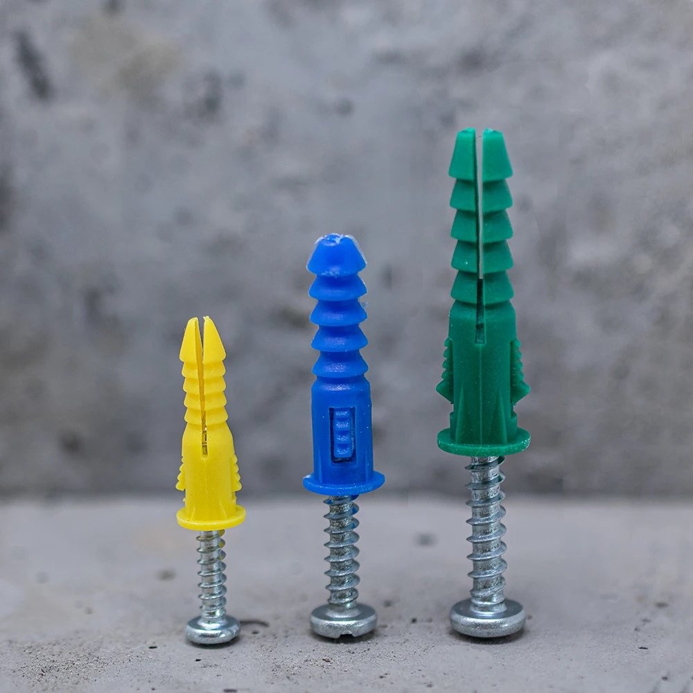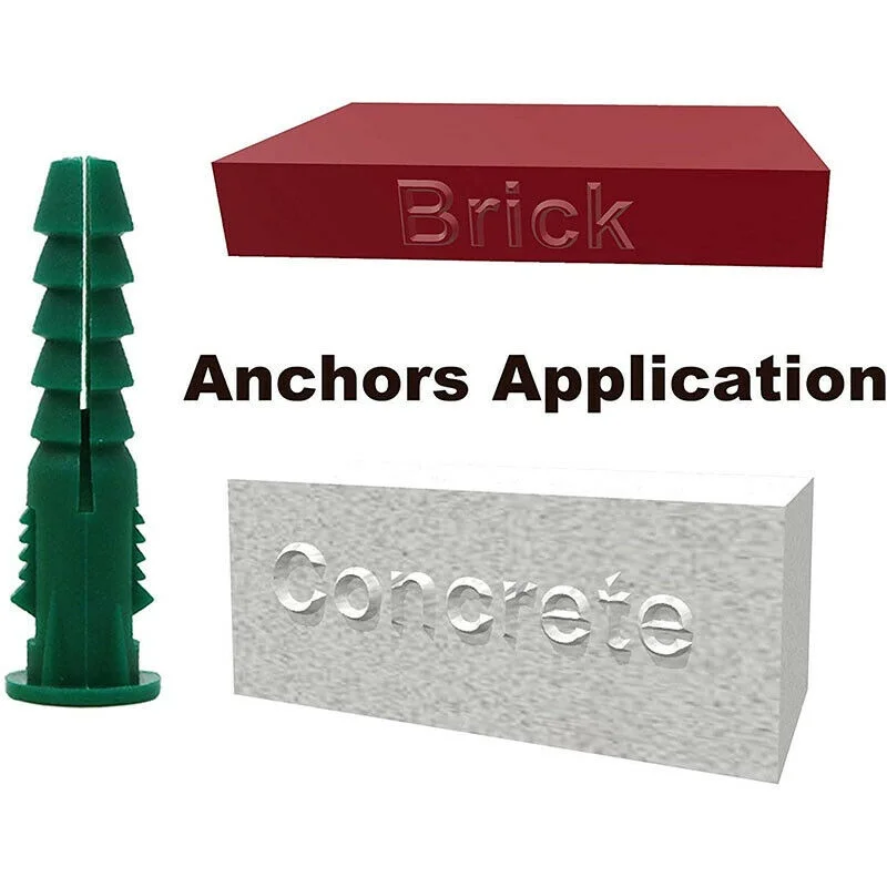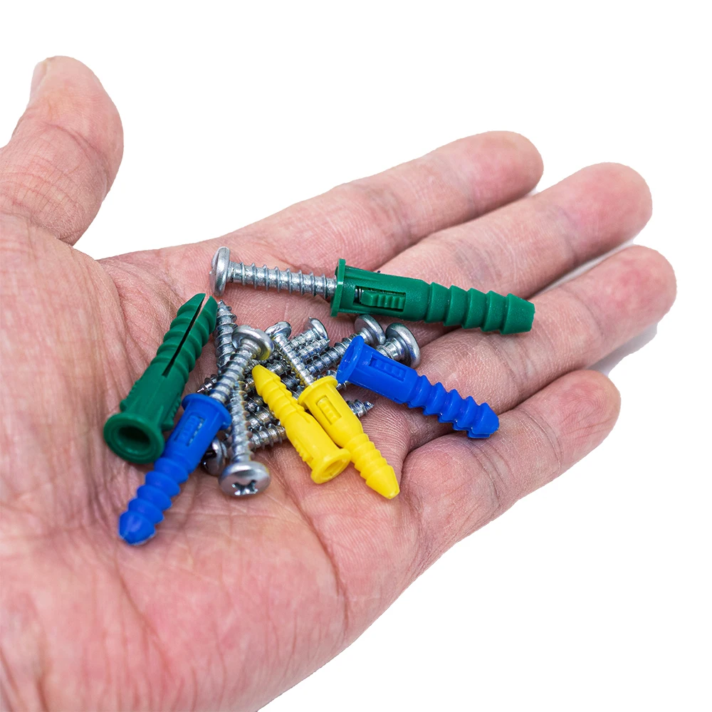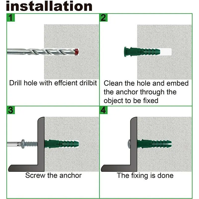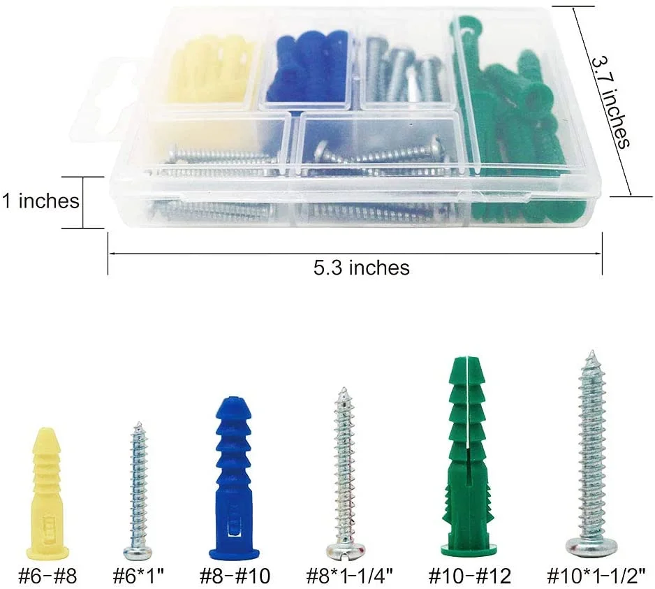Product description 1. Products include: Ribbed Anchors E6 15 Pcs Ribbed Anchors E7 10 Pcs Ribbed Anchors E8 8 Pcs Self-Tapping Screws #6*1 inch 15 Pcs Self-Tapping Screws #8*1-1/4 inch 10 Pcs Self-Tapping Screws #10*1-1/2 inch 8 Pcs 2. Usage method: a.Drill a hole to the recommended diameter and depth. Clean out the hole before hammer the anchor into the hole. b.Next, take your screw and begin driving it into the anchor, and thread it clockwise. 3. Scope of use: Full material. 4. Product advantages: Nylon anchor resistant to rust, corrosion resistance, ageing resistance, both light and tough.Can be remove easily. Product features A. The split in the ribbed anchors expand on two opposing sides as you tighten the screw,increased holding power B. Toggle bolt’s wings spreads the force over the bearing surface,comes attached to a screw,use in concrete,brick C. Once anchor installed,they provide a flush,clean appearance in drywall D. Kit Includes:E6,E7,E8 anchors, #6×1″,#8×1-1/4″,#10×1-1/2″pan head self-tapping screws(ANSI) ,and a plastic case E. Plastic(nylon) material anchors,no rust,corrosion resistance,anti-aging,good toughness and can be easily removed