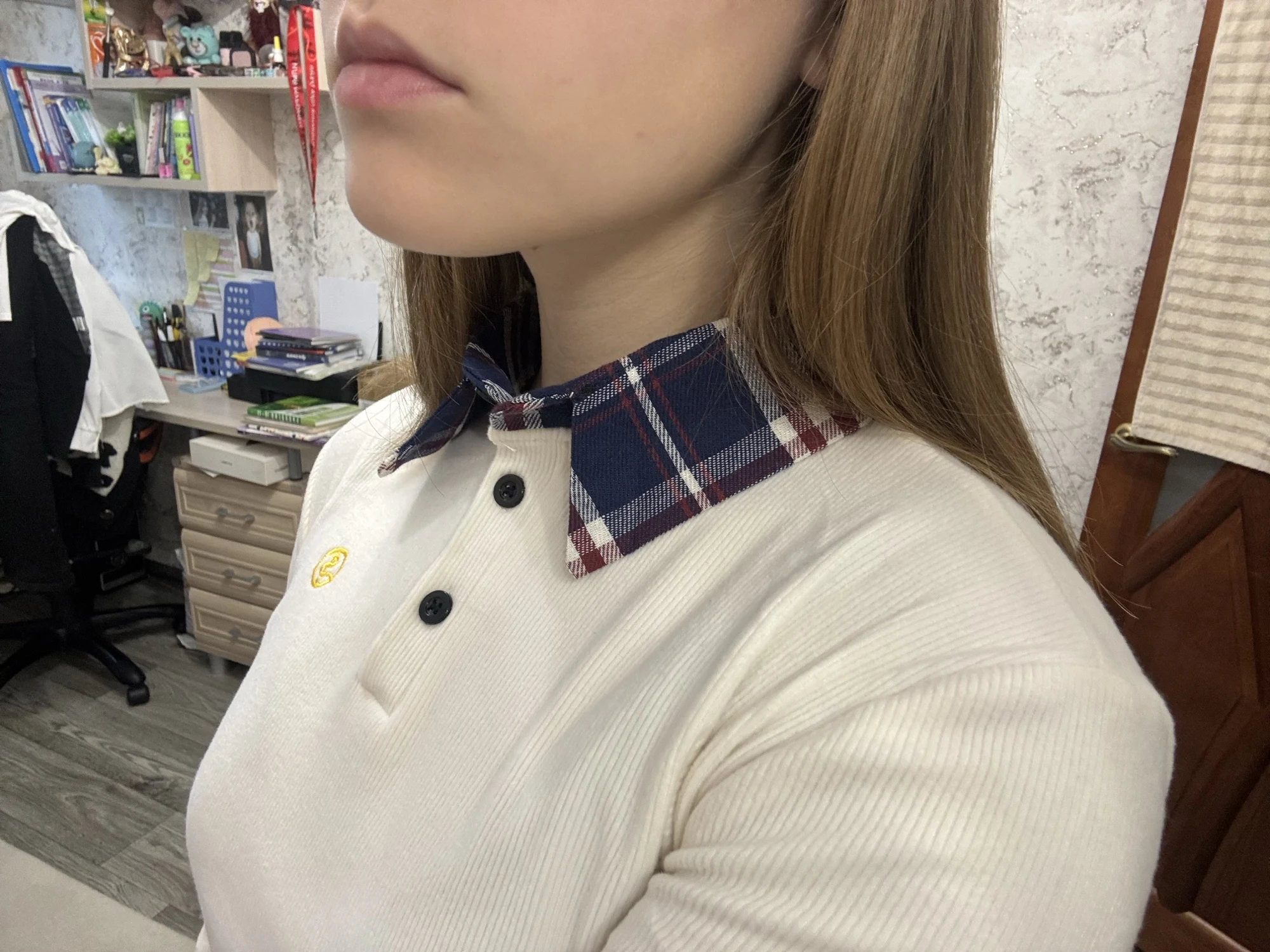 5 reviews for Preppy Polo Neck Plaid Long sleeve T shirt Women Fake Two-piece Basic Top V neck Button Blouses Tees Embroidery High-quality
