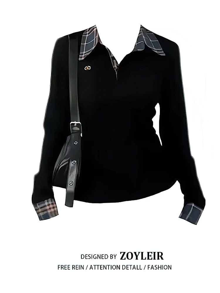 Preppy Polo Neck Plaid Long sleeve T shirt Women Fake Two-piece Basic Top V neck Button Blouses Tees Embroidery High-quality
