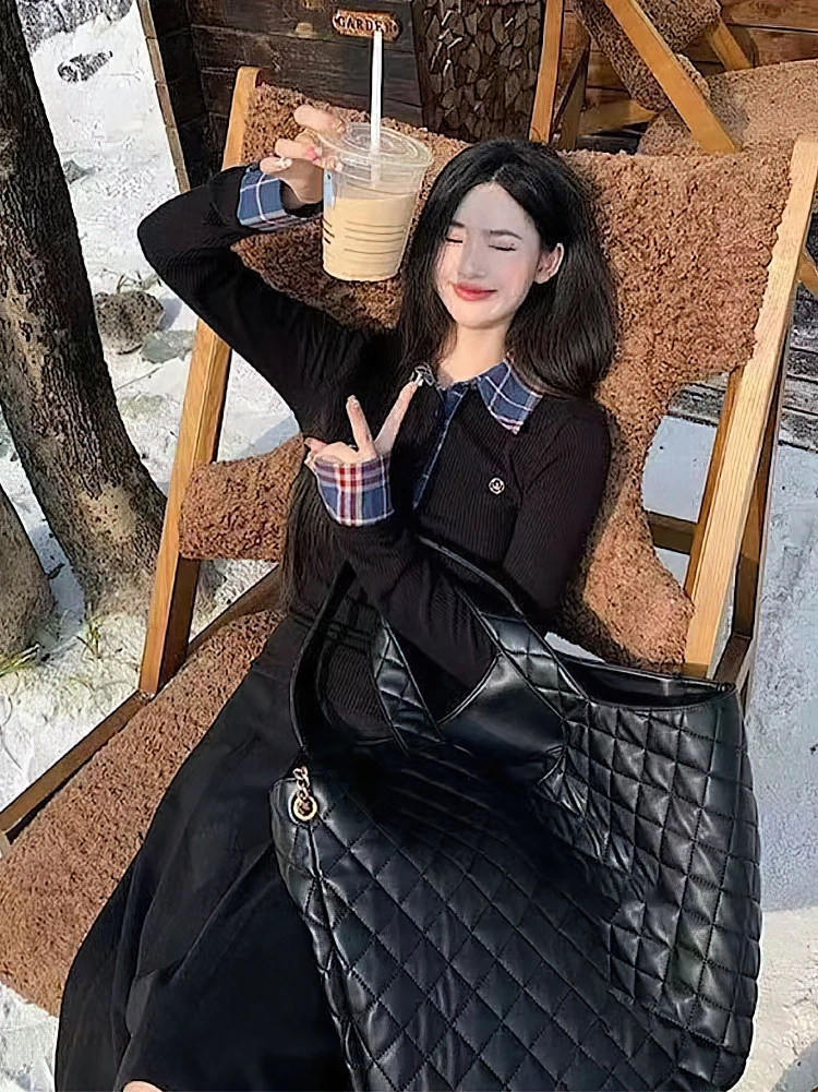 Preppy Polo Neck Plaid Long sleeve T shirt Women Fake Two-piece Basic Top V neck Button Blouses Tees Embroidery High-quality photo review