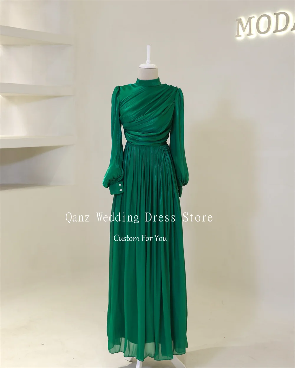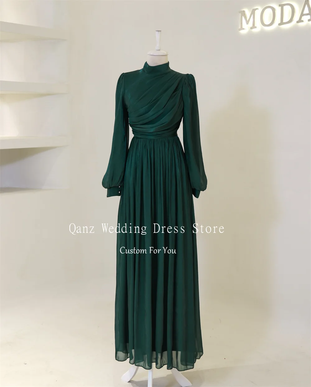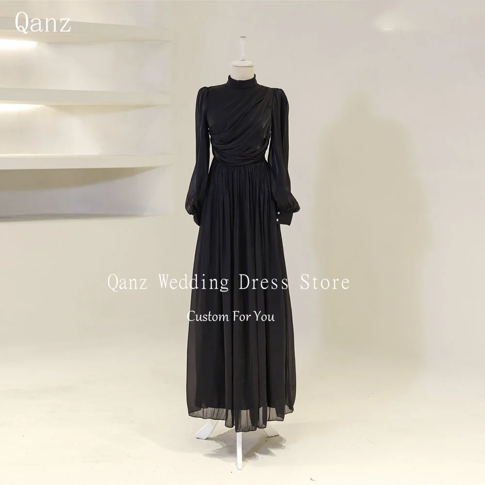 Qanz Modern Black Evening Dresses High Neck Chiffon Long Prom Dress Full Sleeves Pleat Vestidos Para Fiesta De Lujo Customized