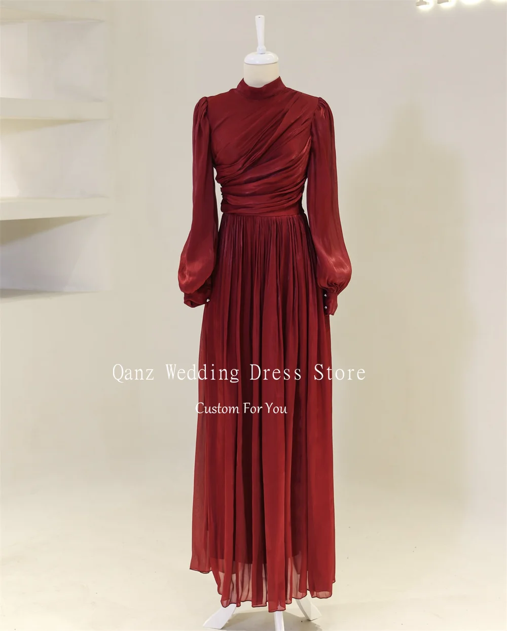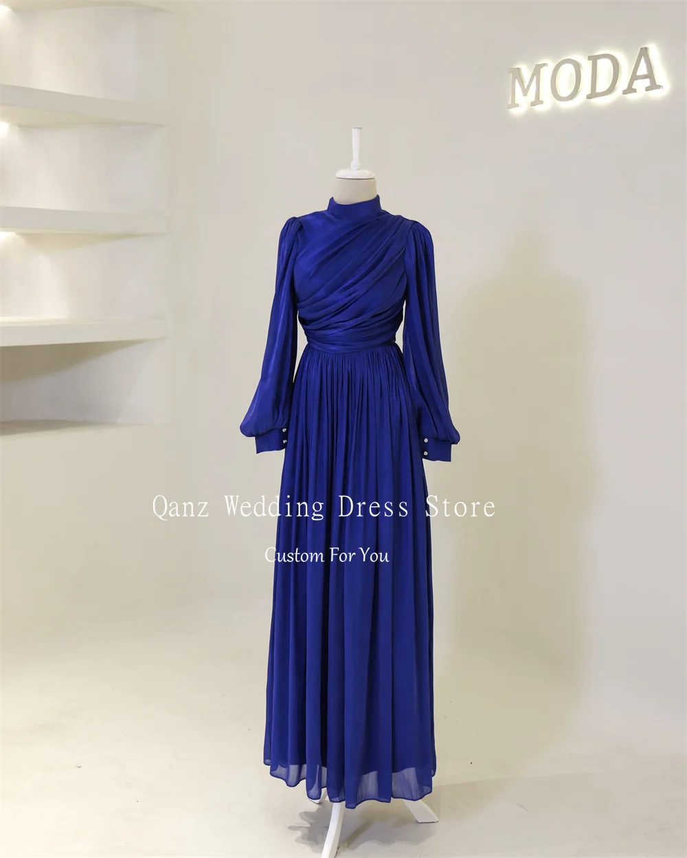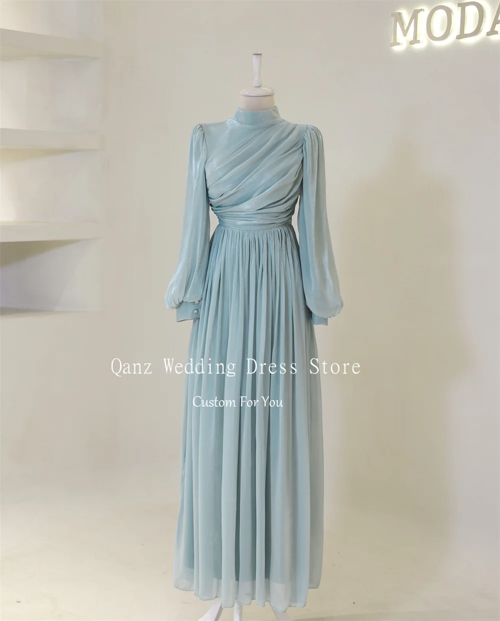 Qanz Modern Black Evening Dresses High Neck Chiffon Long Prom Dress Full Sleeves Pleat Vestidos Para Fiesta De Lujo Customized
